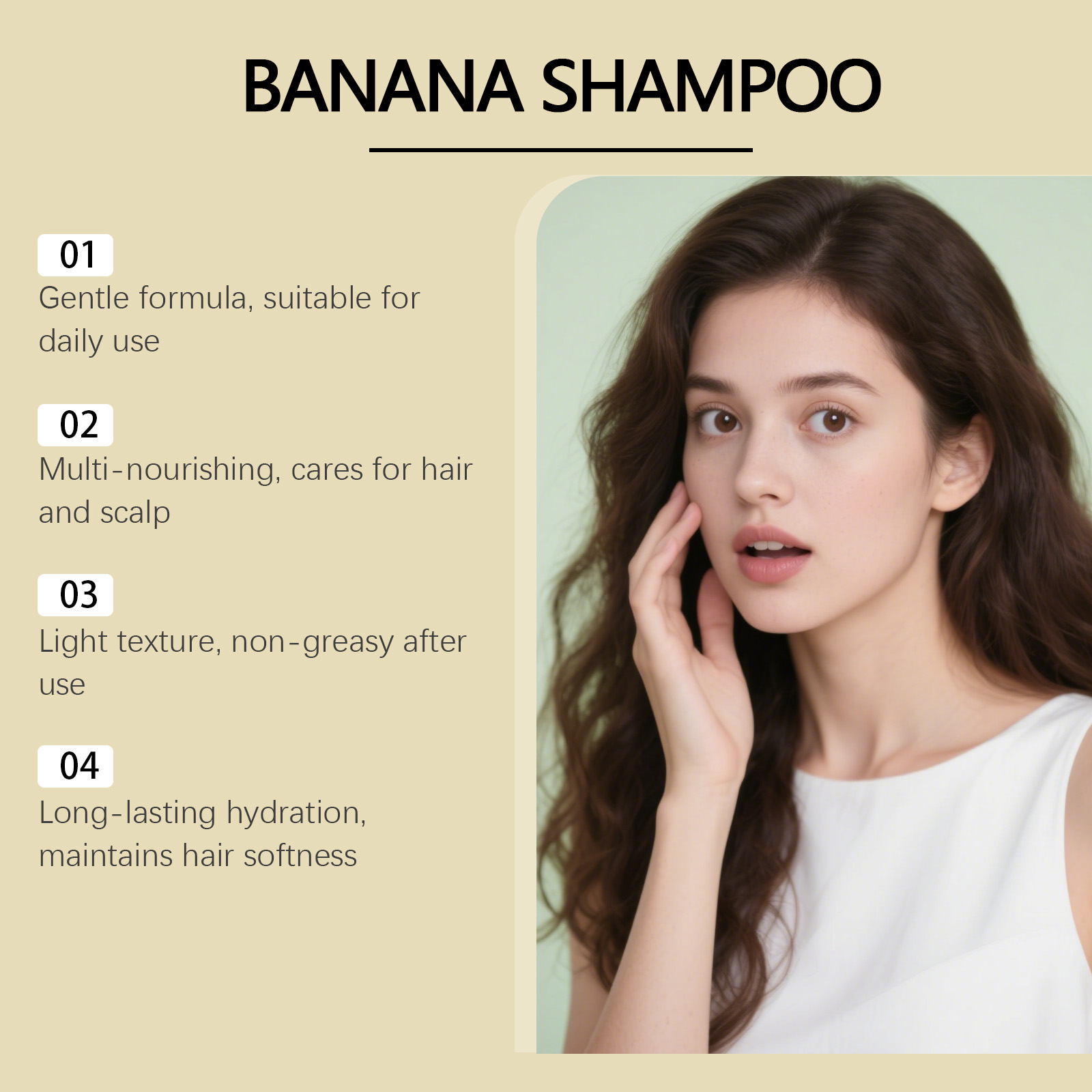 我们的香蕉精华洗发水,由刺阿干树仁油、牛油果树果脂精心调配而成。专为消除毛躁,使头发感觉顺滑设计。使用方法极为便捷:1.用清水彻底湿润头皮和头发。2.取适量本品于手心,揉搓起泡后涂抹于头皮和头发上,并按摩3-5分钟。3.用清水冲洗干净。并且可以减少打结,使日常造型更轻松。