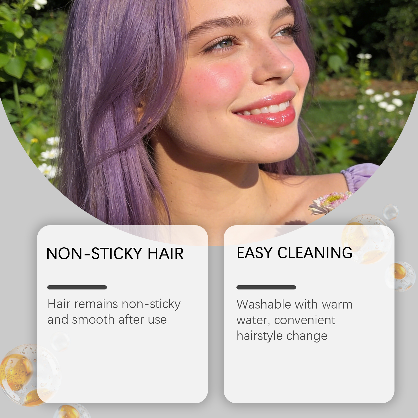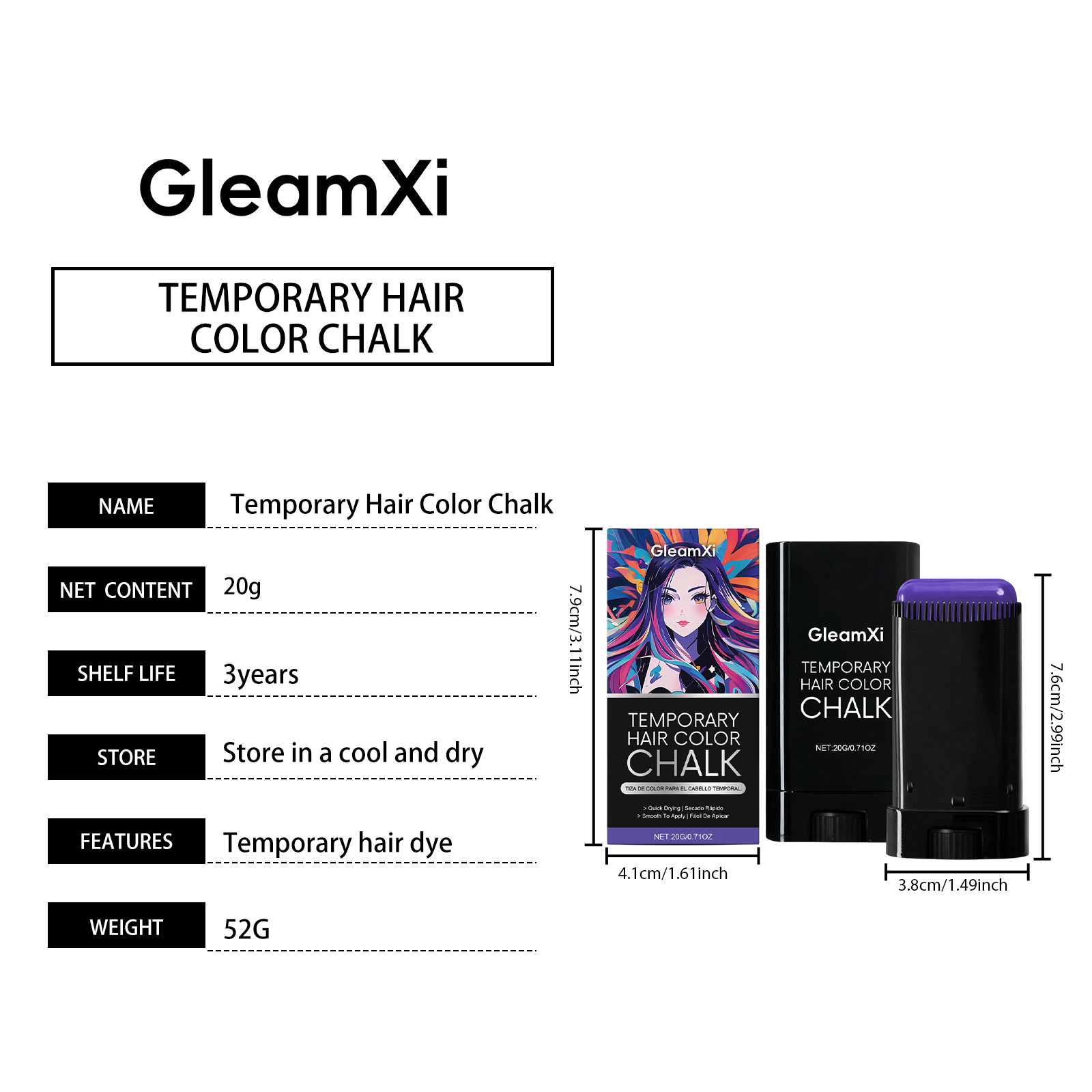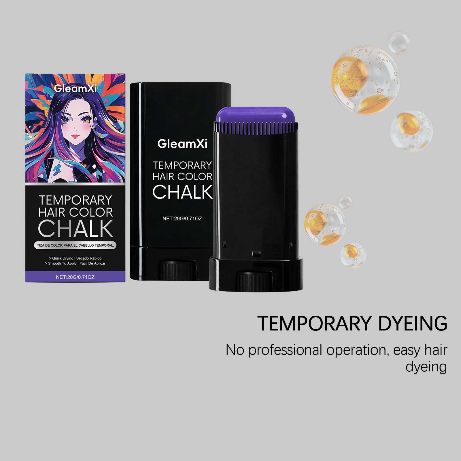 我们的临时染发棒(紫色),由1,2 - 己二醇、生育酚(维生素 E)精心调配而成。专为滋养头发并改善发质设计。使用方法极为便捷:1.清洁头发并保持干燥。2.旋转底部旋钮,以获取适量膏体,并均匀涂抹于头发及发根,直至覆盖全部头发生长区域。3.不使用时只需用水冲洗即可。并且非常方便更换发型。