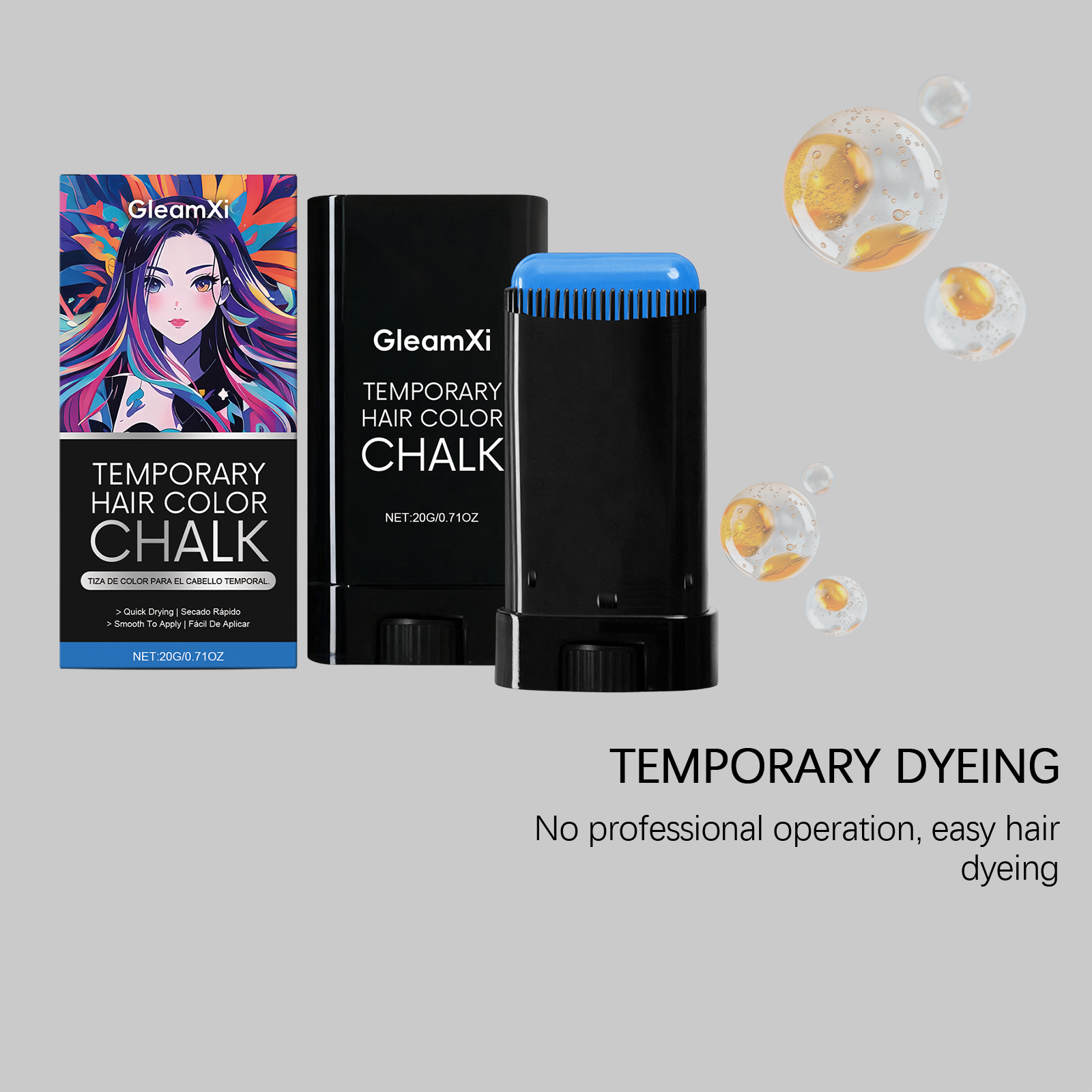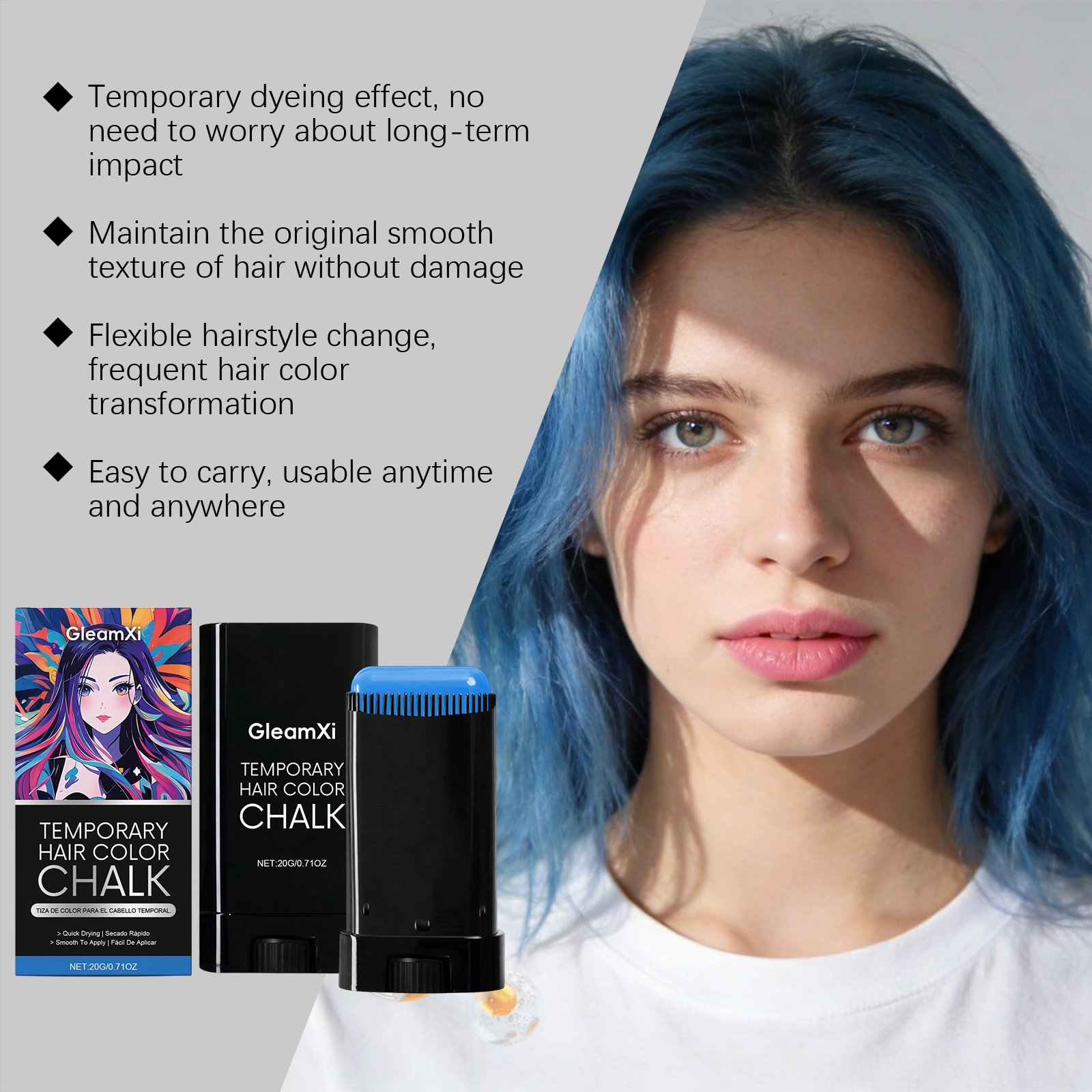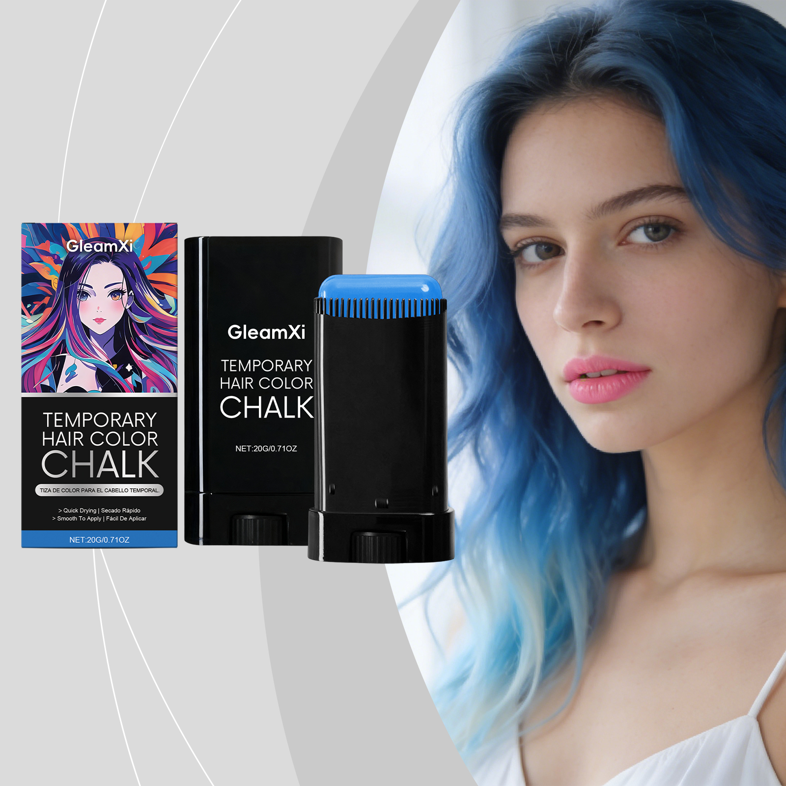 我们的临时染发棒(蓝色),由1,2 - 己二醇、生育酚(维生素 E)精心调配而成。专为滋养头发并改善发质设计。使用方法极为便捷:1.清洁头发并保持干燥。2.旋转底部旋钮,以获取适量膏体,并均匀涂抹于头发及发根,直至覆盖全部头发生长区域。3.不使用时只需用水冲洗即可。并且非常方便更换发型。