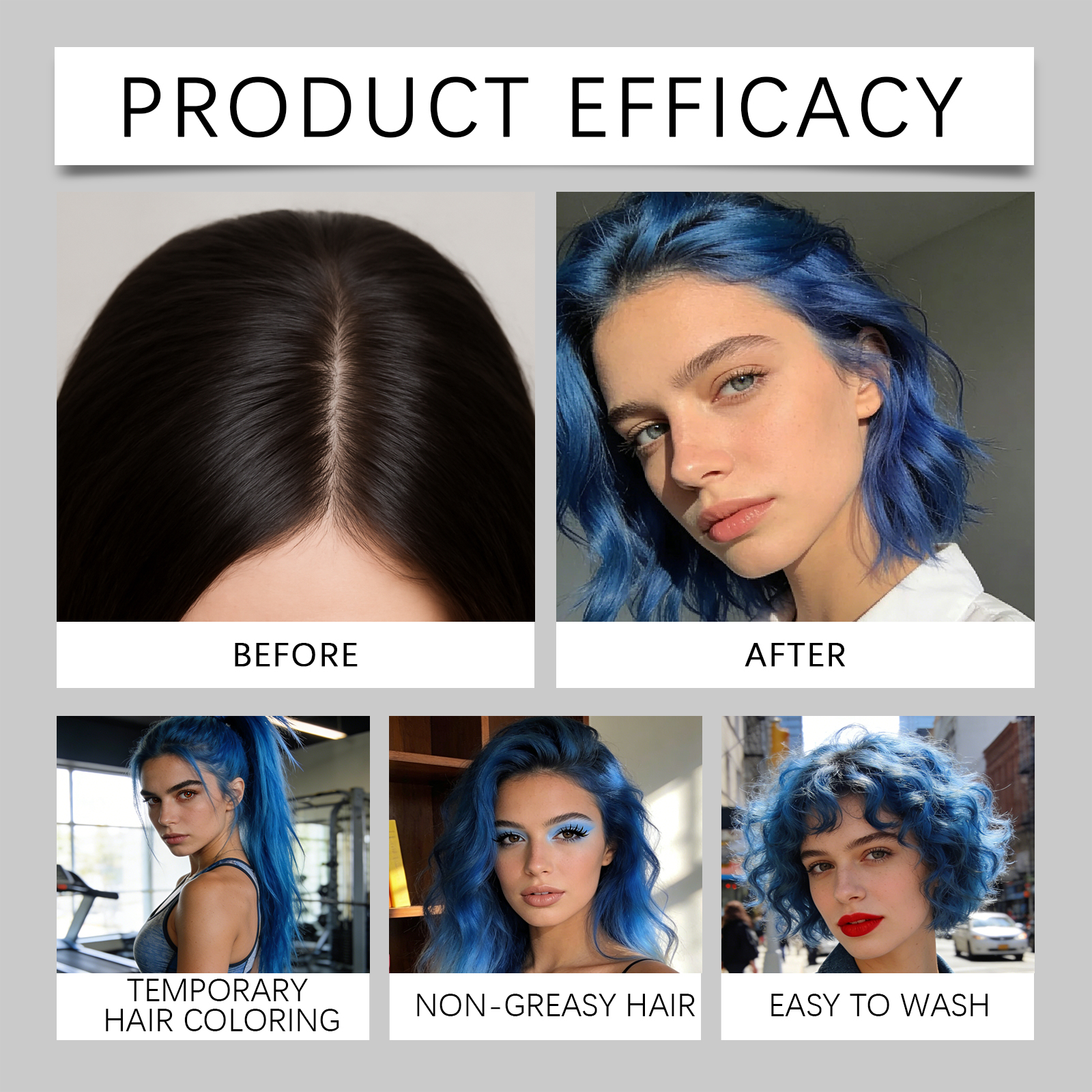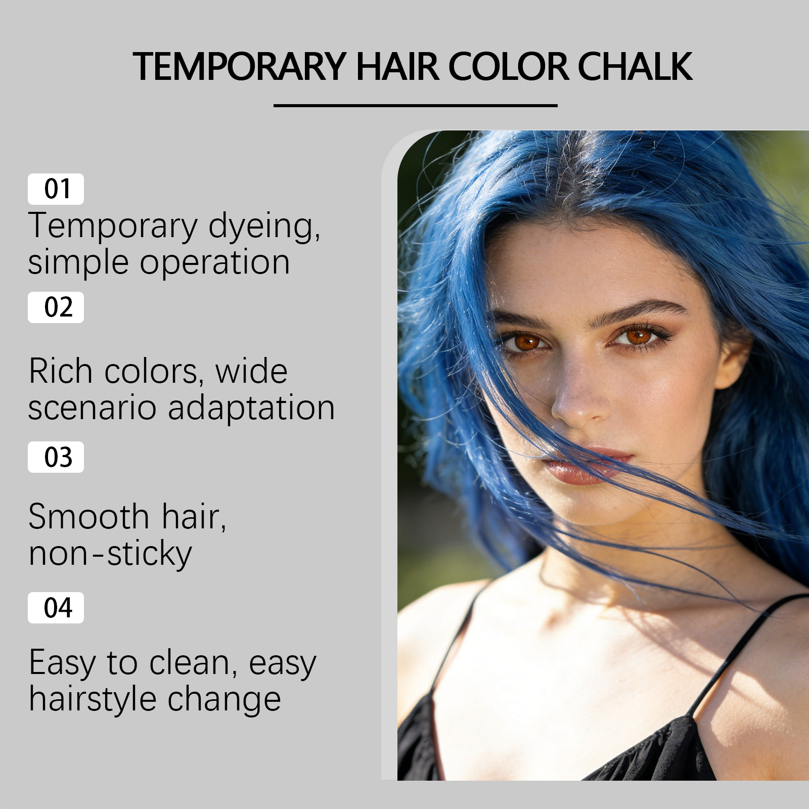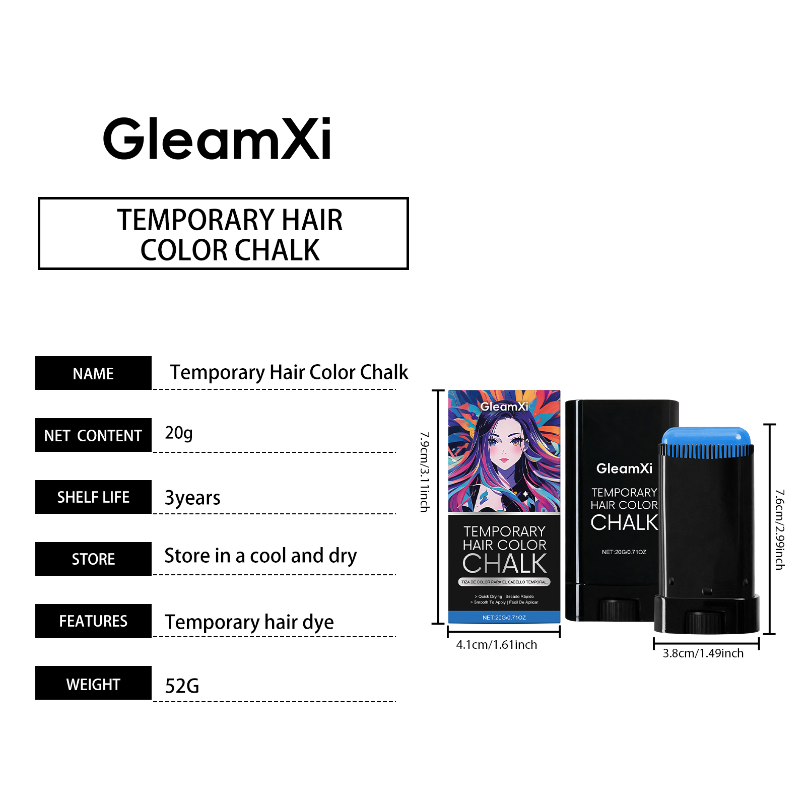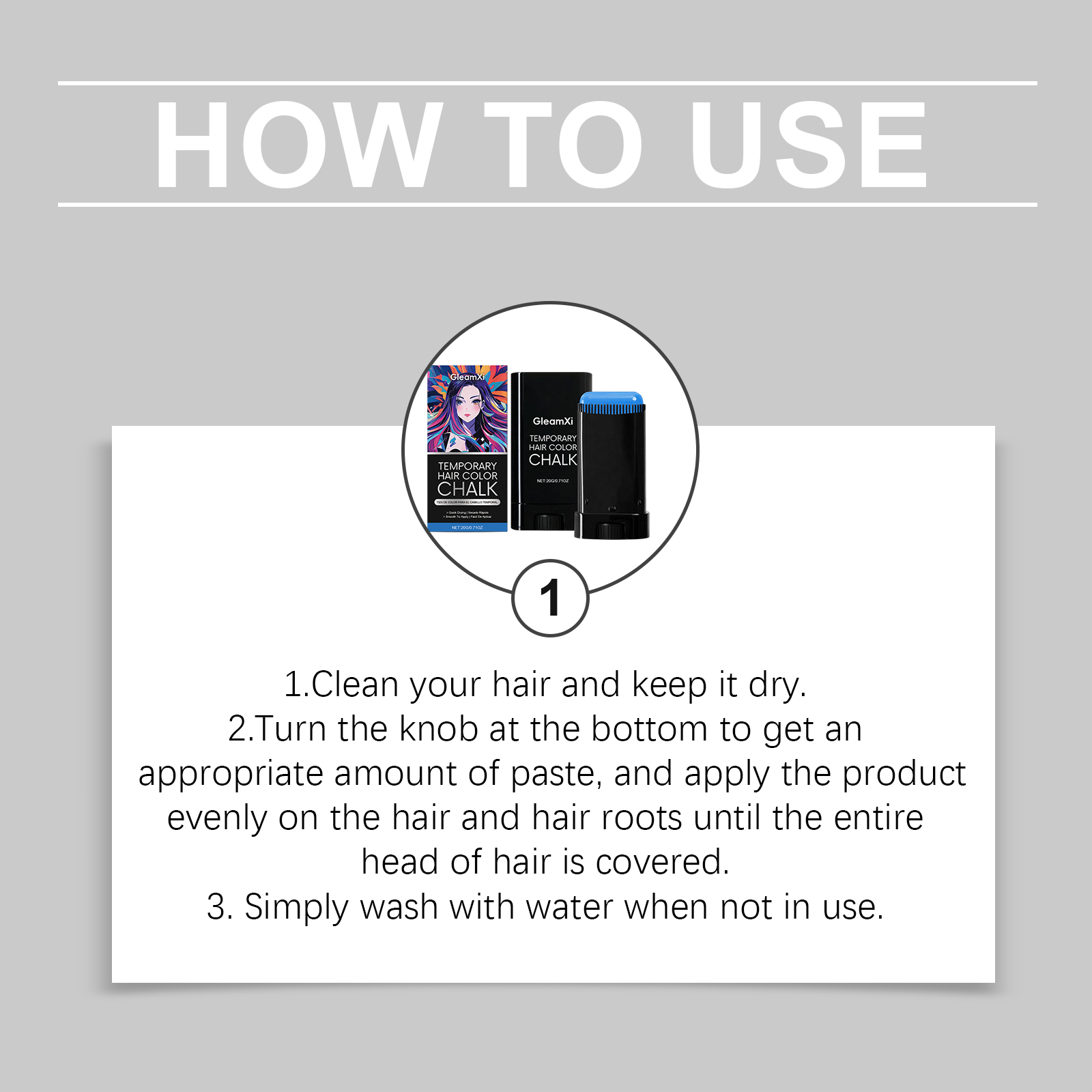 我们的临时染发棒(蓝色),由1,2 - 己二醇、生育酚(维生素 E)精心调配而成。专为滋养头发并改善发质设计。使用方法极为便捷:1.清洁头发并保持干燥。2.旋转底部旋钮,以获取适量膏体,并均匀涂抹于头发及发根,直至覆盖全部头发生长区域。3.不使用时只需用水冲洗即可。并且非常方便更换发型。