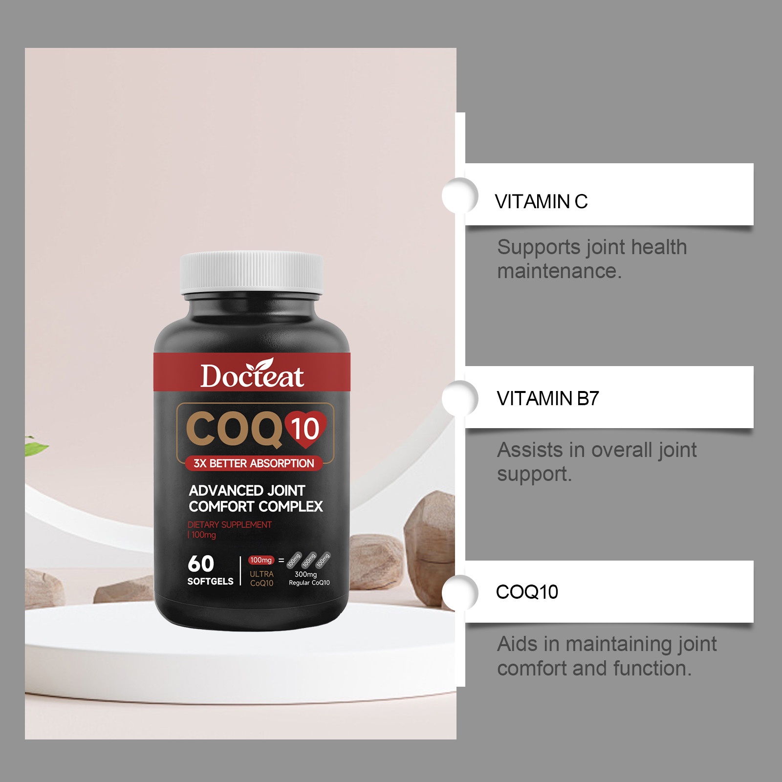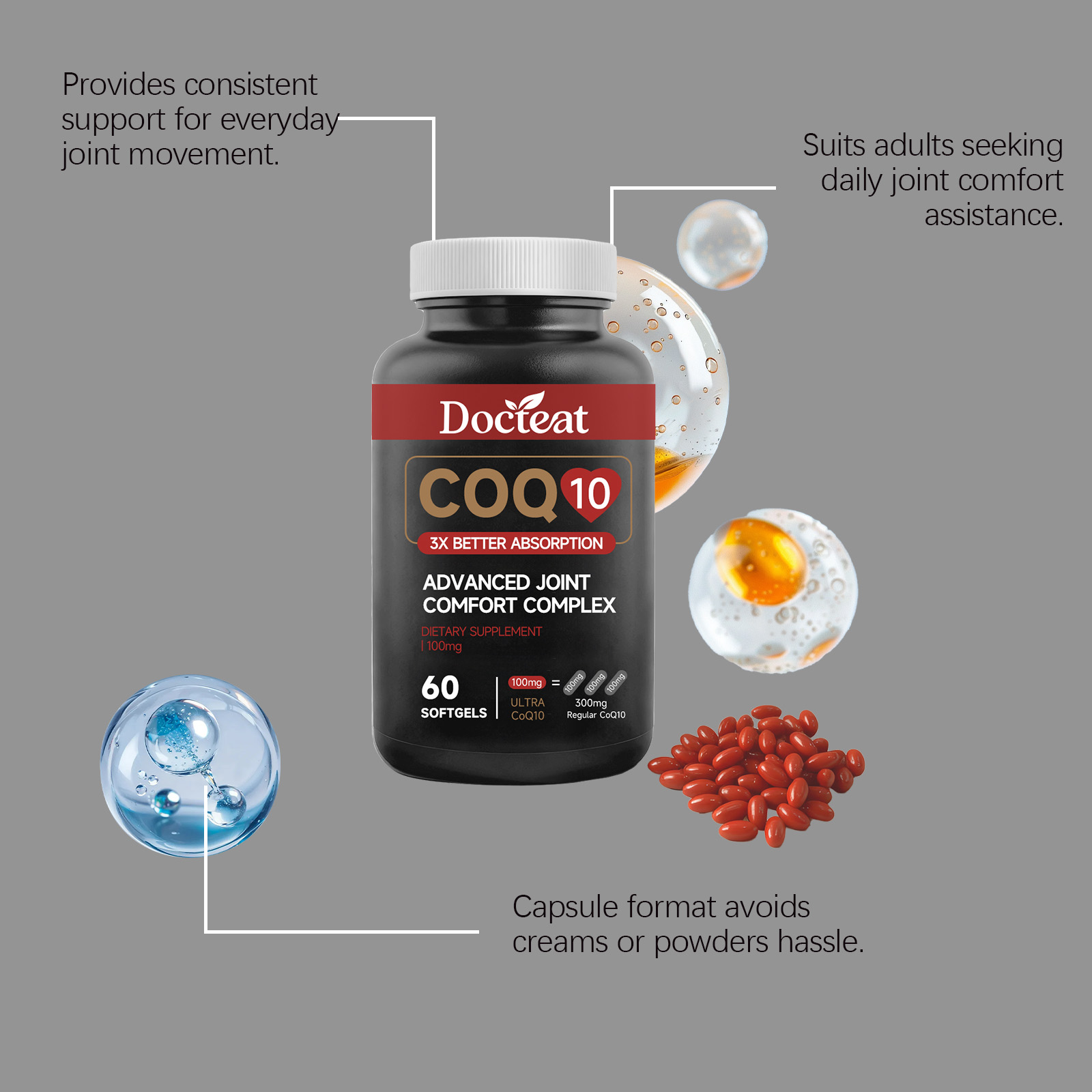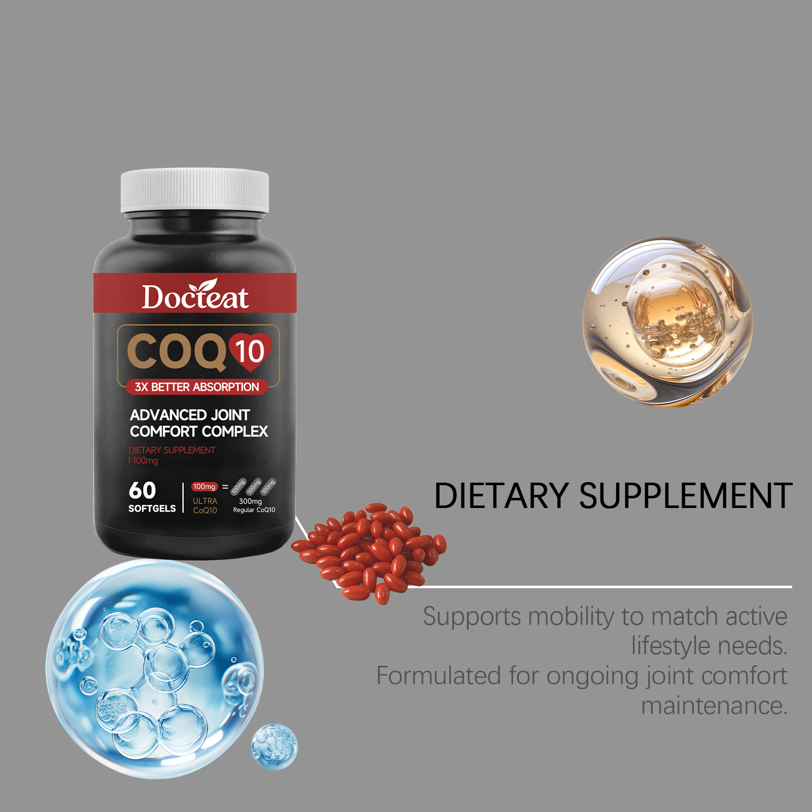 Docteat Coenzyme Q10 Soft Capsules, With A Mild Formula, Are A Daily Dietary Supplement For Joint Comfort And Vitality Enhancement