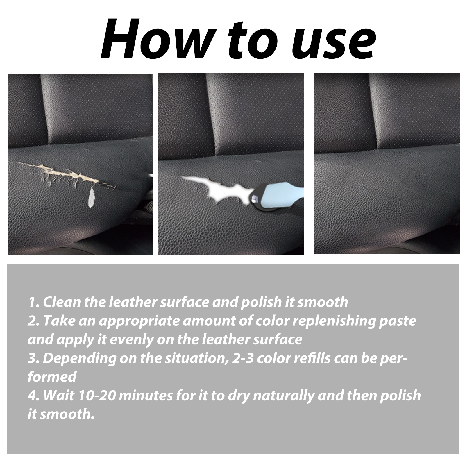 我们的皮革染色膏含有聚氨酯树脂、松香、椰子油、蜂蜡。它可以改变皮革的颜色,恢复皮革的光泽。它的使用方法很简单:清洁皮革表面并将其打磨光滑,取适量补色膏均匀涂抹于皮革表面,根据不同的情况,可以执行2-3种颜色填充,等待10-20分钟,让它自然干透,然后把它打磨光滑。并且可以翻新汽车座椅皮革沙发。