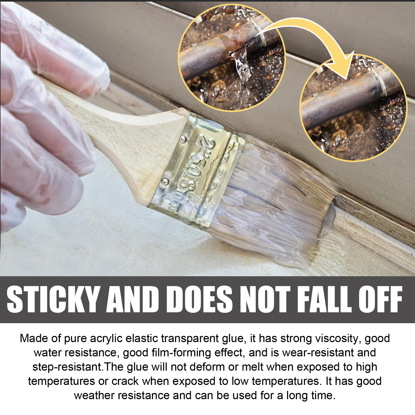 我们的补漏防水胶含有乙酸乙烯酯共聚物、聚乙烯醇。它可以在高温下不变形、不熔化,在低温下不开裂,具有良好的耐候性,可解决屋顶、外墙、窗台、浴室、地下室、排水沟、护墙等漏水修补问题。它的使用方法很简单:对裂缝的内外进行清洁和干燥,取适量胶水均匀涂抹在裂缝处,约12小时后,第二次均匀涂抹。并且可以防漏。