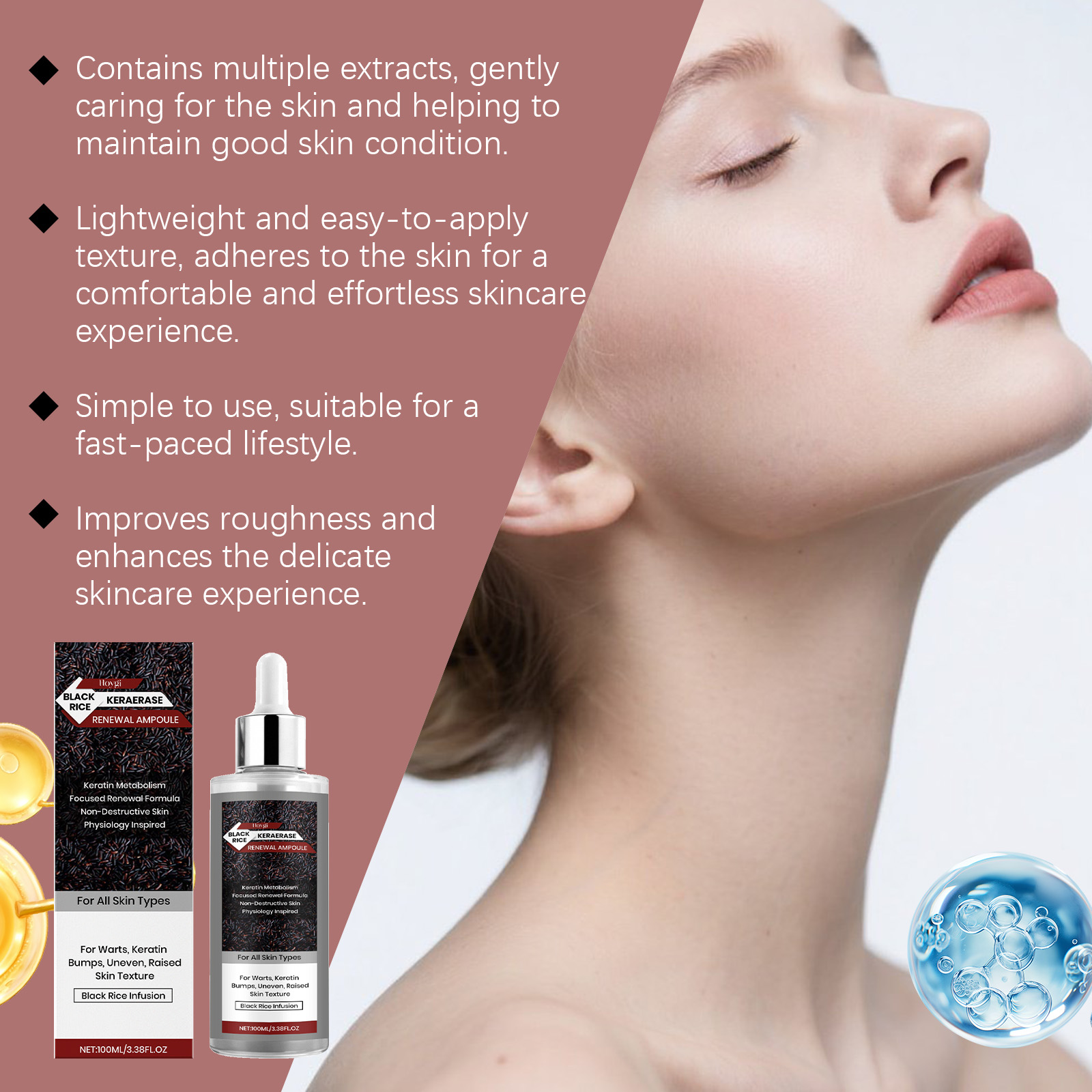 我们的黑米精华液,由水解米糠提取物、角蛋白精心调配而成。专为改善暗沉,提升光泽设计。使用方法极为便捷:1.清洁面部并擦干。2.将适量本品均匀涂抹于面部。3.轻轻打圈按摩,帮助软化角质层。4.一段时间后,用温水冲洗。并且它吸收迅速,没有粘腻感。