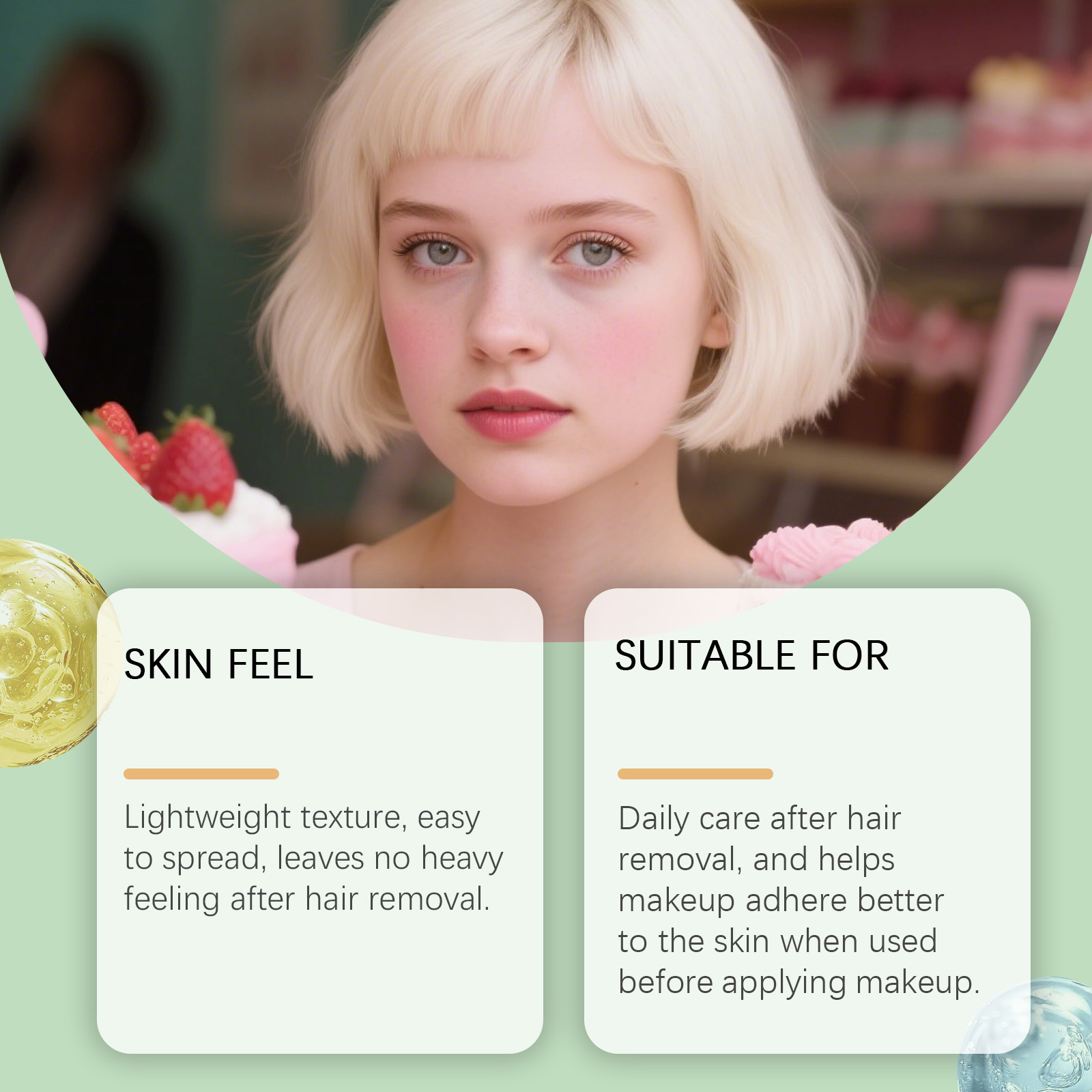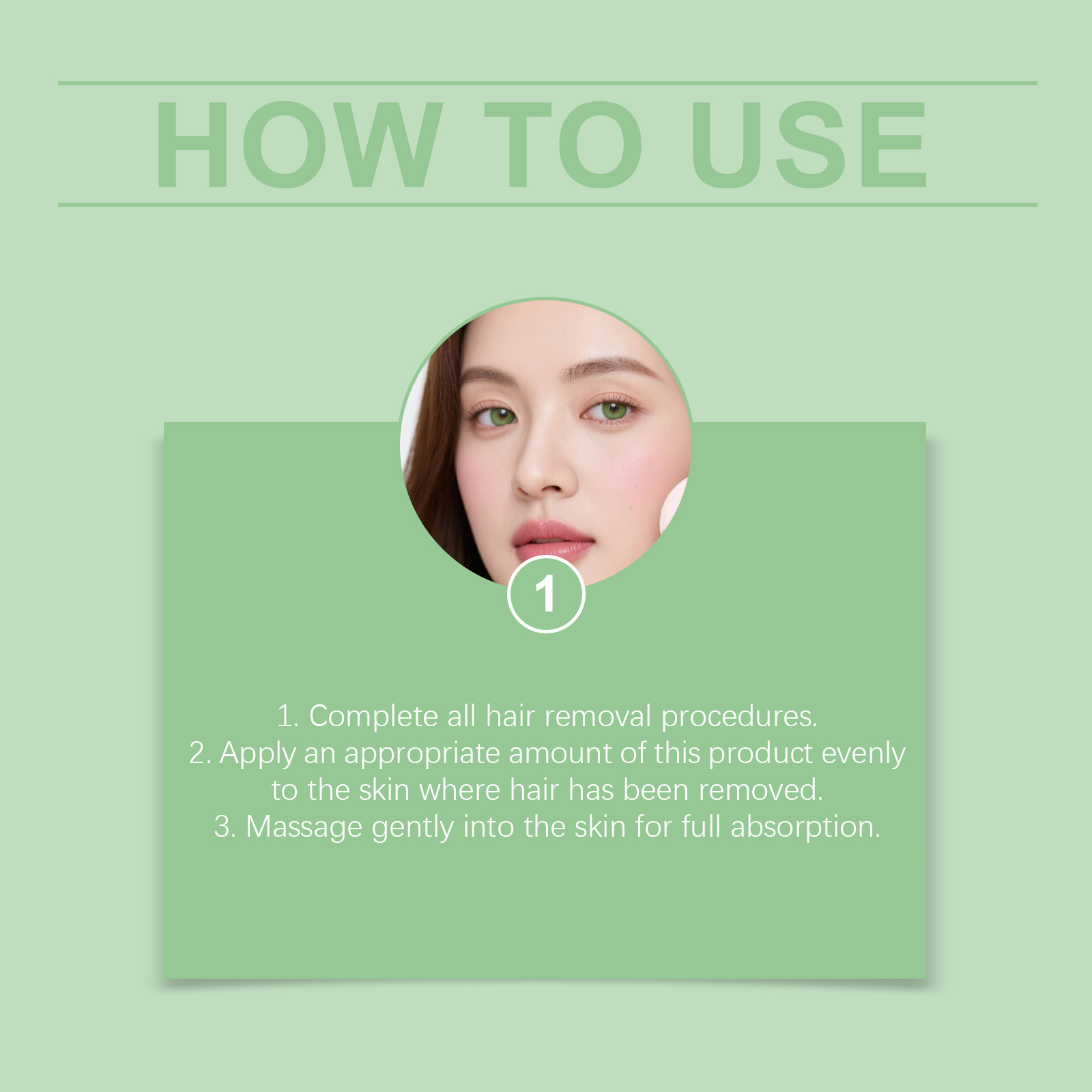 我们的剃须后精华液,由精氨酸、香附子根提取物精心调配而成。专为脱毛后软化并舒缓皮肤设计。使用方法极为便捷:1.完成所有脱毛程序。2.将适量本产品均匀涂抹于已脱毛的皮肤上。3.轻柔按摩至皮肤,以促进完全吸收。并且适用于各种肤质,也适合在季节变化期间脱毛后使用。