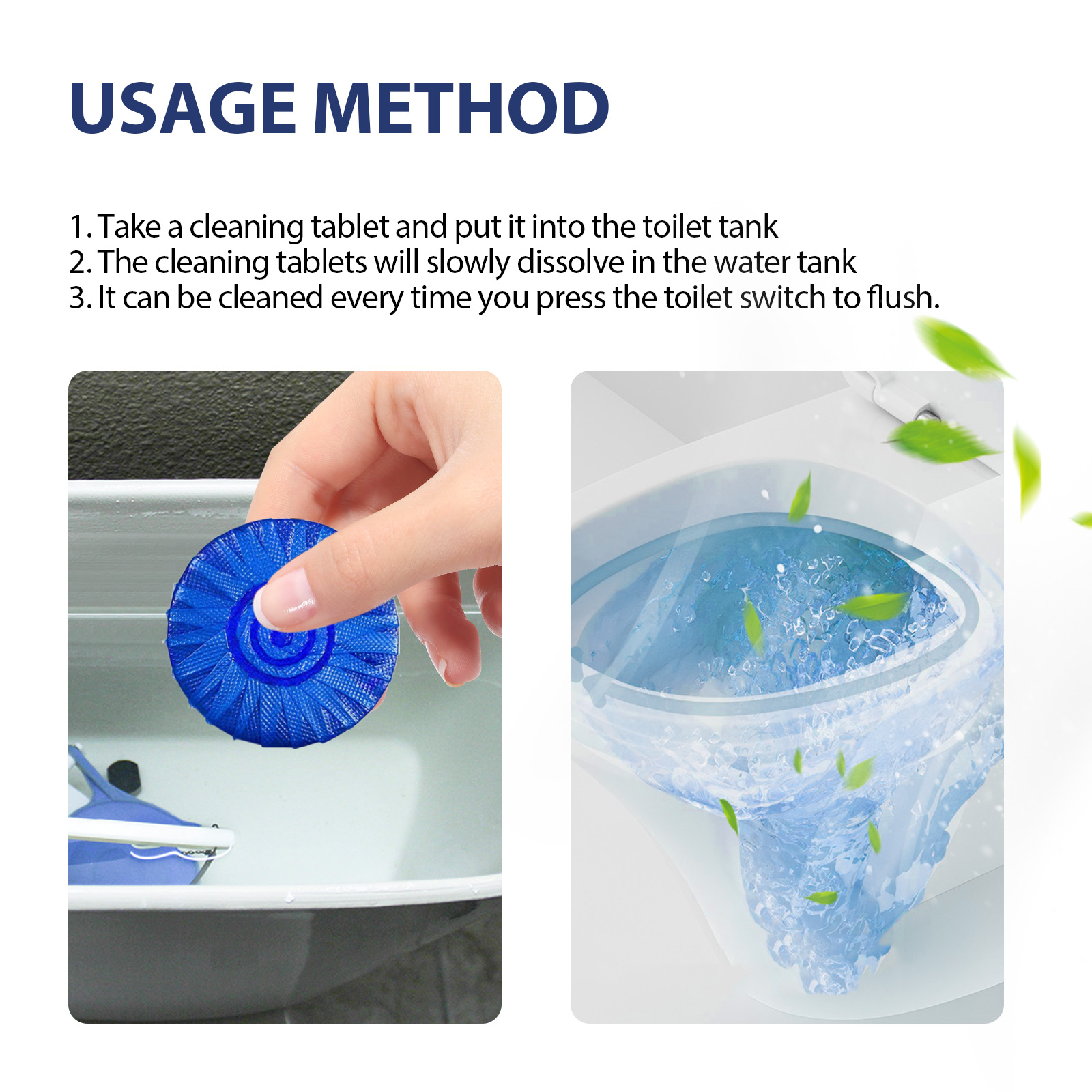 我们的马桶清洁片含有十二烷基苯磺酸钠、EDTA 二钠、铝粉。它可以清洁厕所,使水更清澈,更干净,有效清洁马桶、水箱、水管等顽固污渍,让你享受干净清新的厕所。它的使用方法很简单:拿一片清洁药片,把它放进马桶水箱里,清洗剂会在水箱中慢慢溶解,每次按下马桶开关冲水即可清洗。并且可以清洁马桶。