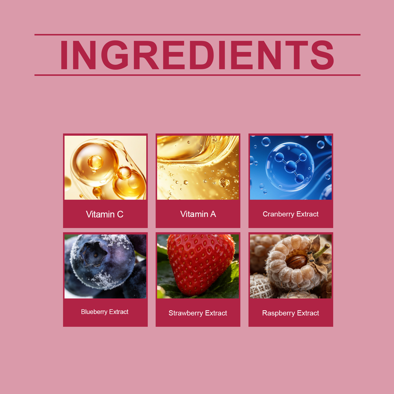 我们的浆果味美容护理软糖,由维生素C、维生素A精心调配而成。专为增强日常光彩感,提供每日相关的补充设计。使用方法极为便捷:服用2粒,每天一次,咀嚼软糖。并且它可以温和调节日常状态。