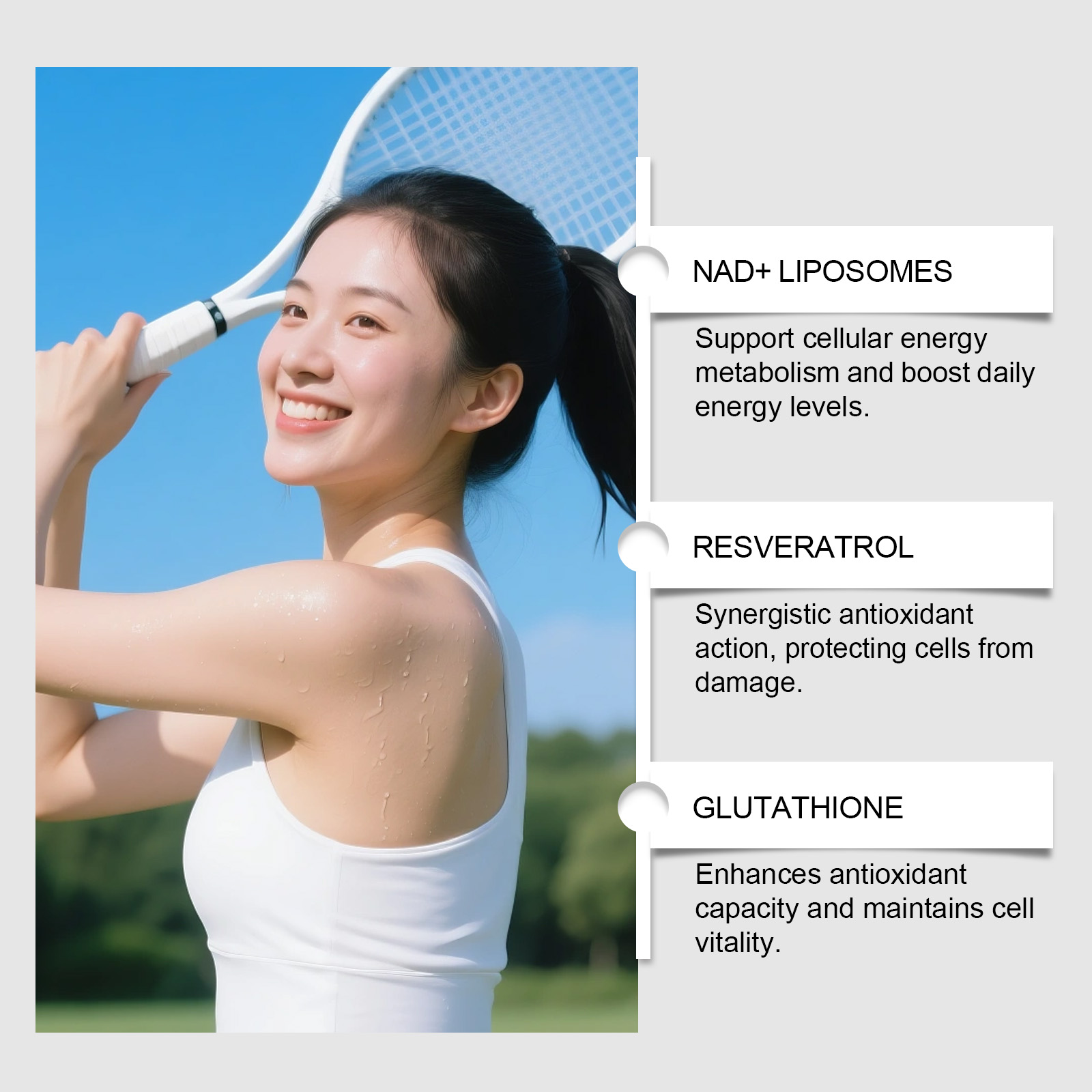 我们的脂质体膳食补充剂,由脂质体烟酰胺腺嘌呤二核苷酸、白藜芦醇精心调配而成。专为支持细胞能量代谢并提升日常能量水平设计。使用方法极为便捷:每天随餐服用2粒胶囊,并用水送服。并且它可以促进细胞健康并提升能量。