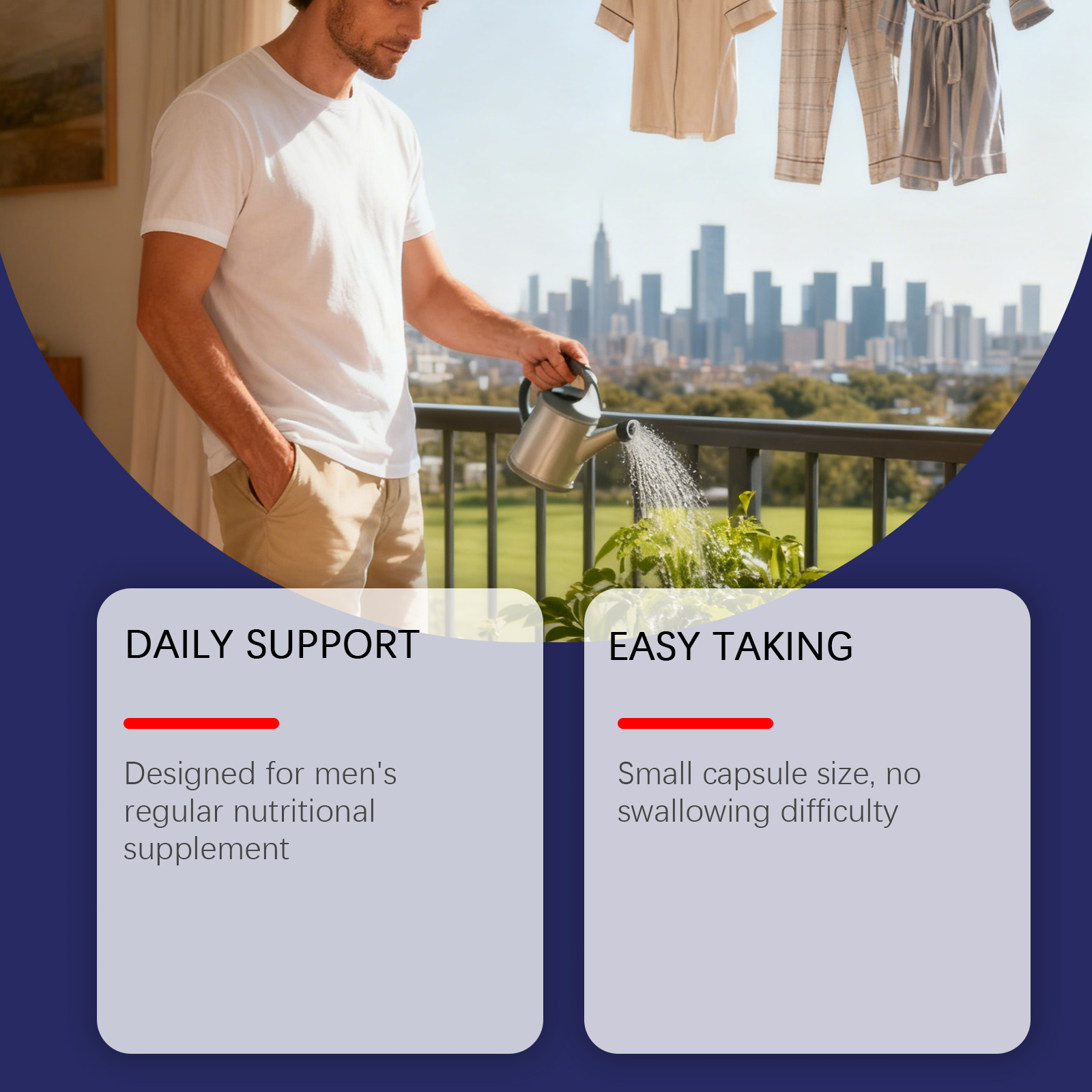 我们的男士日常营养复合胶囊,由β-谷甾醇、番茄红素精心调配而成。专为男性日常营养补充设计,小胶囊尺寸,无吞咽困难。使用方法极为便捷:每日服用两粒,吞服即可。并且它可以持续提供营养益处。