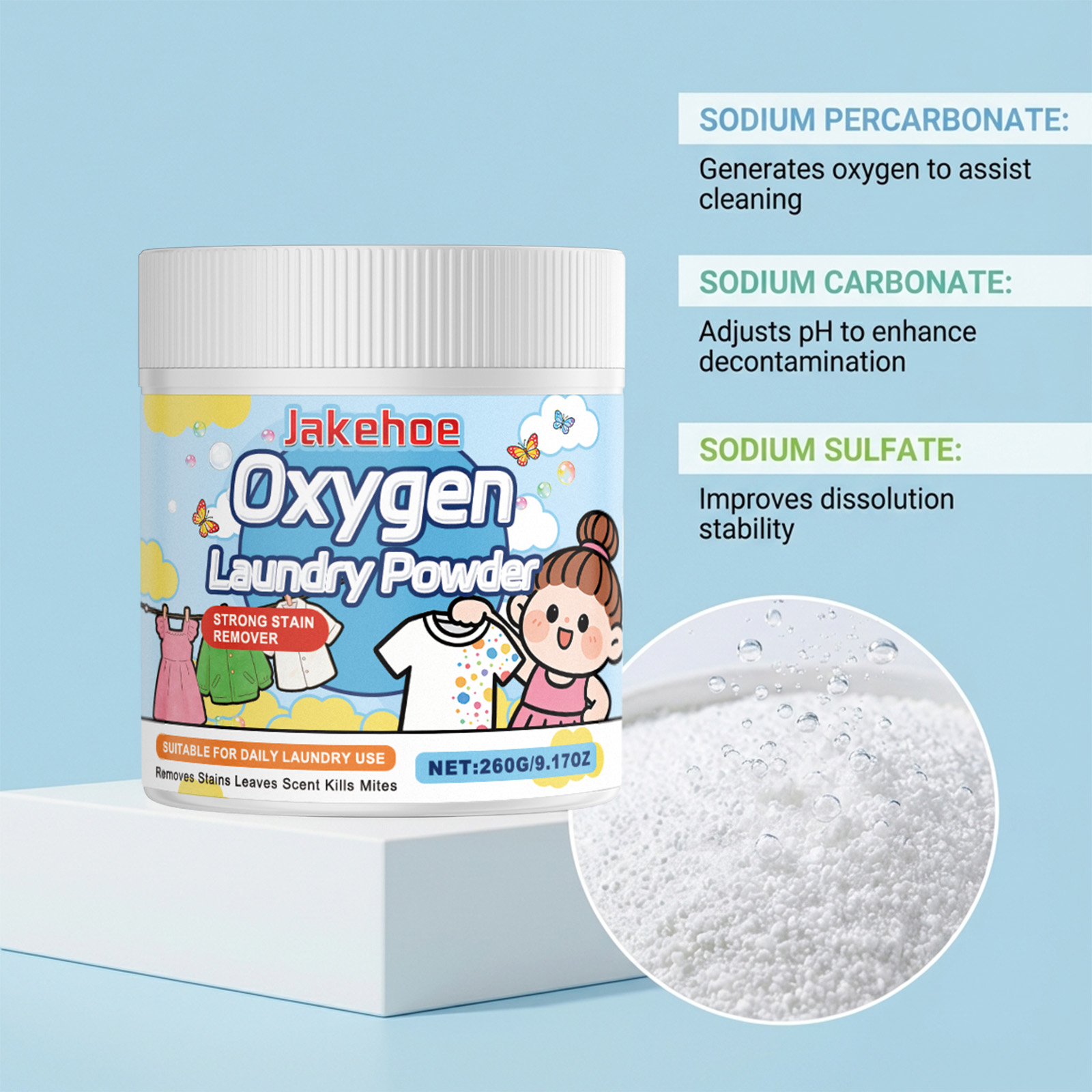 我们的衣物泡洗粉,由过碳酸钠、碳酸钠精心调配而成。专为有效分解污渍,无需用力擦洗设计。使用方法极为便捷:1.取适量产品,溶于温水中。2.将衣物在溶液中浸泡一段时间,以更好地去除污渍。3.彻底冲洗衣物,然后按常规方式洗涤。并且它可以生成氧气以辅助清洁,调节pH值以增强去污效果。