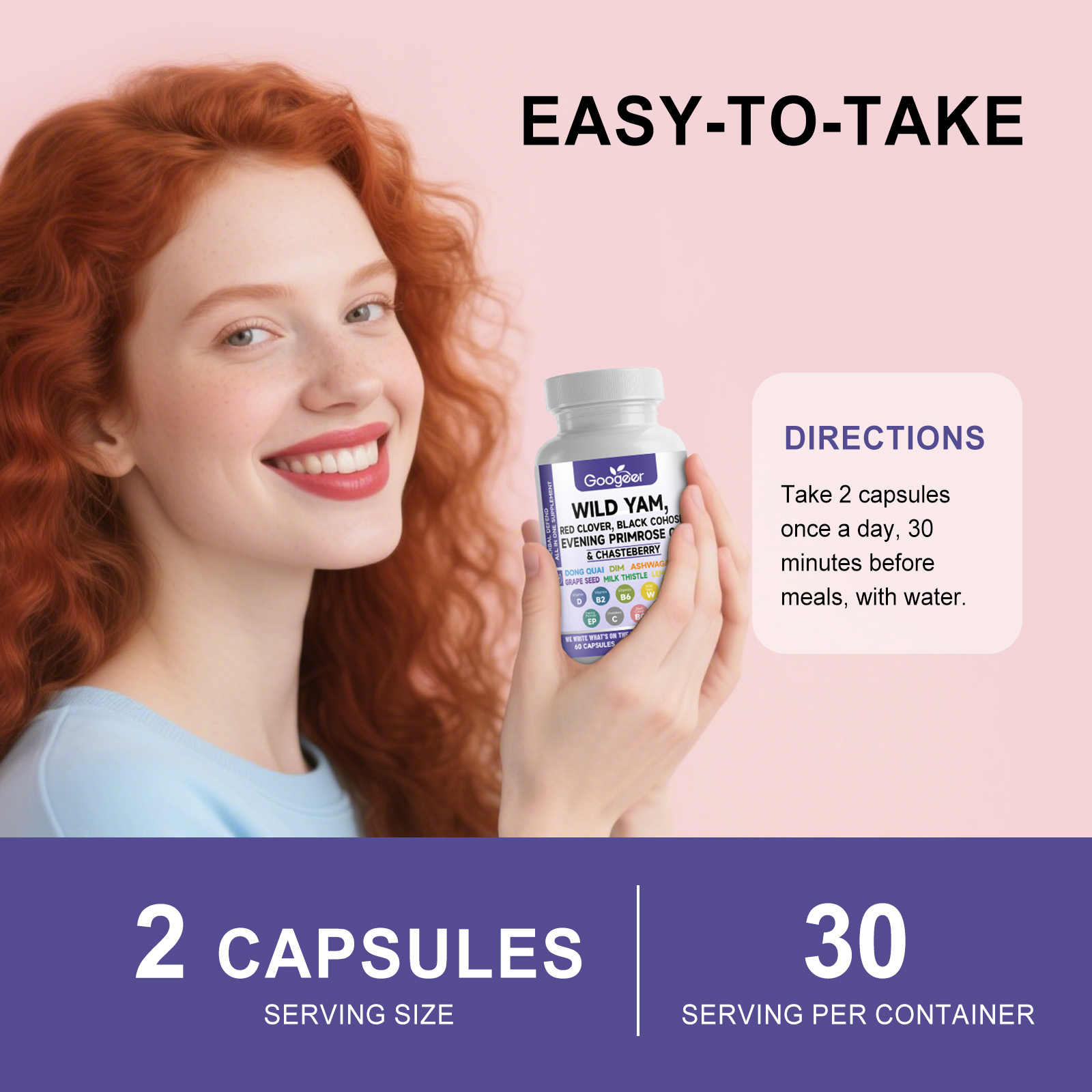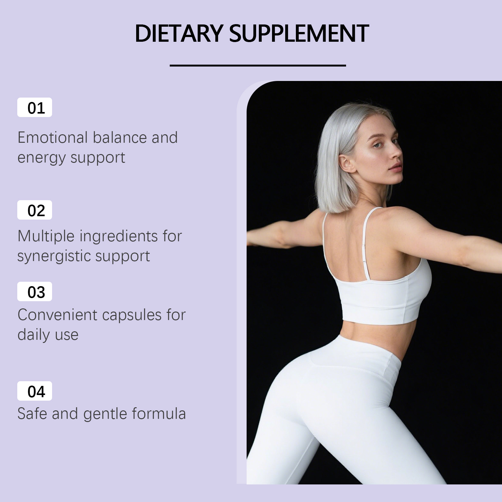 我们的膳食补充剂,由维生素D3、维生素B6精心调配而成。专为维持荷尔蒙,平衡状态,缓解更年期,不适症状设计。使用方法极为便捷:一天一次2粒,随餐30分钟服用,用水送服。并且它可以支持情绪,稳定状态,促进身体,自然调节。