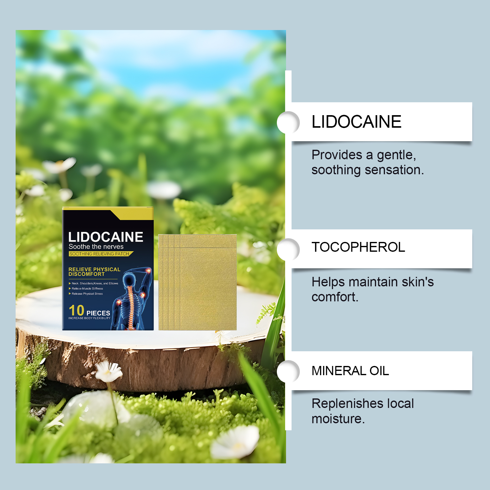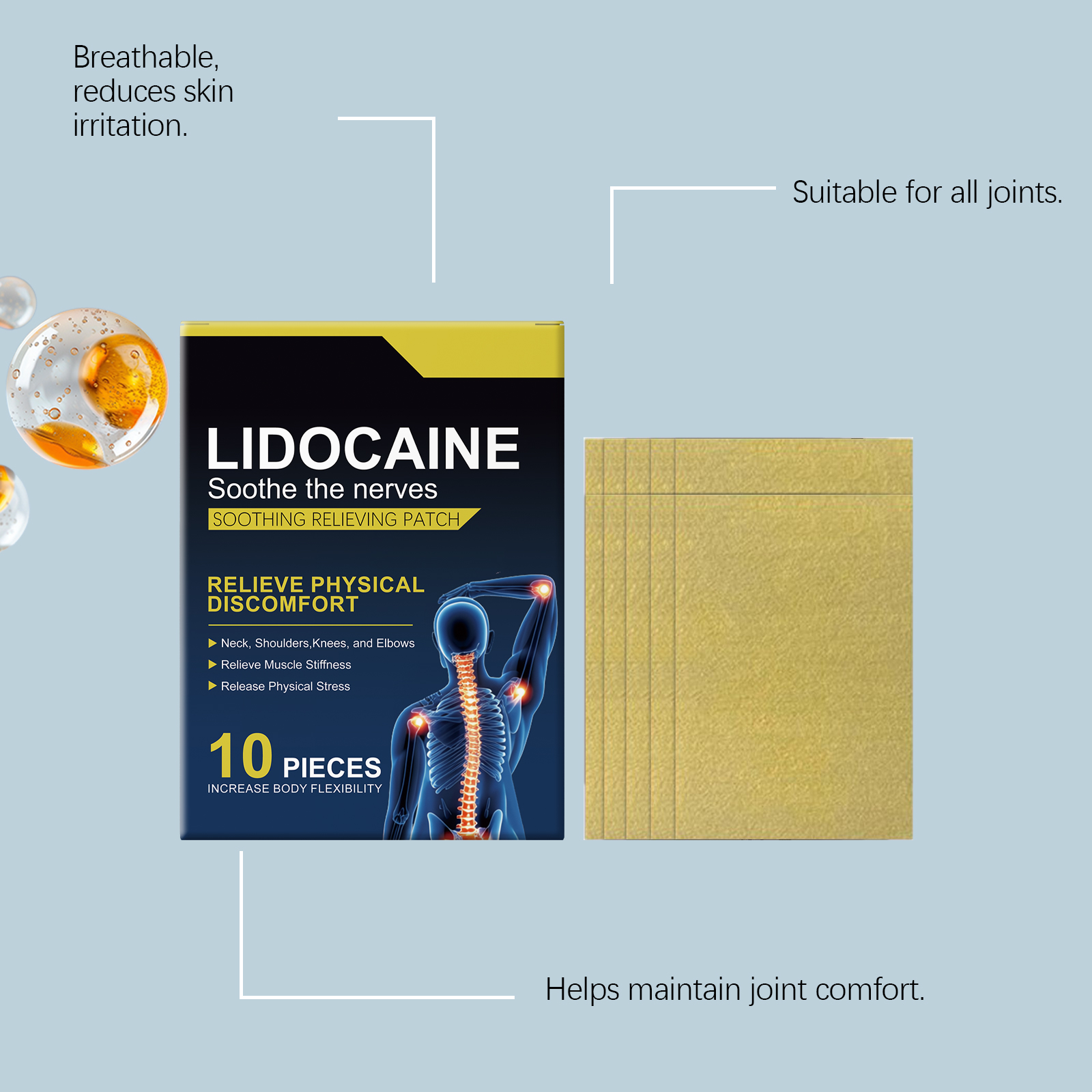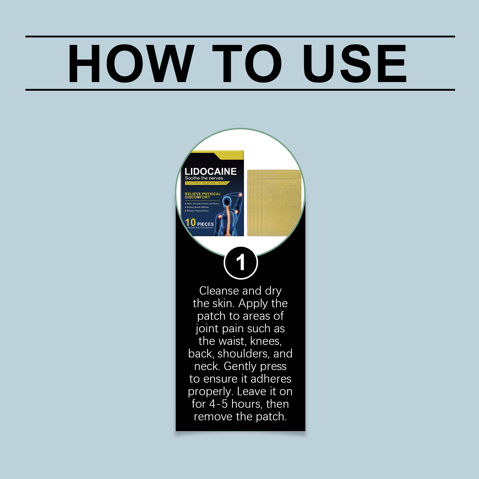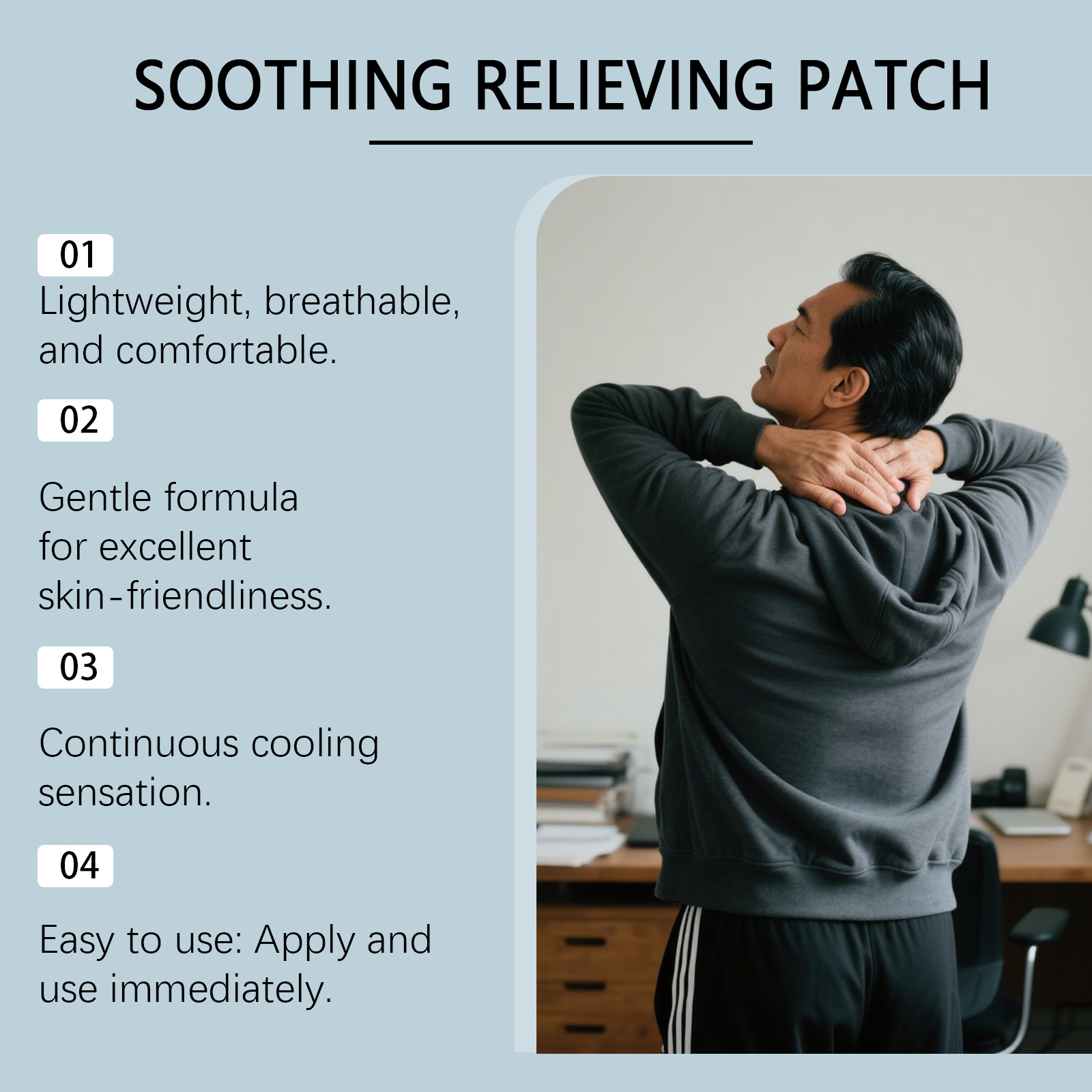 我们的肌肉护理贴,由棕榈酸乙基己酯、蜂蜡精心调配而成。专为提供舒适、凉爽的体验设计。使用方法极为便捷:清洁井干燥皮肤。将贴片贴于关节疼痛部位,如腰部、膝盖、背部、肩部及颈部。轻轻按压,以确保贴片牢同贴合。保持贴敷时间为4至 5小时,随后方可取下。并且符合关节运动。