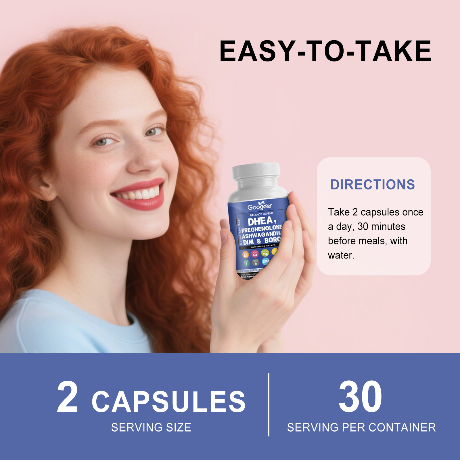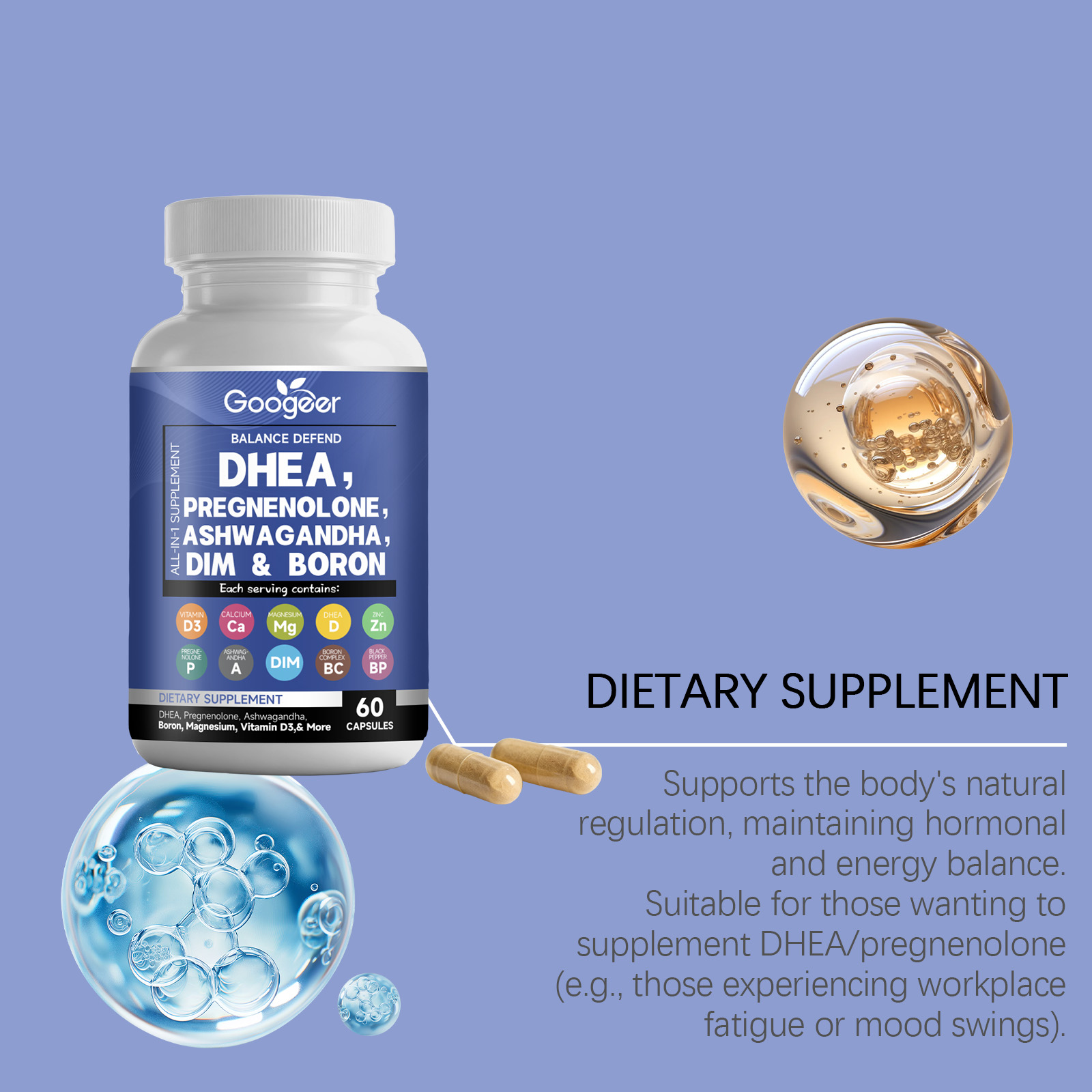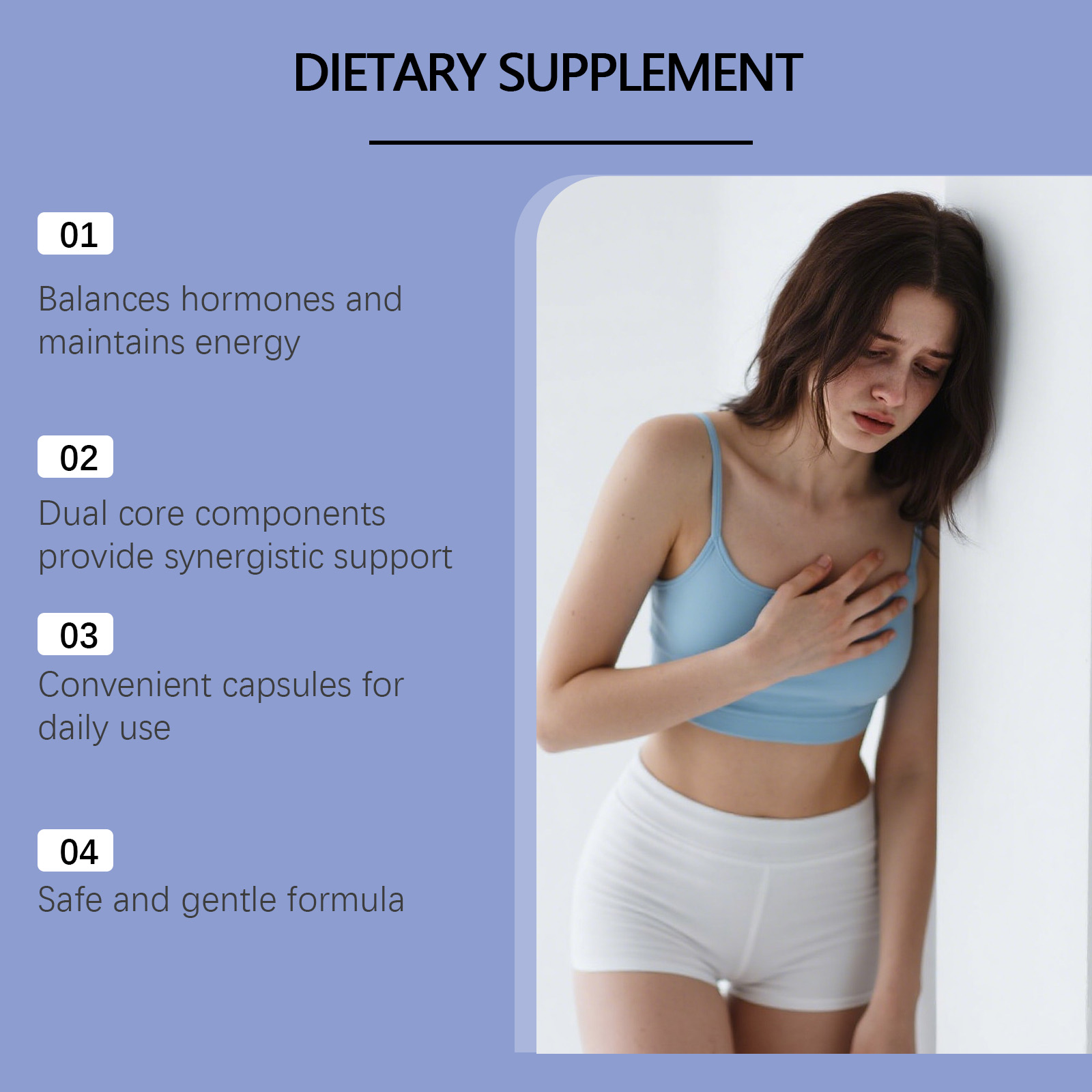 我们的膳食补充剂,由维生素D3、锌精心调配而成。专为维持荷尔蒙,平衡激素,提升活力,提升水平设计。使用方法极为便捷:一天一次2粒,随餐30分钟服用,用水送服。并且它可以稳定情绪,缓解波动,维护代谢,正常功能。
