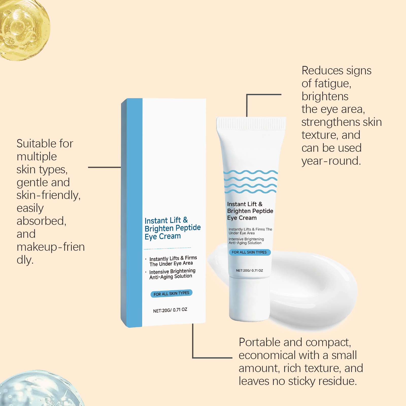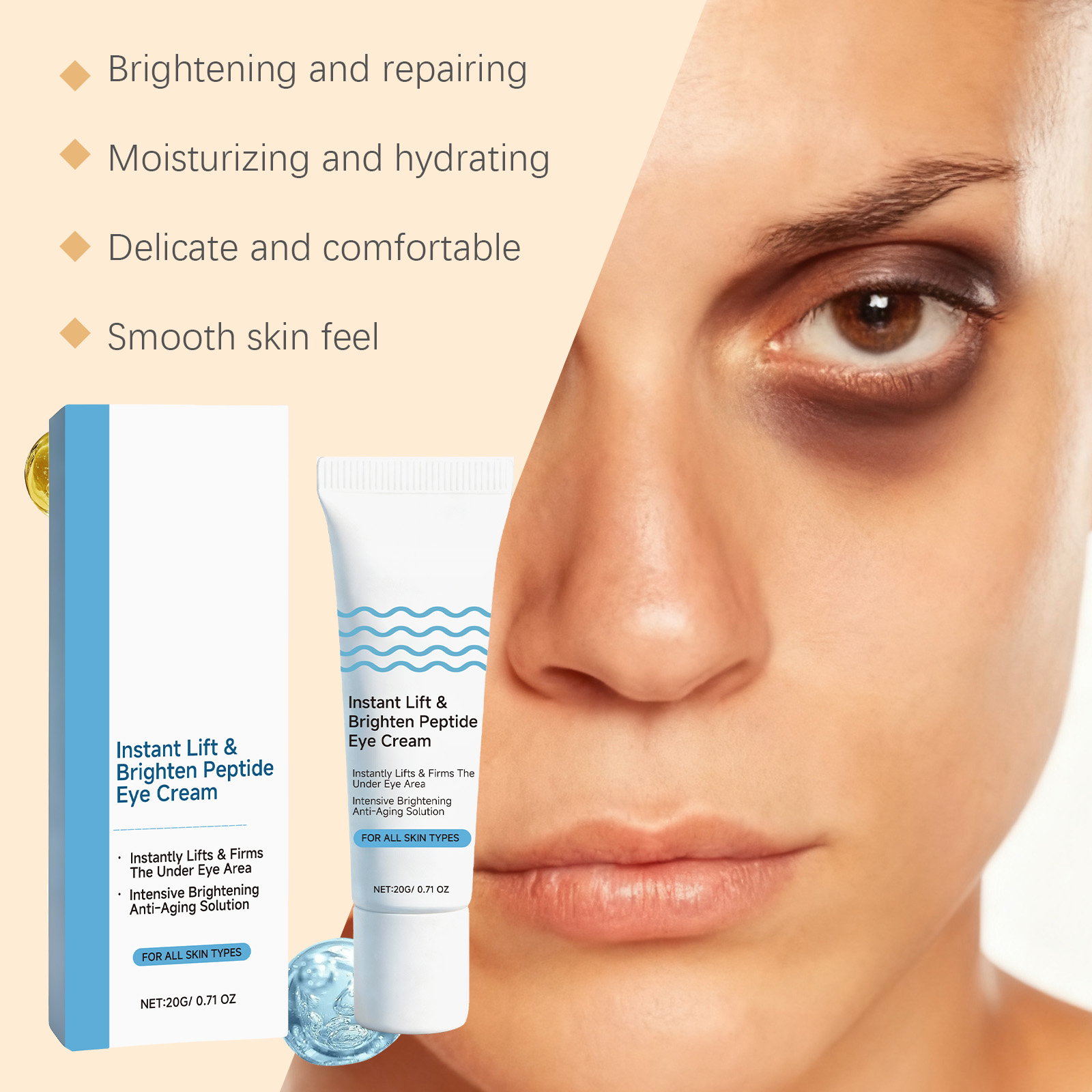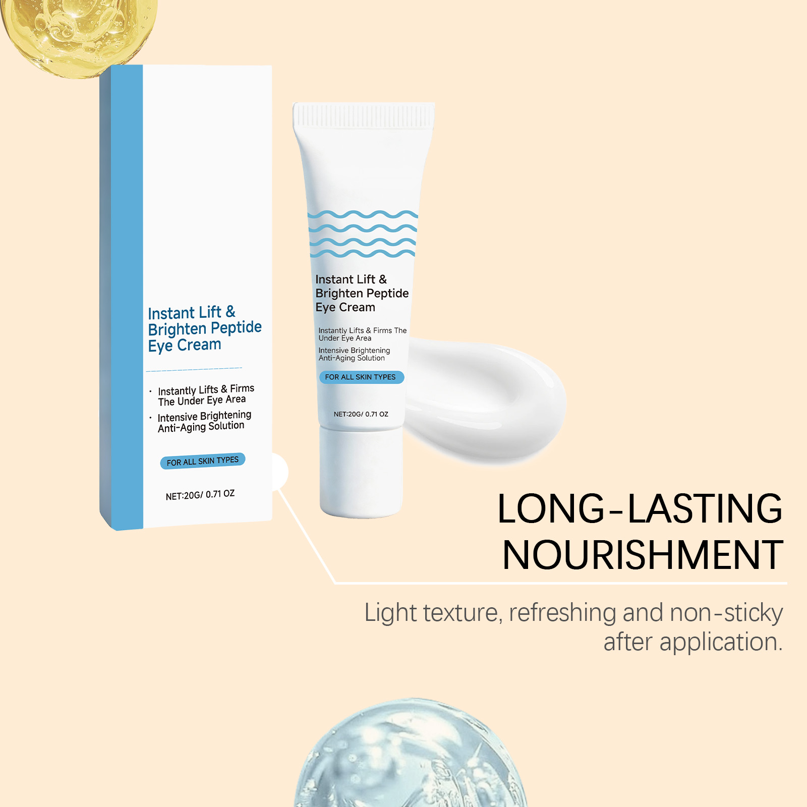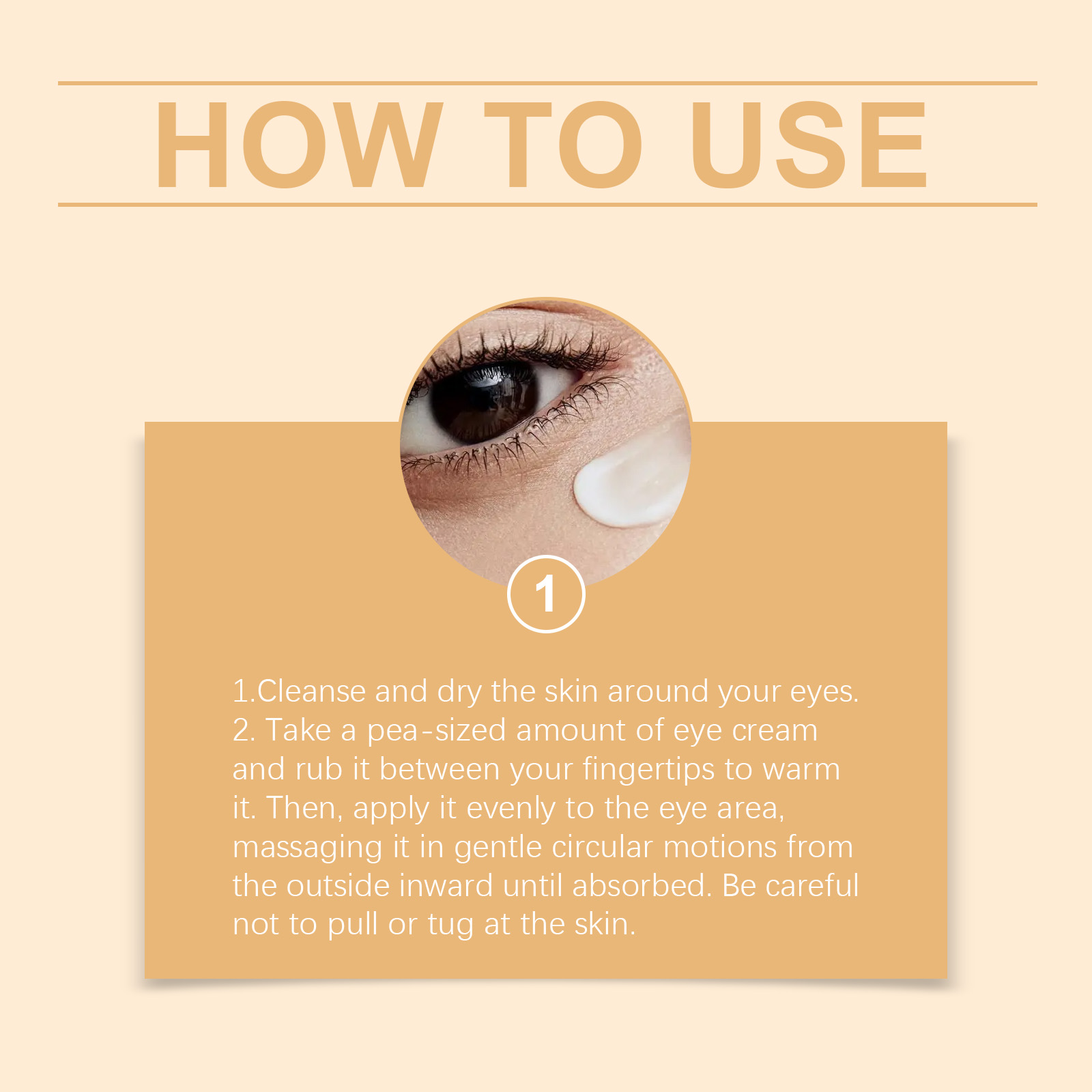 我们的肽眼霜,由卡波姆、精氨酸精心调配而成。专为缓解眼部暗沉,使眼周区域焕发光泽设计。使用方法极为便捷:1.清洁并擦干眼部周围的皮肤。2.取一粒豌豆大小的眼霜,用指尖将其搓热。然后均匀涂抹于眼部区域,并以轻柔的圆周运动方式,从外向内轻轻按摩直至完全吸收。注意不要拉扯或牵动皮肤。并且可以持久保湿和滋润,缓解干燥和不适。