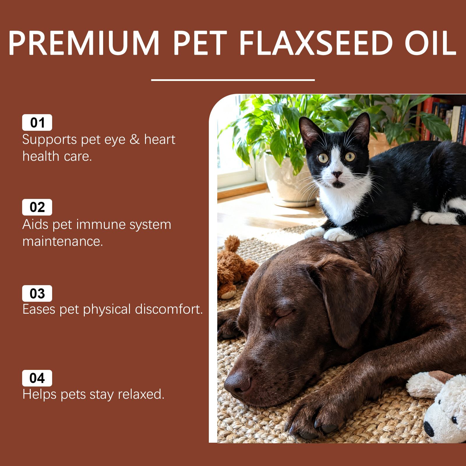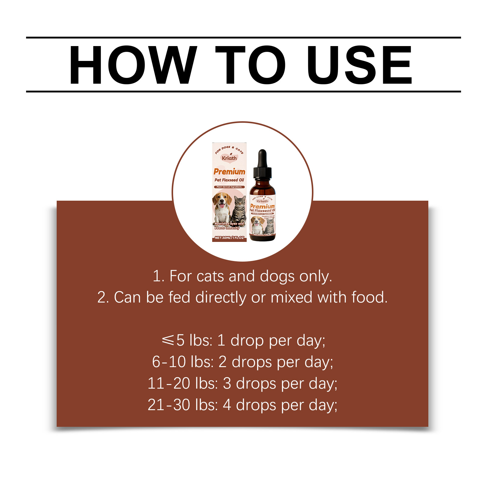 我们的宠物亚麻籽油营养液,由牛磺酸、DHA精心调配而成。专为呵护宠物眼睛与心脏健康,助力维持宠物免疫机能设计。使用方法极为便捷:1.仅限猫猫和狗狗使用。2.可直接喂食或与食物混合喂食。使用方法:≤5磅:每天1滴;6-10磅:每天2滴;11-20 磅:每天3滴;21-30 磅:每天4滴。并且它可以舒缓宠物身体不适,帮助宠物保持放松状态。
