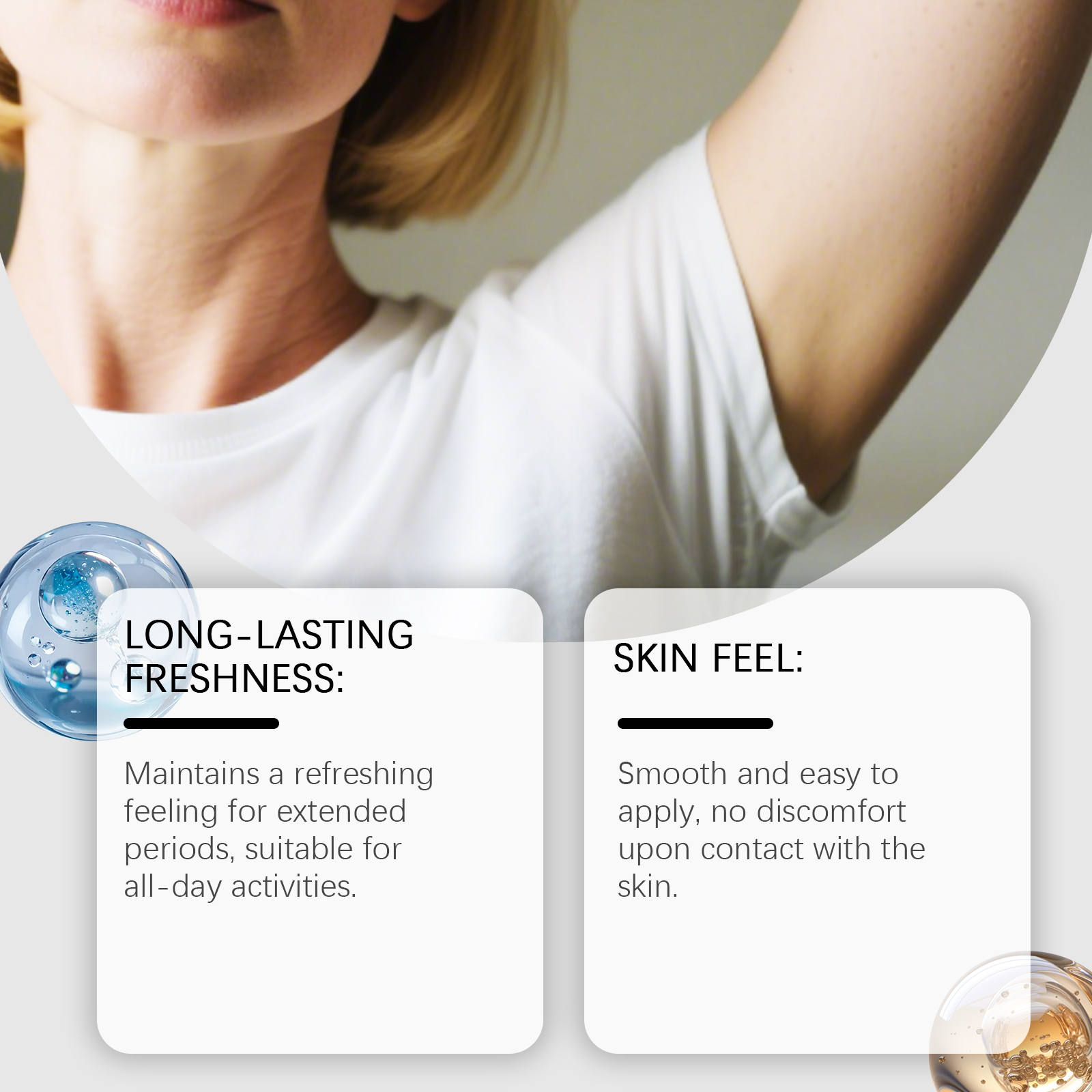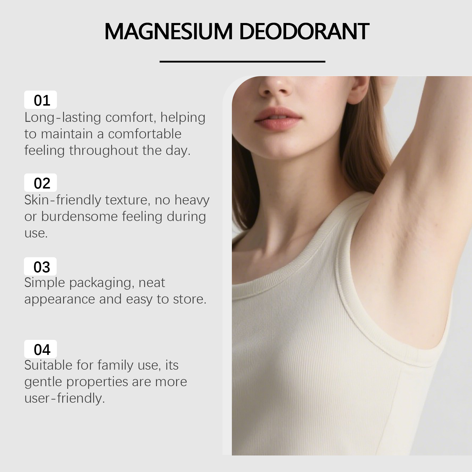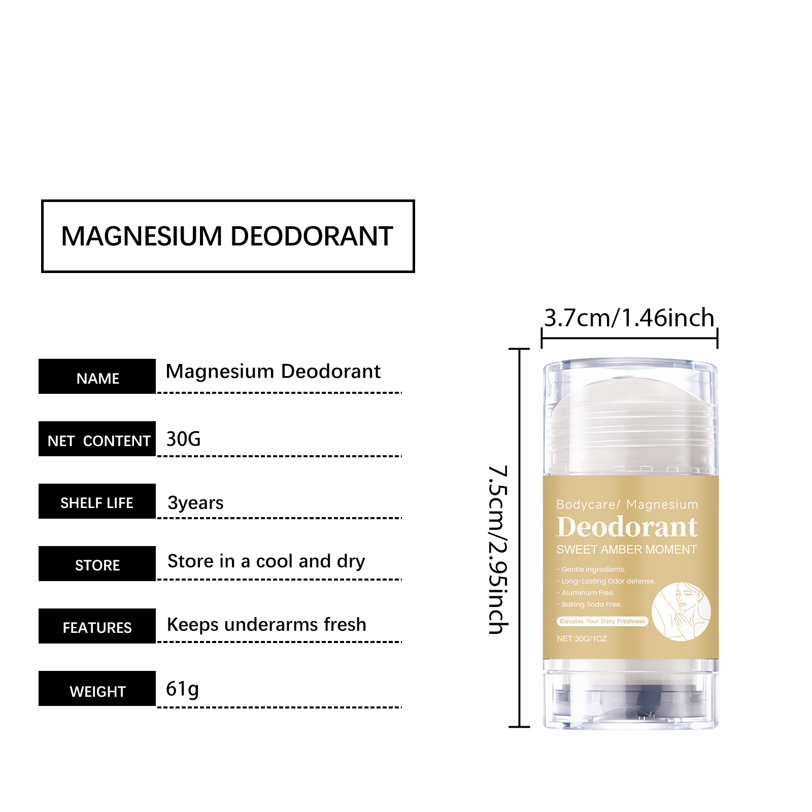 我们的琥珀身体护理棒,由氯化镁、琥珀提取物精心调配而成。专为维持腋下清新,助力日常舒适状态设计。使用方法极为便捷:1.旋转取出少量产品,避免接触破损皮肤区域。2.均匀涂抹于腋下,确保涂抹区域干燥。并且可以轻护肌肤,使用后无刺激不适感。