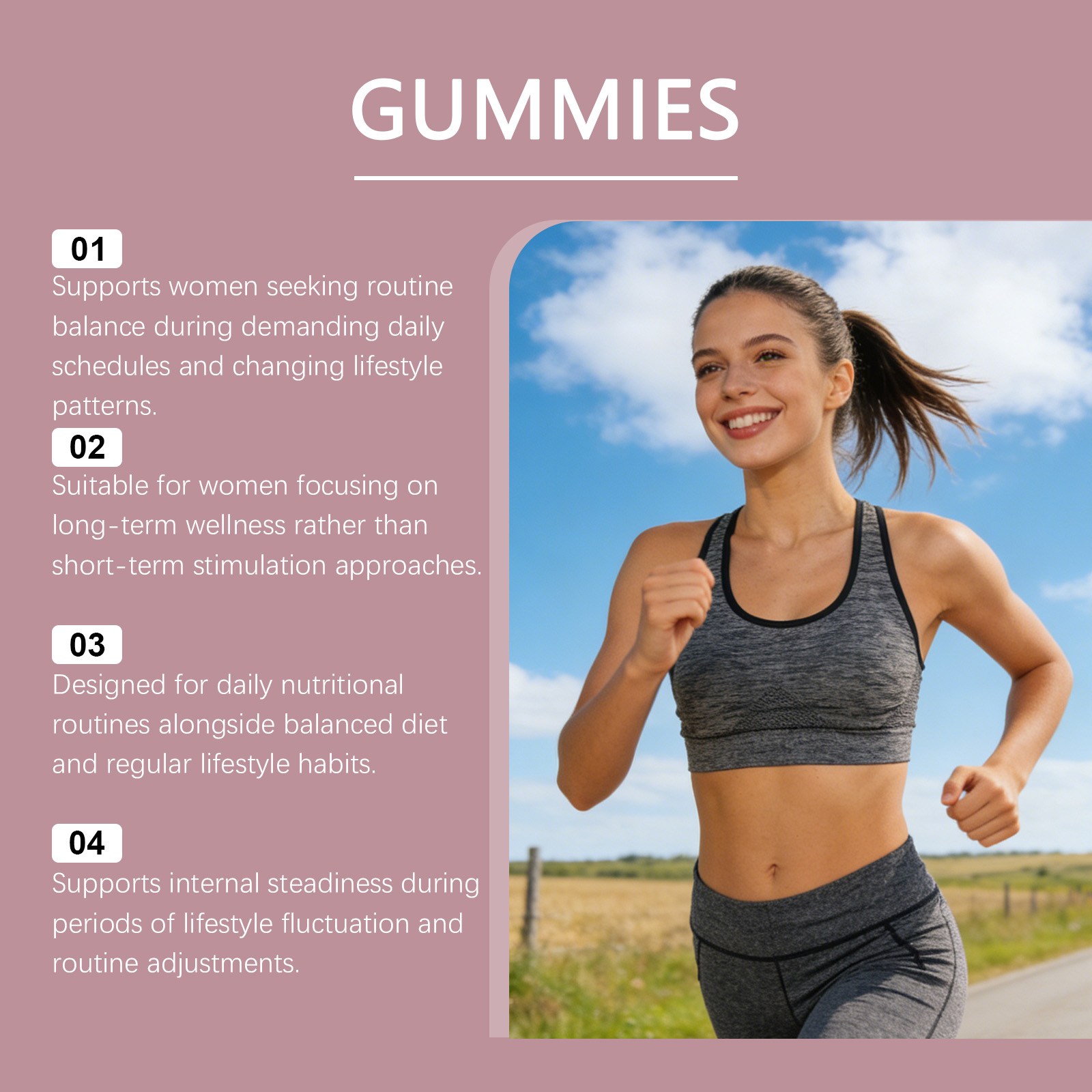 我们的女性平衡支持软糖,由植物油、柠檬酸精心调配而成。专为现代女性设计,支持日常节奏与内在平衡,帮助应对忙碌的生活方式。使用方法极为便捷:每天服用3粒胶囊。并且它旨在配合日常压力管理帮助维持稳定的生活节奏。