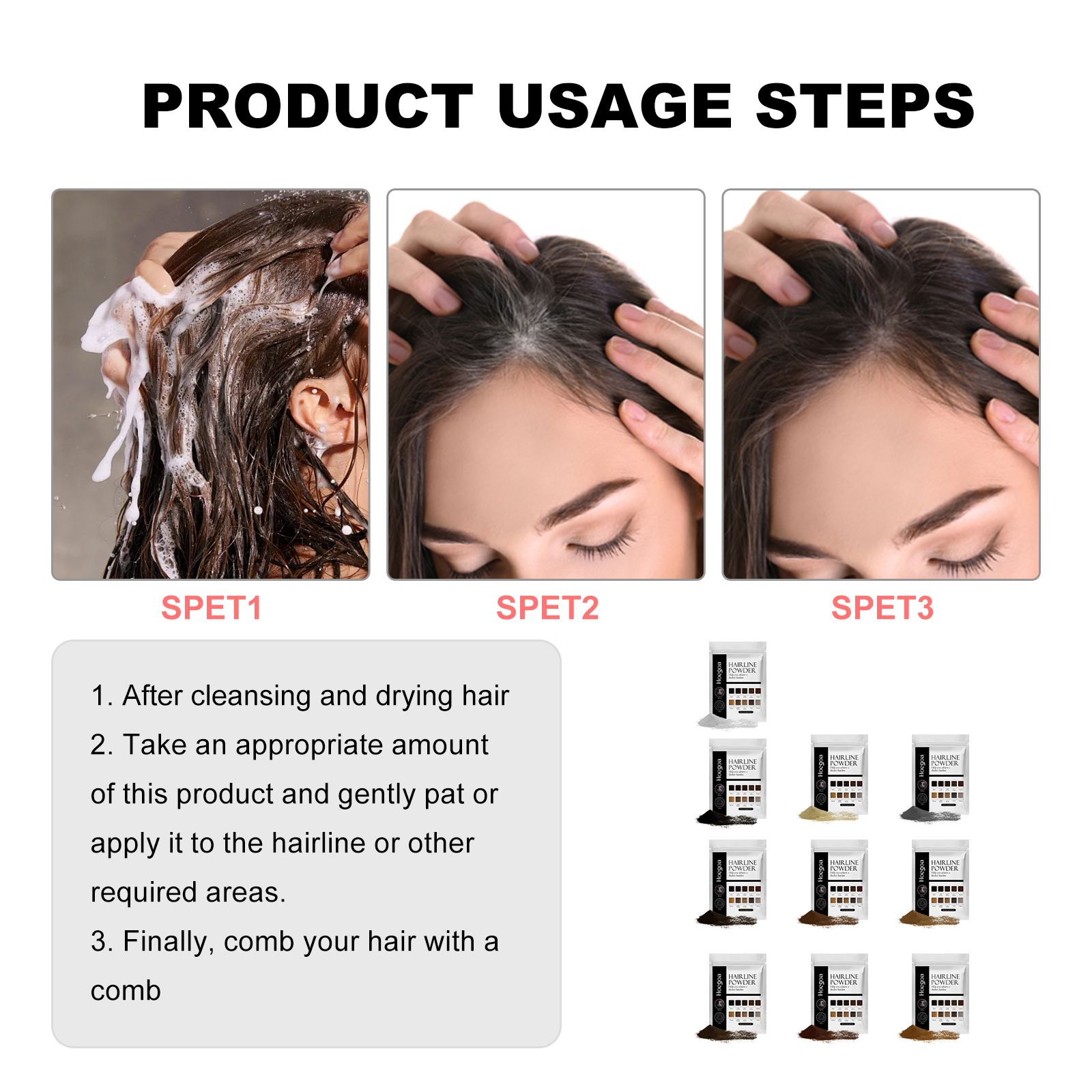 我们的发际线粉含有改性玉米淀粉、淀粉辛烯基琥珀酸铝。它可以附着在头皮上,遮盖住头发接缝,使头发看起来更饱满更浓密。它的使用方法很简单:清洁头发并吹干后,取适量本品轻拍或涂于发际或其他所需部位,最后,用梳子梳理头发即可。可以长时间保持在头发上,持久保持头发更饱满、更浓密的效果。