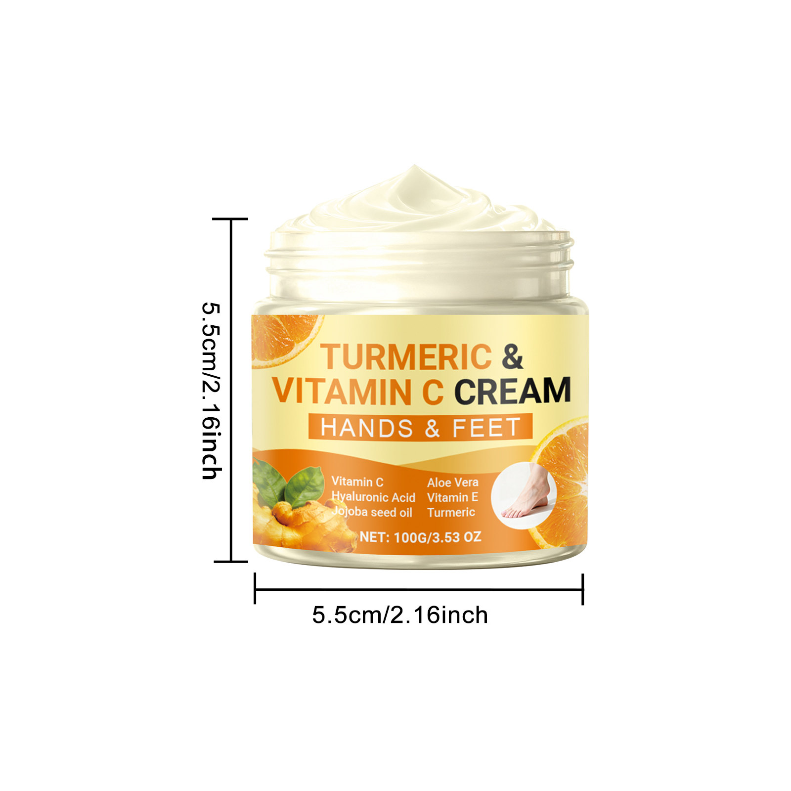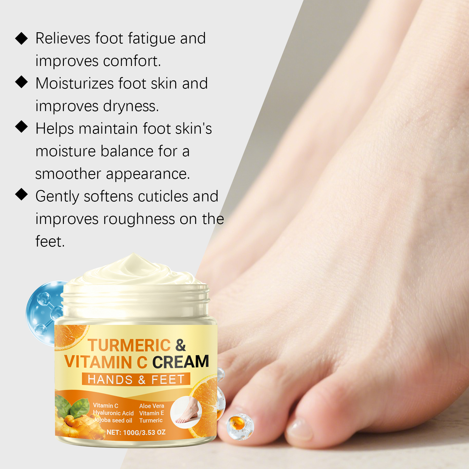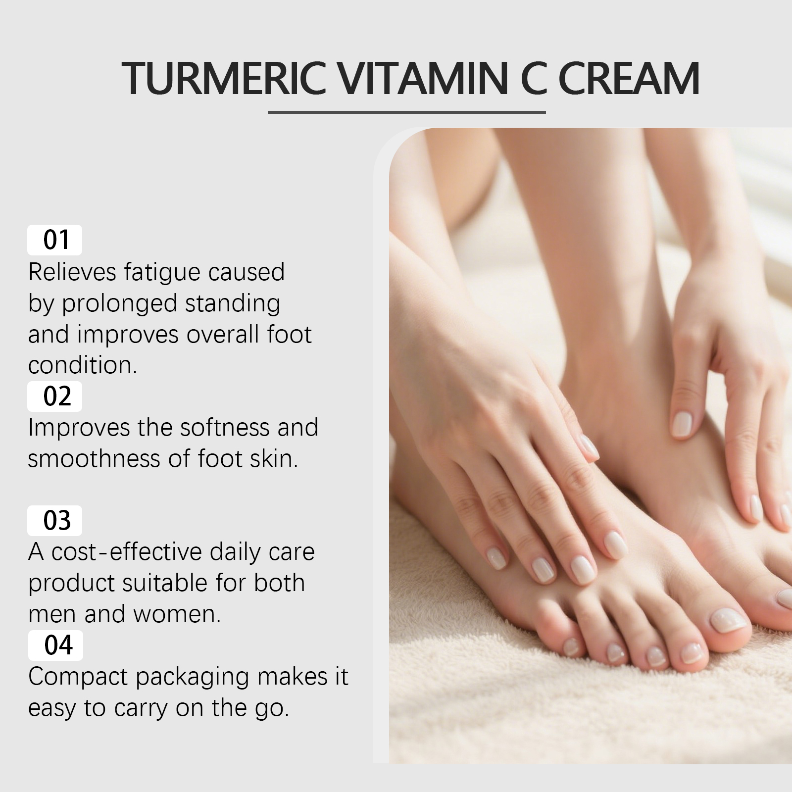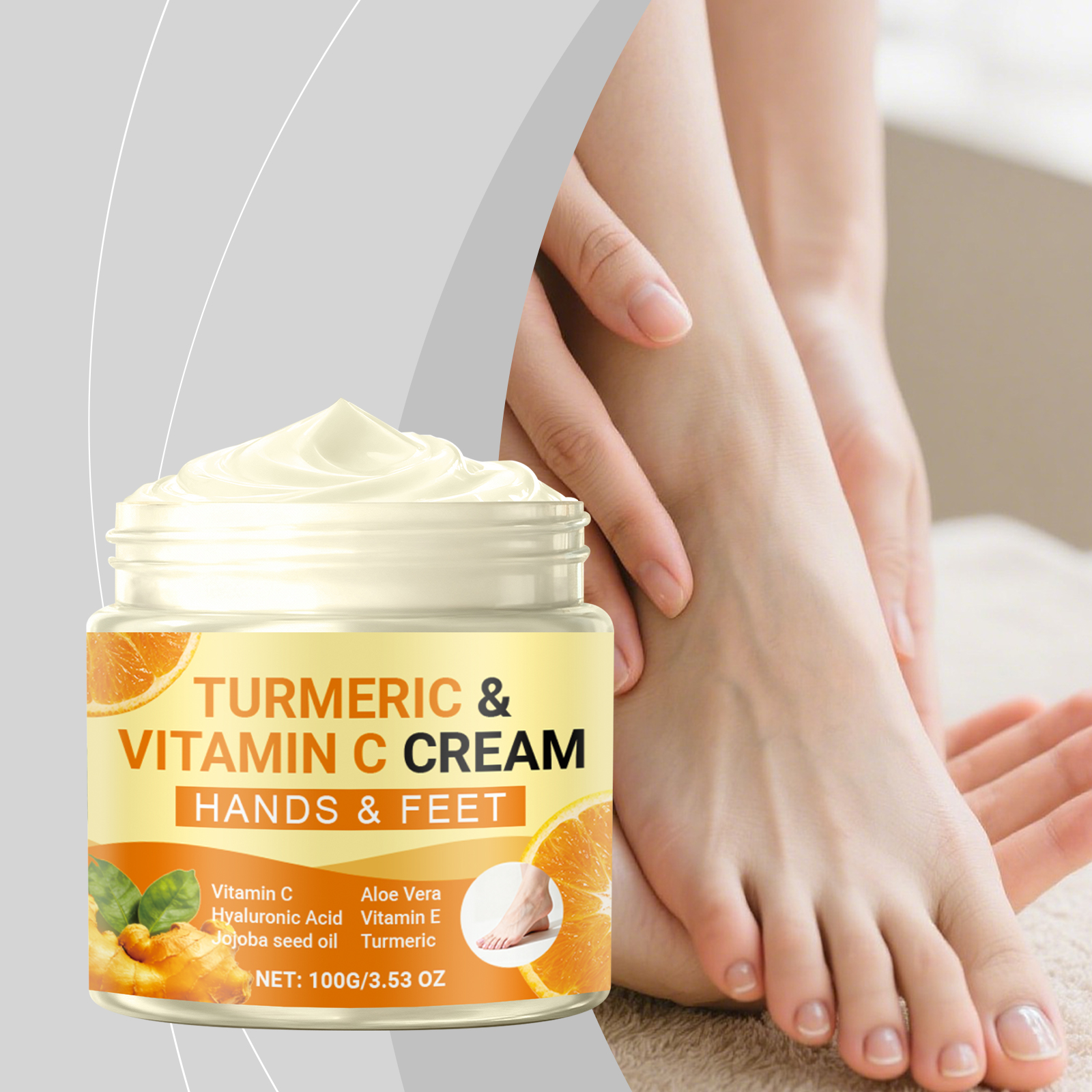 我们的姜黄维C润肤霜,由库拉索芦荟提取物、向日葵籽油精心调配而成。专为缓解足部疲劳和不适设计。使用方法极为便捷:1.清洁并擦干手和脚。2.将适量本产品涂抹于手部和足部皮肤。3.以打圈方式轻柔按摩,直至完全吸收。并且可以改善干燥的双脚。适合运动后放松双脚。
