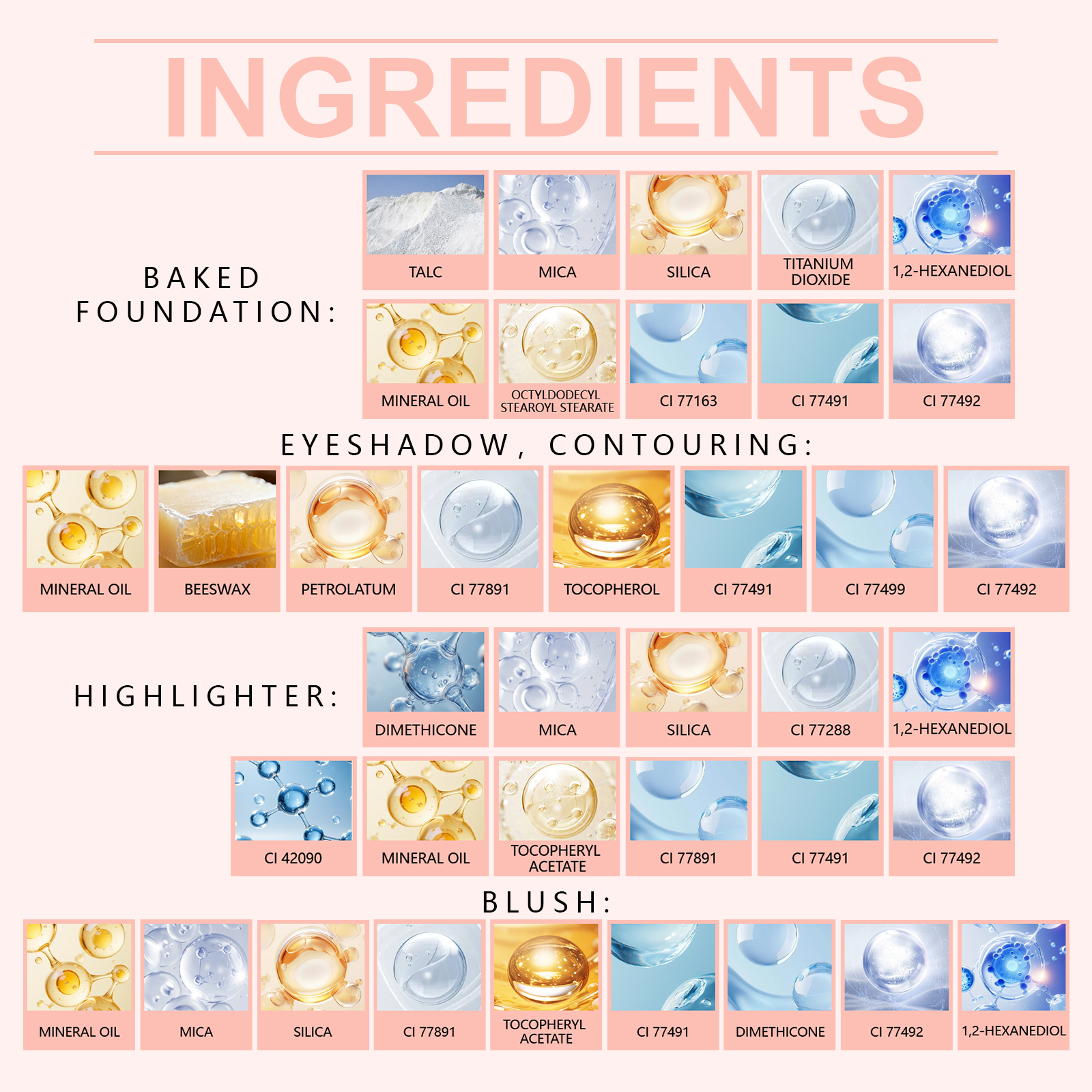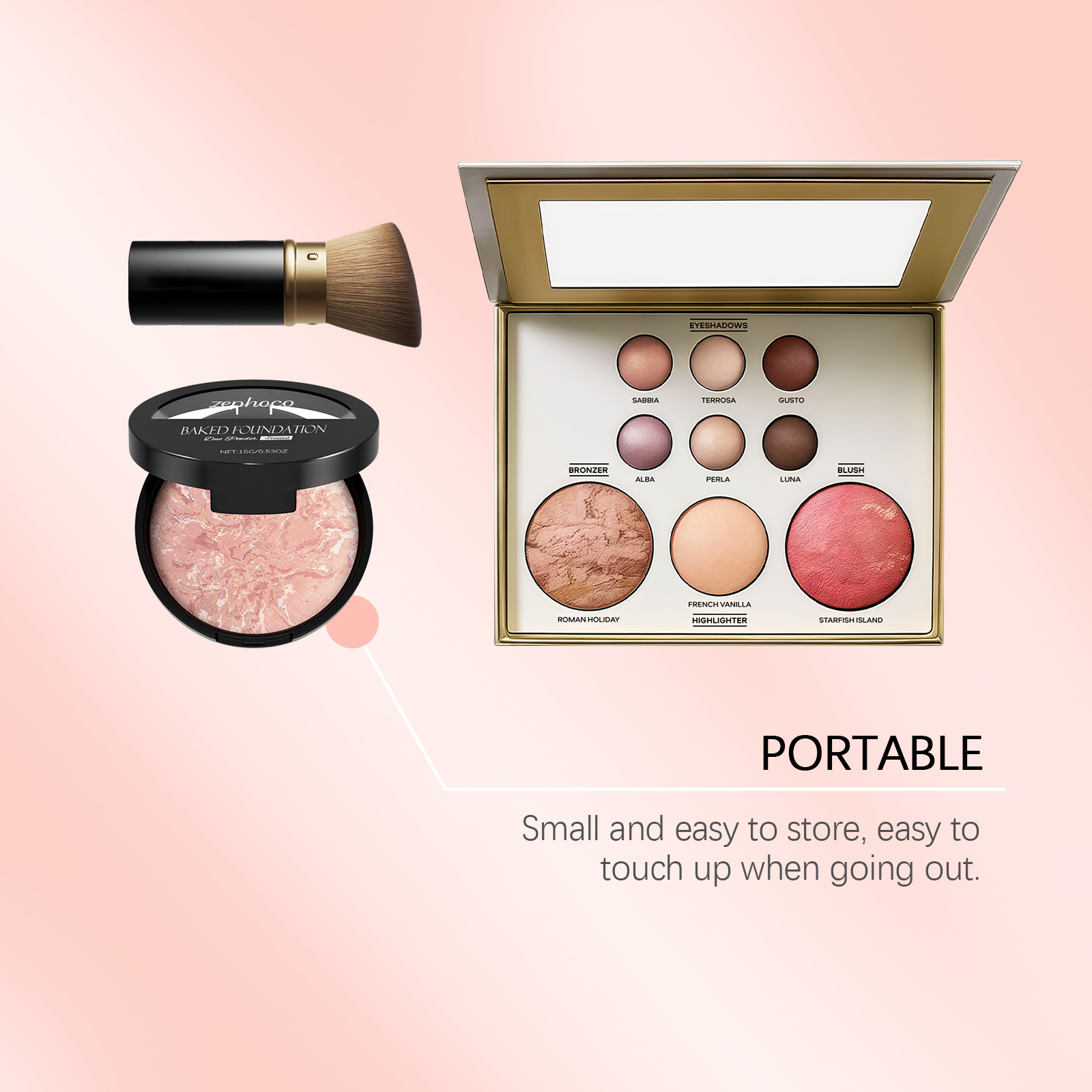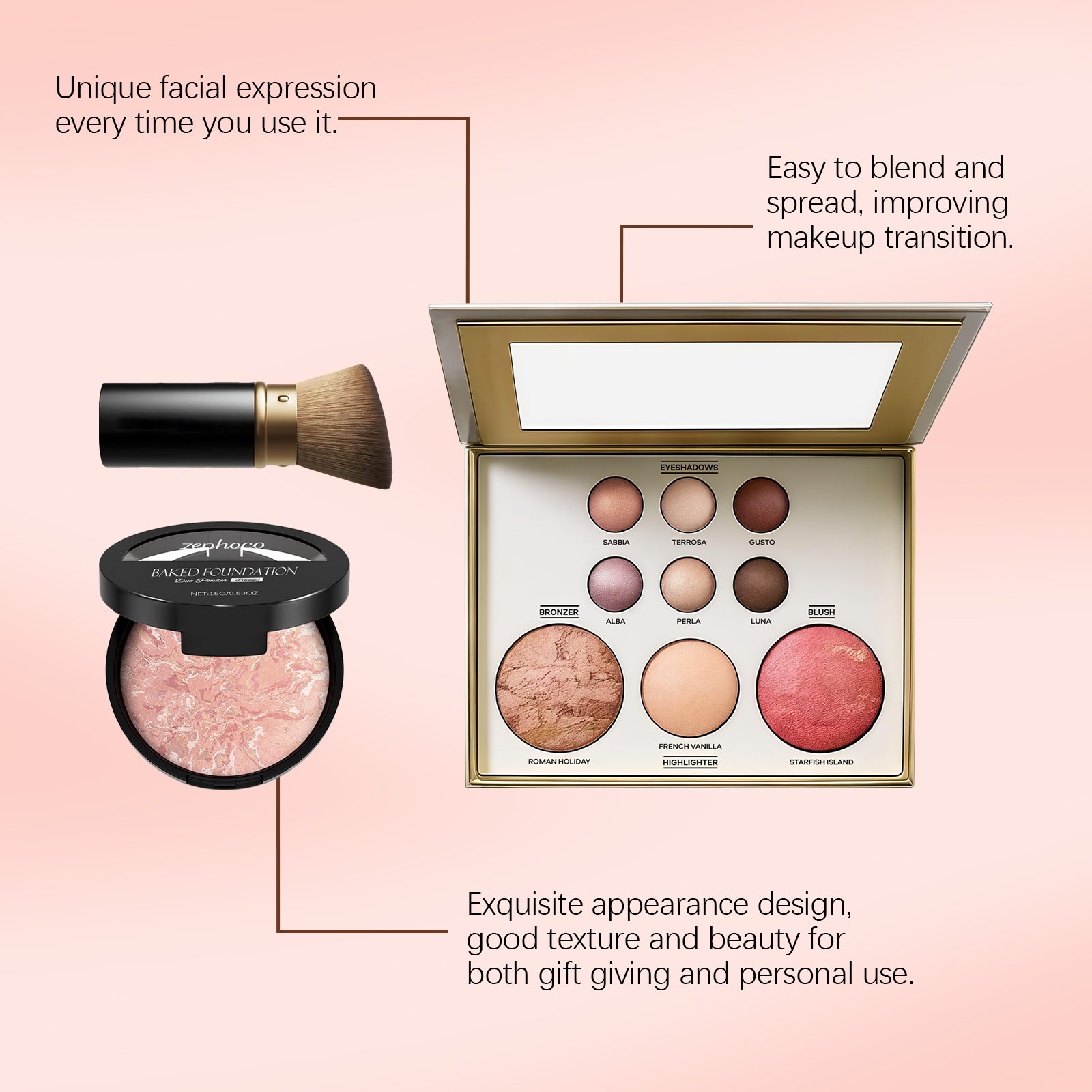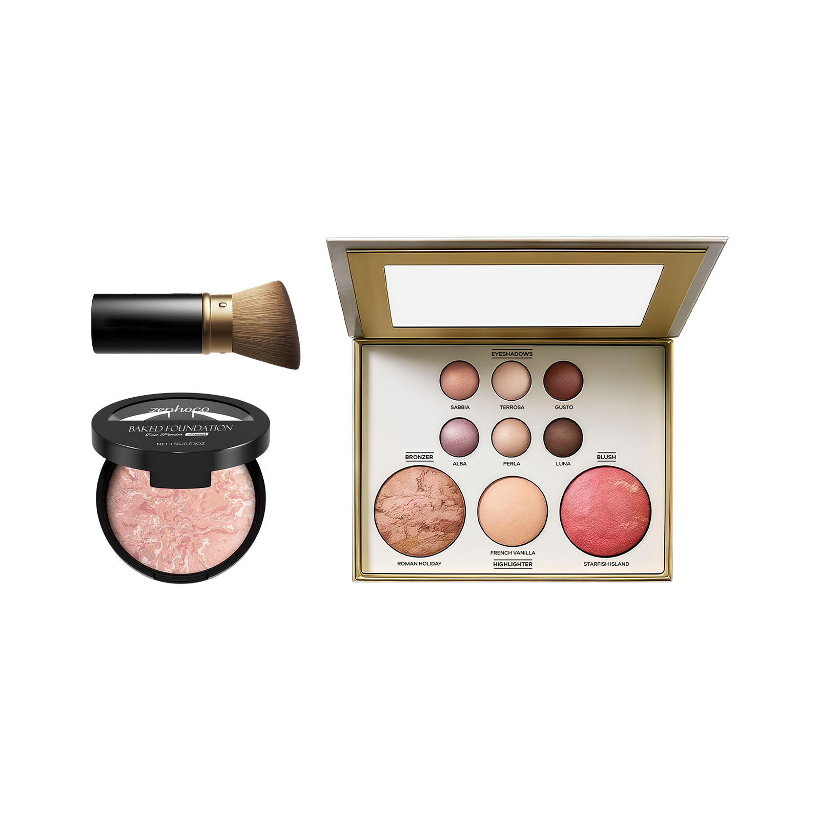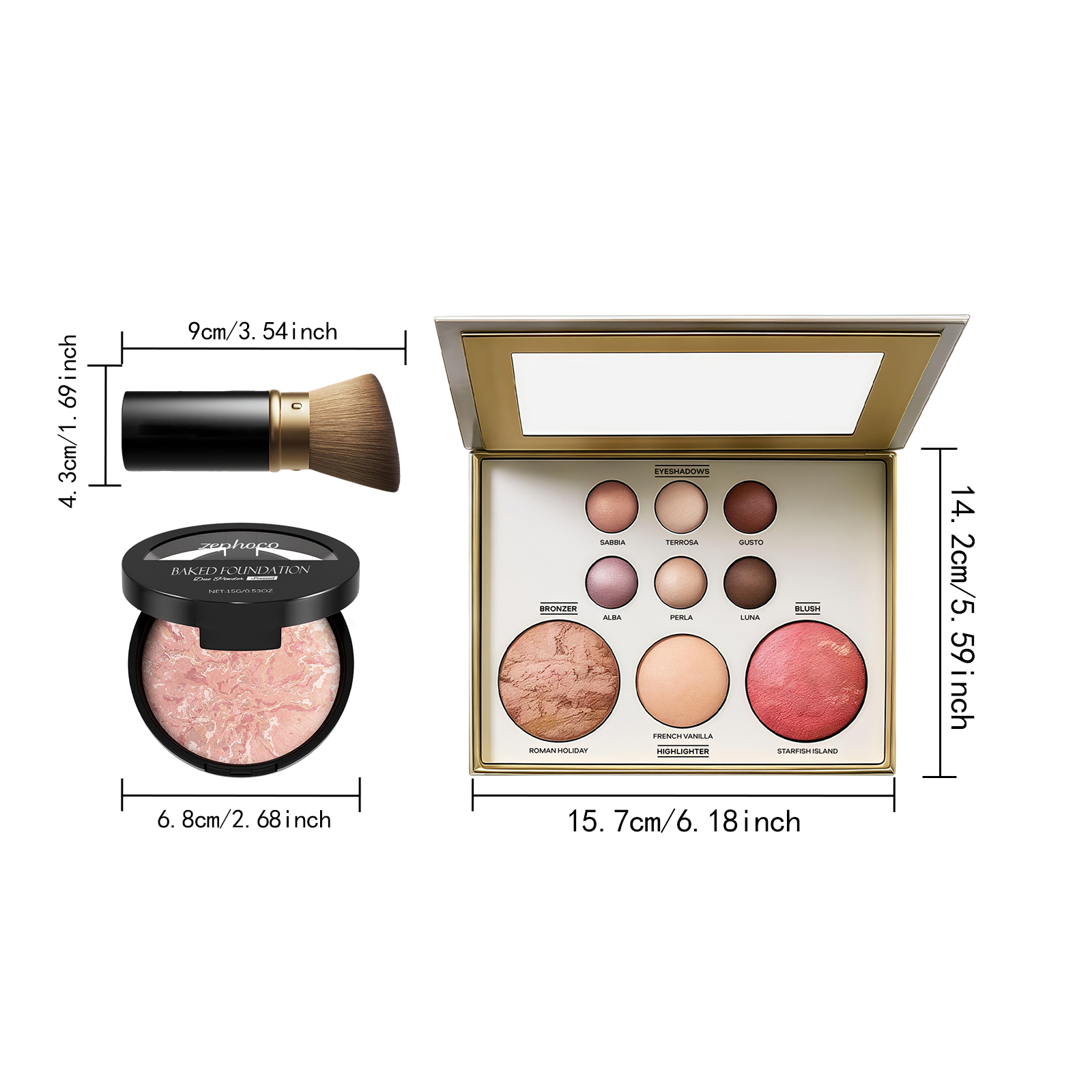 | 产品尺寸 | 斜头刷: 3.1*9*4.3cm,彩妆盘: 15.7*14.2*3cm,烘焙粉底:6.8*6.8*2cm |