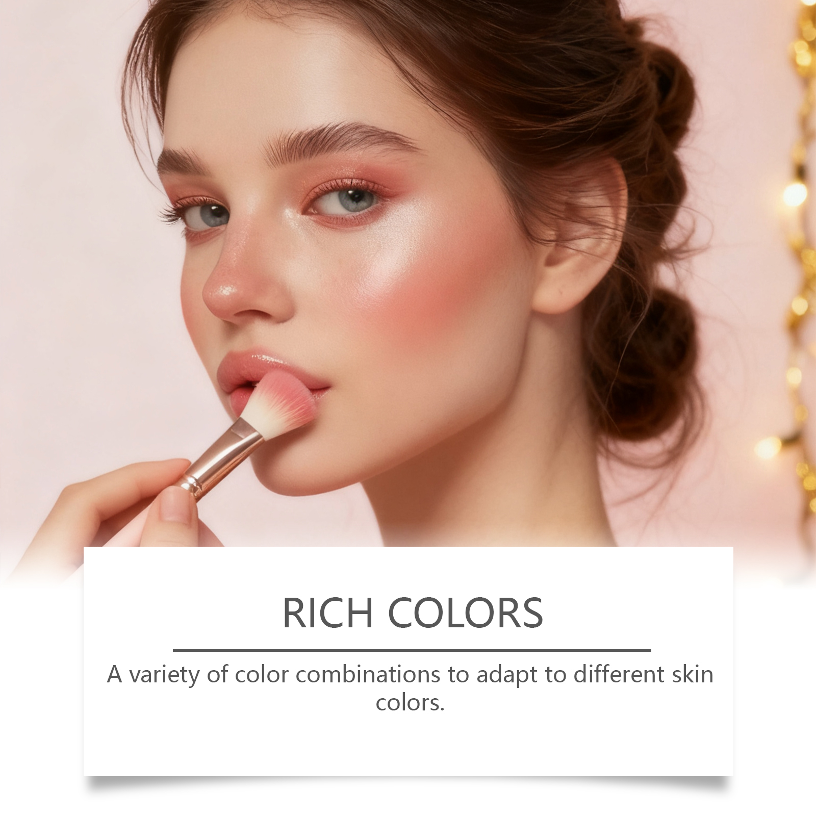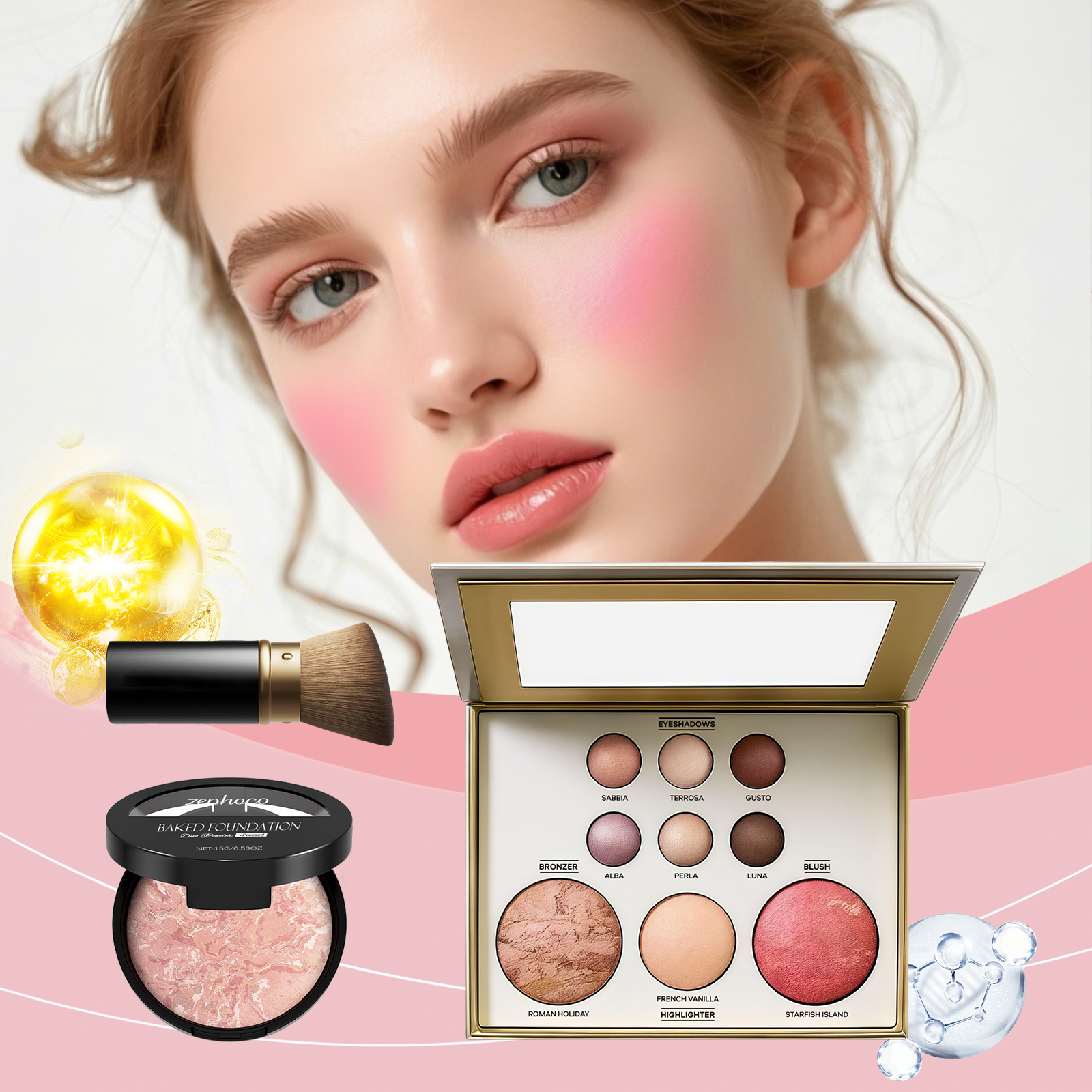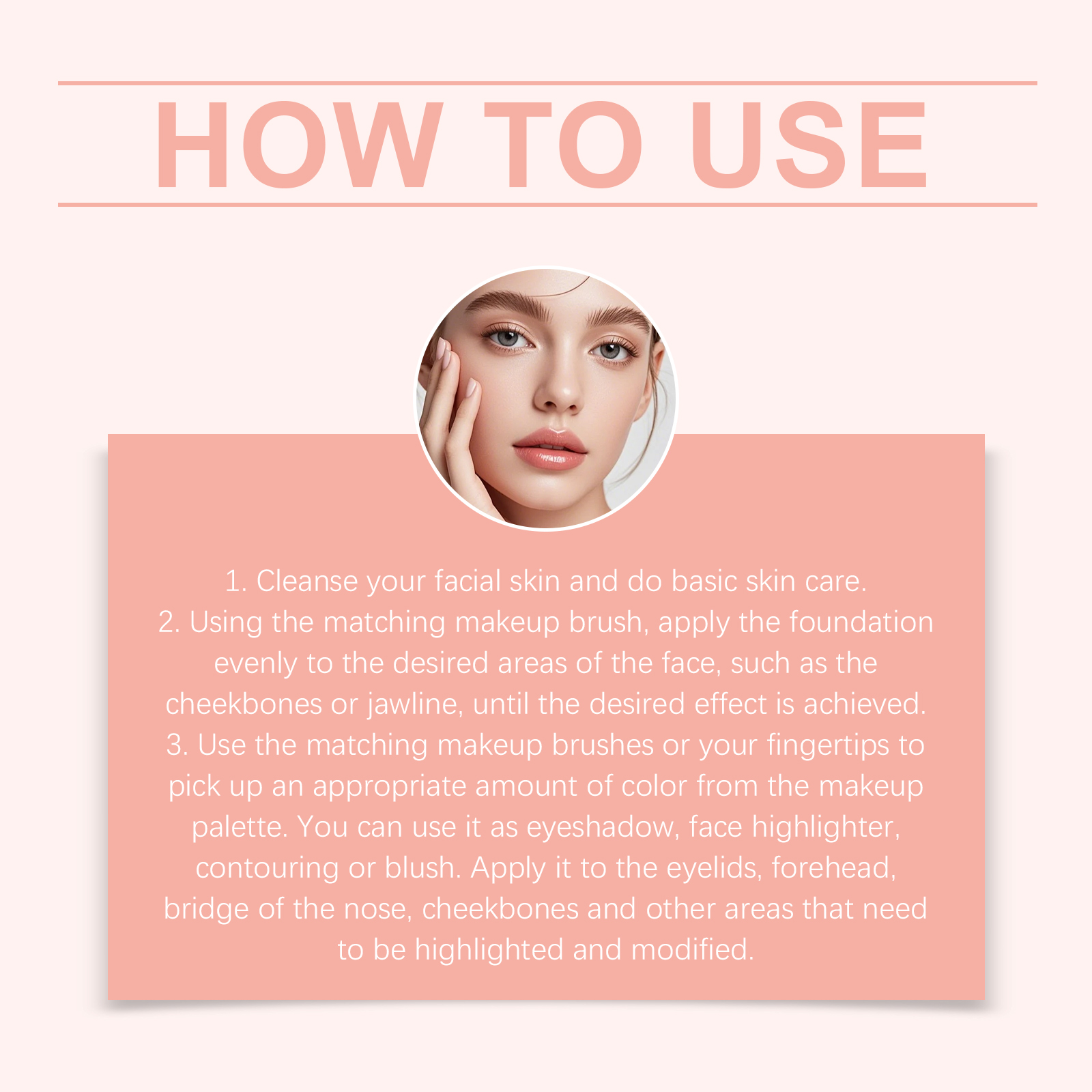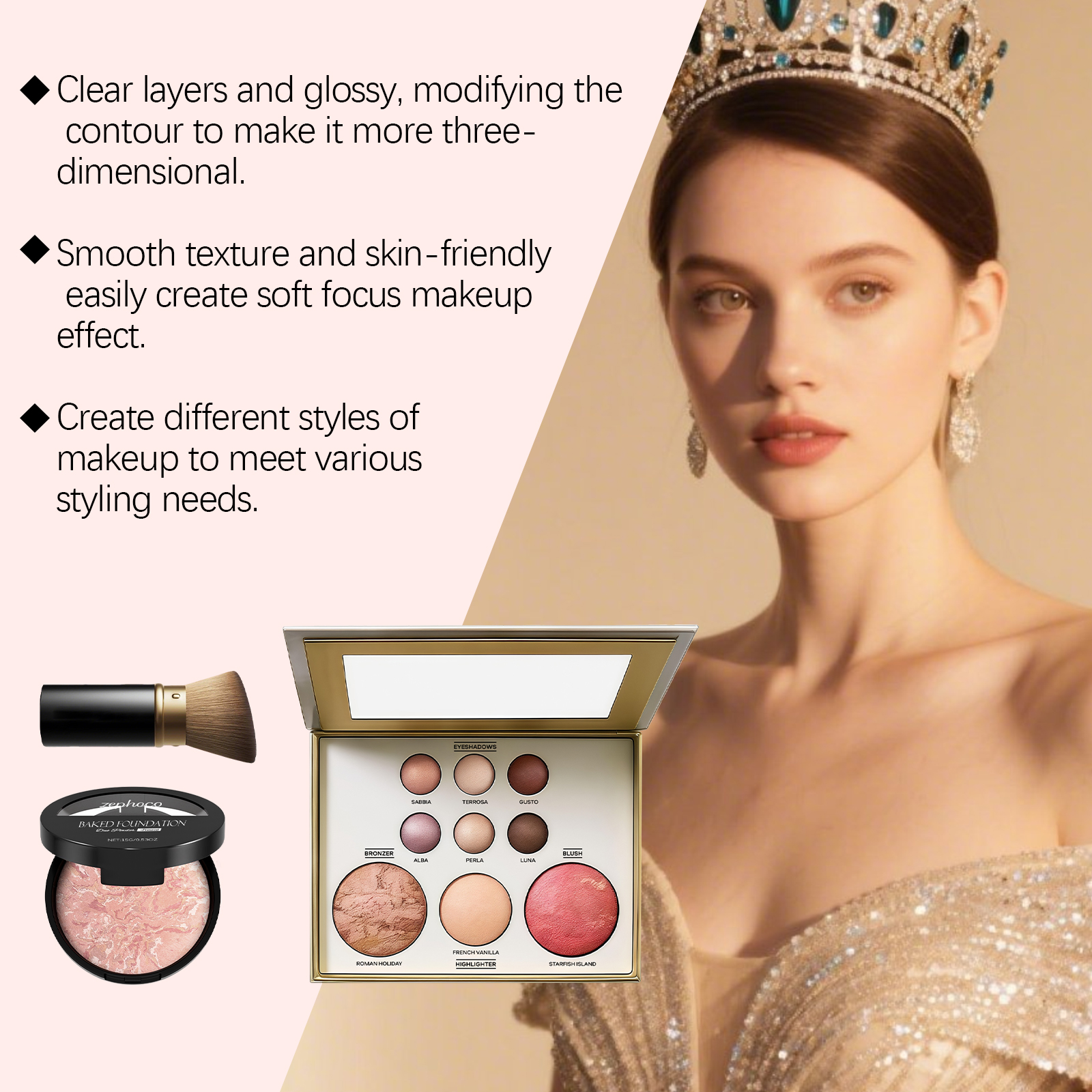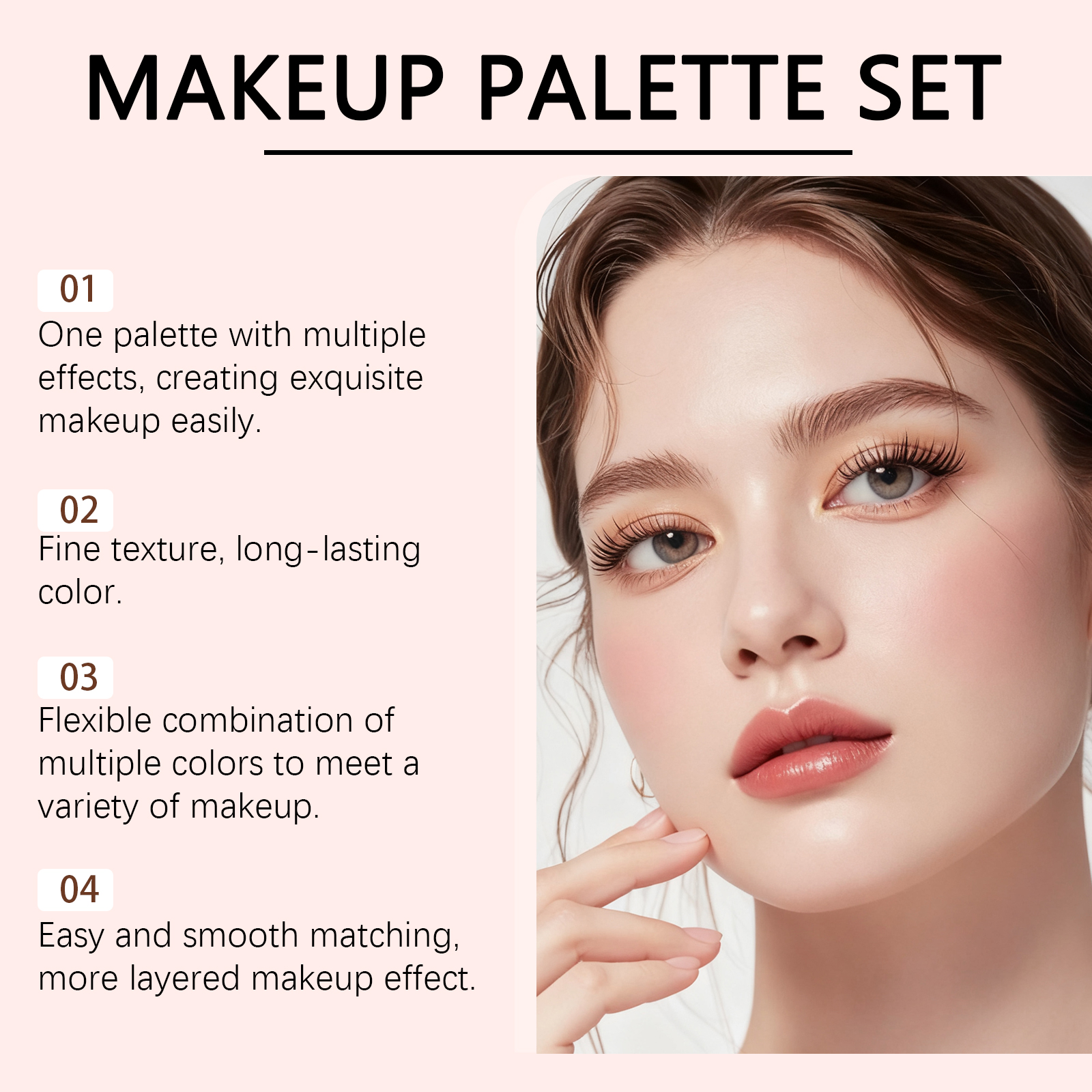 我们的彩妆盘组合套装 02#,由云母、硅石精心调配而成。专为满足日常和宴会化妆的多种风格需求设计。使用方法极为便捷:1.清洁面部肌肤并进行基础护肤。2.使用匹配的化妆刷,将粉底均匀涂抹在面部所需区域,如颧骨或下颌线,直至达到理想效果。3.使用与之相匹配的化妆刷或指尖从化妆盘上取用适量色彩。你既可以将它用作眼影、面部高光、暗影塑造或腮红,也可将其涂抹于眼睑、前额、鼻梁颧骨及其他需要突出和修饰的部位。并且可以呈现透明且精致的妆效,突出面部三维轮廓。