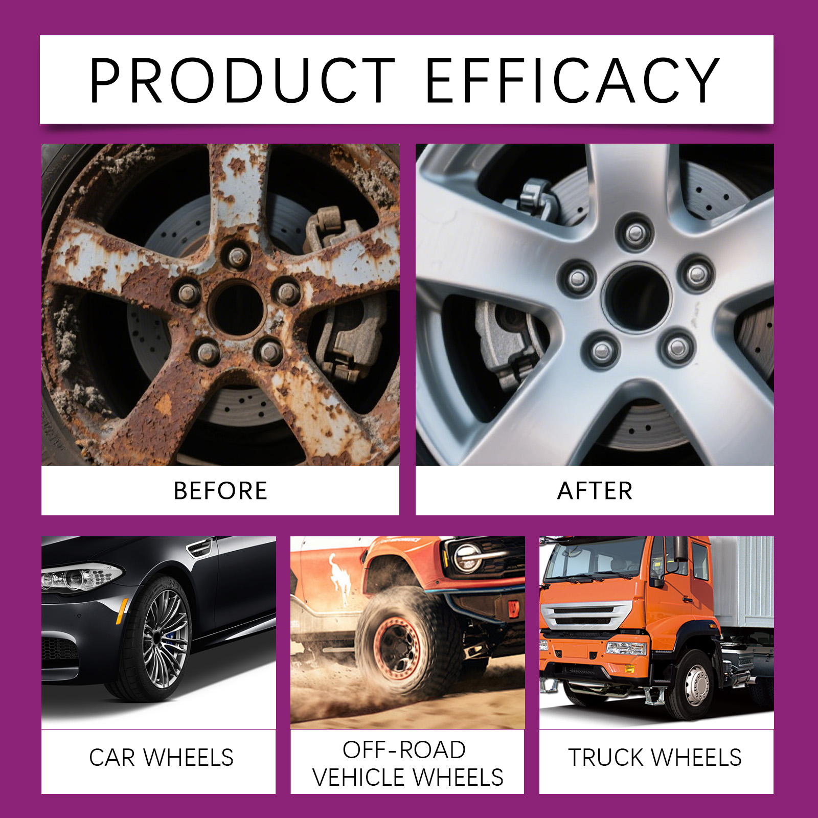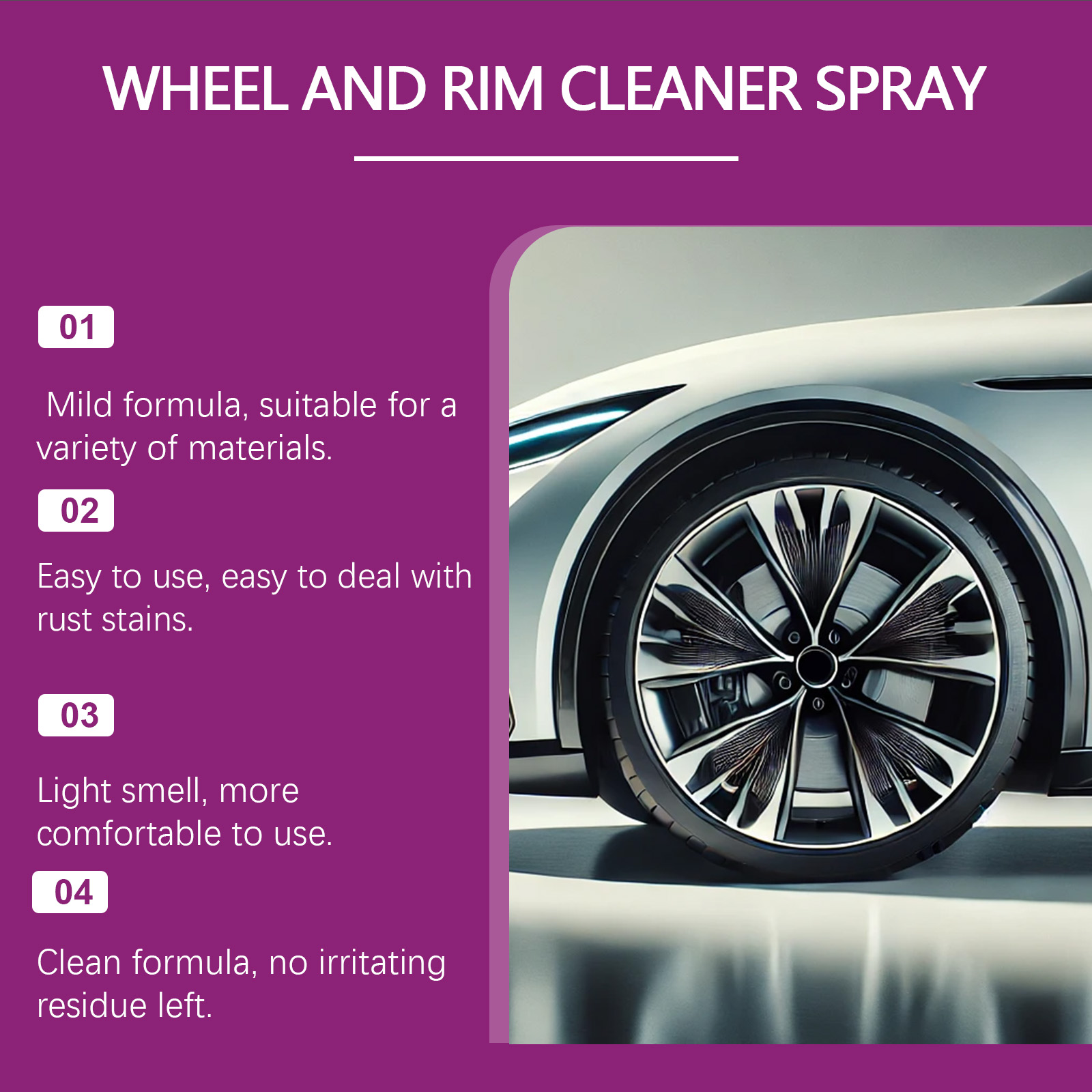 我们的轮毂清洁喷雾,由脂肪醇聚氧乙烯醚、二乙二醇丁醚精心调配而成。专为快速分解锈迹,恢复轮子的自然颜色,对金属表面温和无害设计。使用方法极为便捷:首先,清理轮胎上的灰尘或污垢。将产品均匀地喷洒在要处理的区域。用毛巾或海绵清洁。用清水彻底冲洗干净。并且它可以轻松溶解轮毂表面的锈迹,一次喷洒即可立即清除。