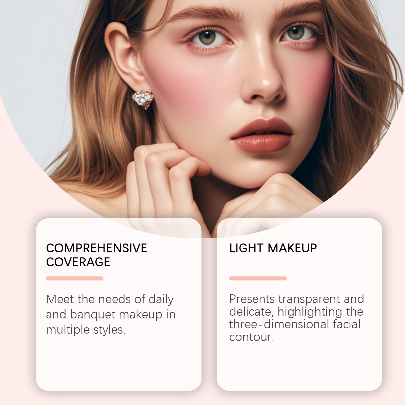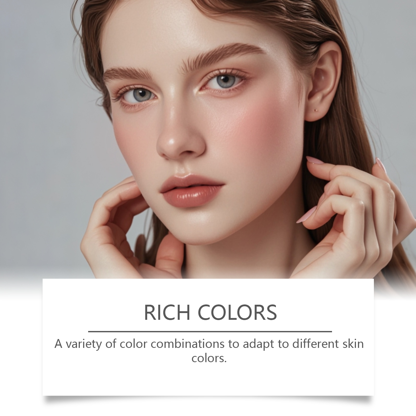 我们的彩妆盘组合套装05#,由云母、硅石精心调配而成。专为满足日常和宴会化妆的多种风格需求设计。使用方法极为便捷:1.清洁面部肌肤并进行基础护肤。2.使用匹配的化妆刷,将粉底均匀涂抹在面部所需区域,如颧骨或下颌线,直至达到理想效果。3.使用与之相匹配的化妆刷或指尖从化妆盘上取用适量色彩。你既可以将它用作眼影、面部高光、暗影塑造或腮红,也可将其涂抹于眼睑、前额、鼻梁颧骨及其他需要突出和修饰的部位。并且可以呈现透明且精致的妆效,突出面部三维轮廓。