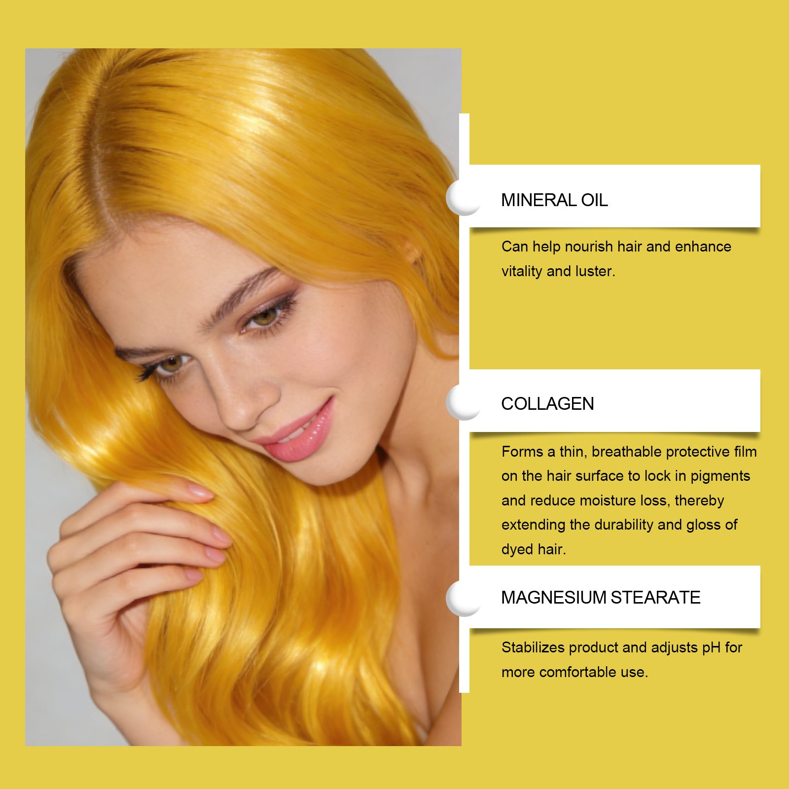 我们的黄色临时美发膏,由硫酸镁、硬脂酸镁精心调配而成。专为补充颜色,使色调更加均匀设计。使用方法极为便捷:1.清洁头发并保持干燥。2.将适量本产品涂抹于头发上。3.让其自然风干。4.不再需要时清洗掉。并且可以为头发注入水分并缓解干燥。