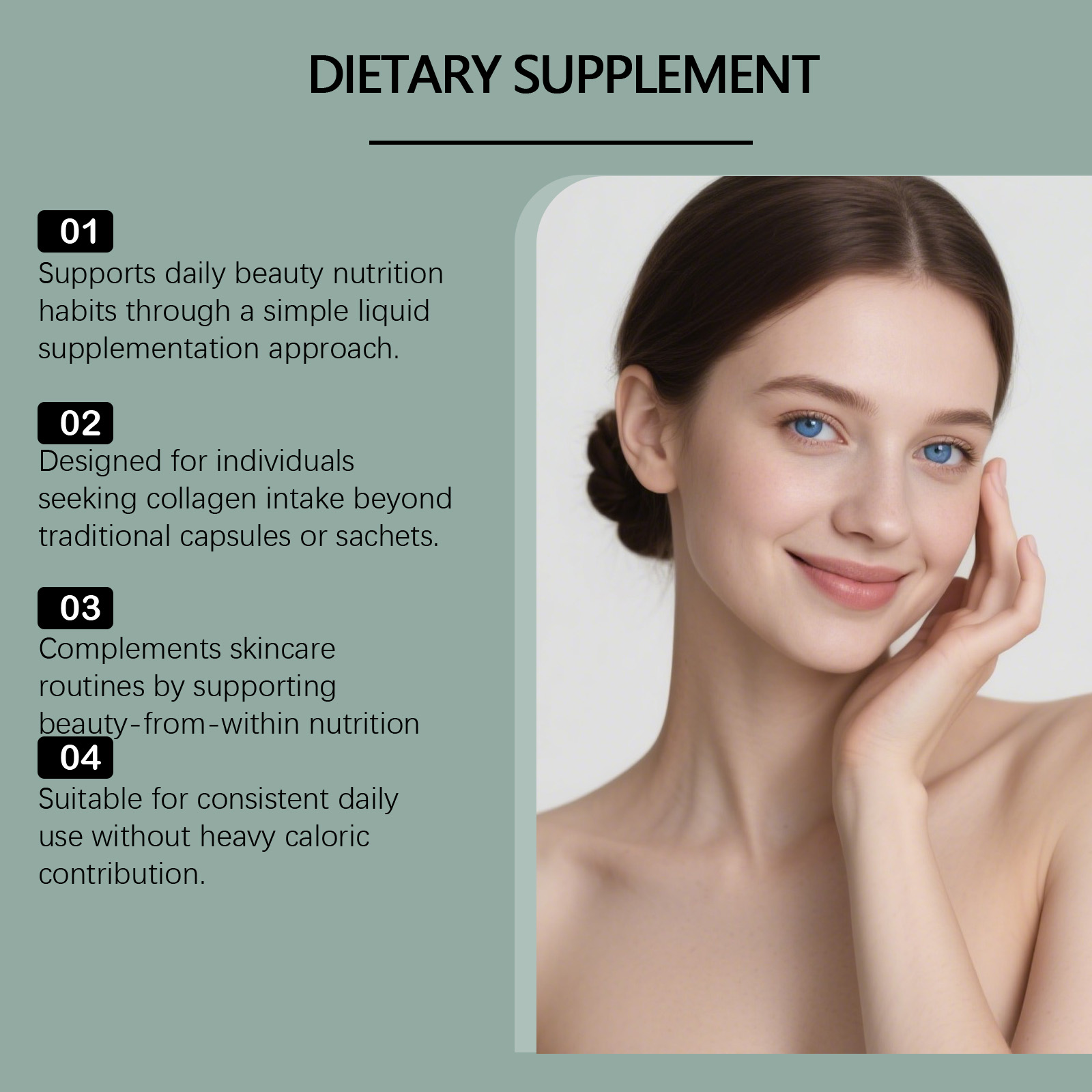 我们的胶原蛋白肽口服滴剂 ,由芦荟提取物、绿茶提取物精心调配而成。专为口服液体设计,支持每日胶原蛋白补充,无需药片或粉末。使用方法极为便捷:每天服用1毫升,可直接服用或与其他食物混合。并且它包含多种胶原蛋白类型,以支持全面的日常结构营养需求。