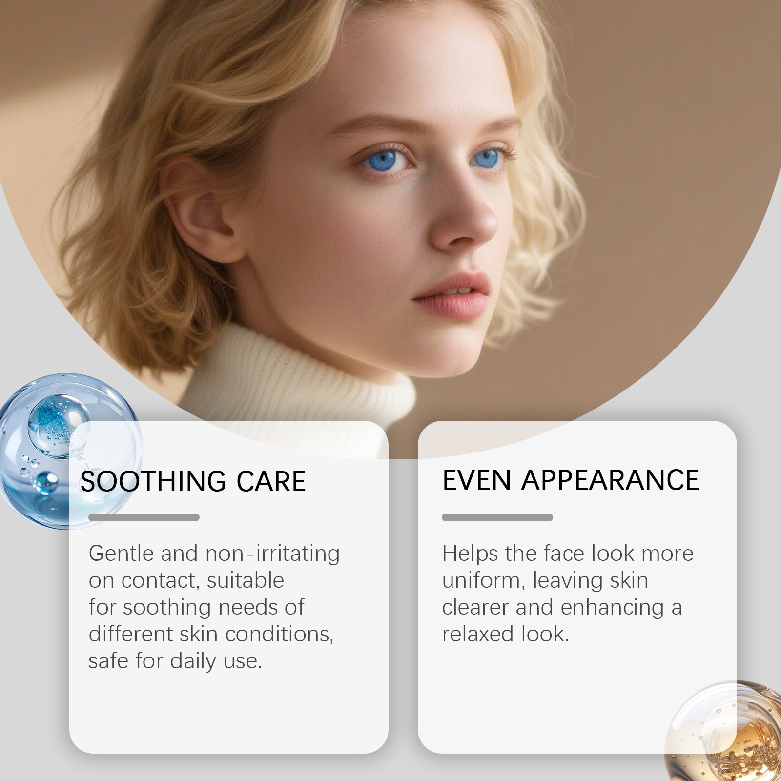 我们的面部舒适精华液,由库拉索芦荟提取物、乙酰壳糖胺精心调配而成。专为肌肤提供适度保湿,保持舒适水润的表面设计。使用方法极为便捷:1.清洁皮肤并拍干。2.将适量本产品均匀涂抹于面部。3.轻柔按摩至完全吸收。并且可以舒缓肌肤,提升护理过程中的舒适感。