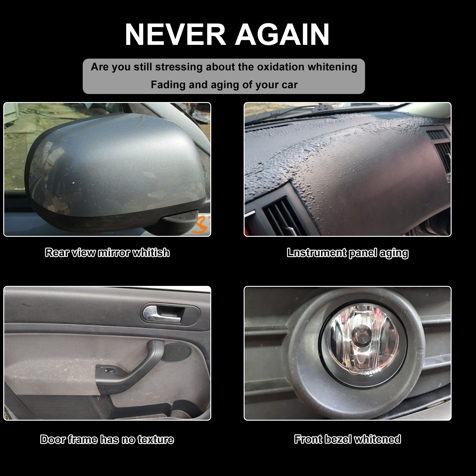 我们的汽车塑料翻新剂含有EDTA二钠、碳酸氢钠、月桂醇聚醚-7。它可以有效地翻新汽车内饰中的塑料件、真皮座椅和其他内饰部件,包括面板、仪表盘、门板、座椅等,使汽车焕然一新。它的使用方法很简单:将本品均匀地喷在海绵上,然后在车表面轻轻擦拭,最后用毛巾擦亮即可。可以有效去除表面油污、灰尘、指纹和污渍,形成保护层。