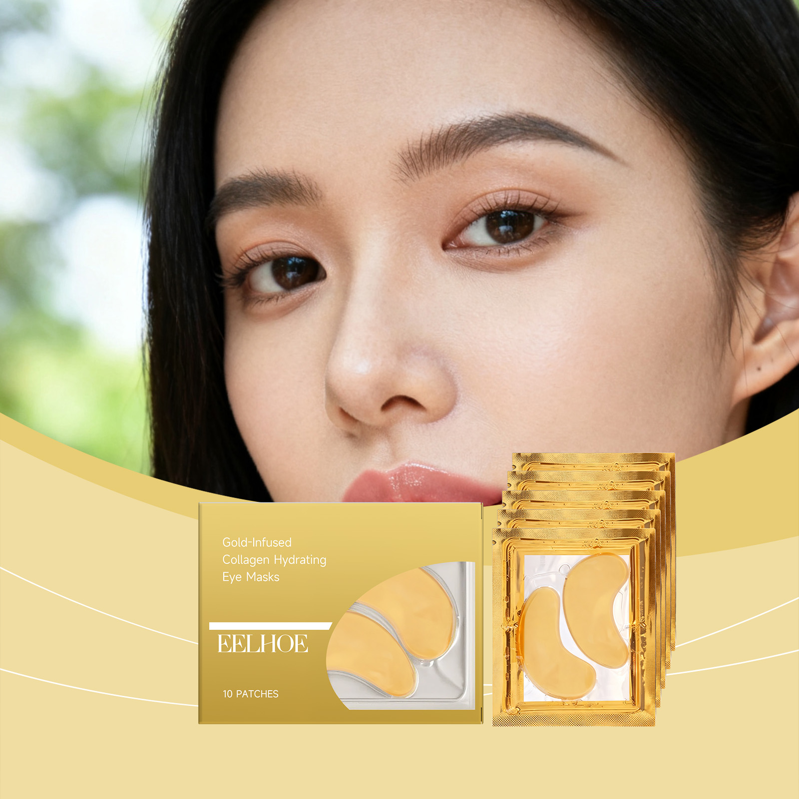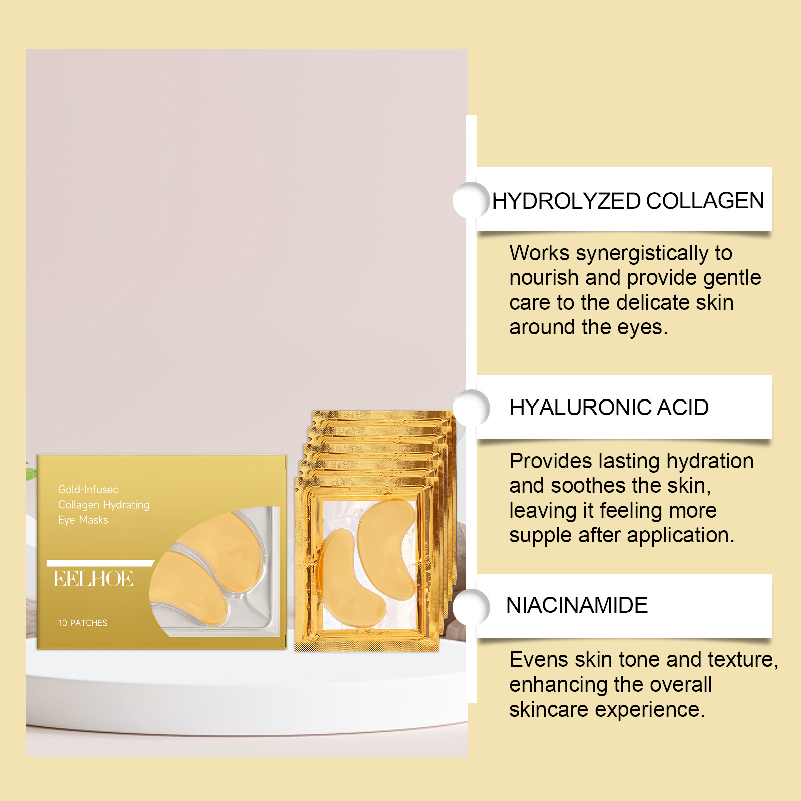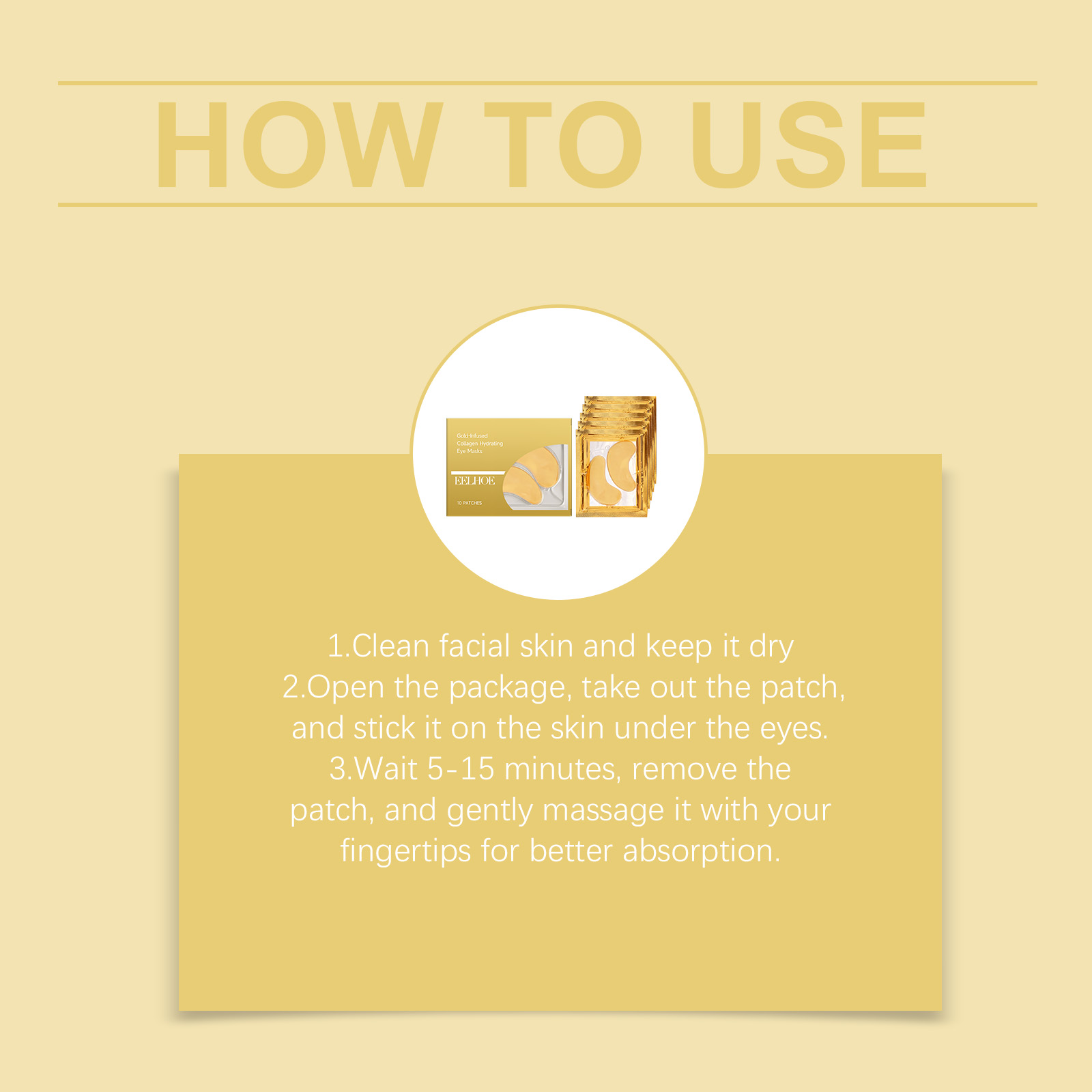 我们的胶原保湿黄金眼膜,由烟酰胺、抗坏血酸(维生素C)精心调配而成。专为疲惫的眼睛注入活力,恢复明亮设计。使用方法极为便捷:1.清洁面部皮肤并保持干燥。2.打开包装,取出贴片,并将其贴在眼下的皮肤上。3.等待5-15分钟,取下贴片,并用指尖轻轻按摩,以促进吸收。并且可针对眼部浮肿,打造紧致眼周轮廓。