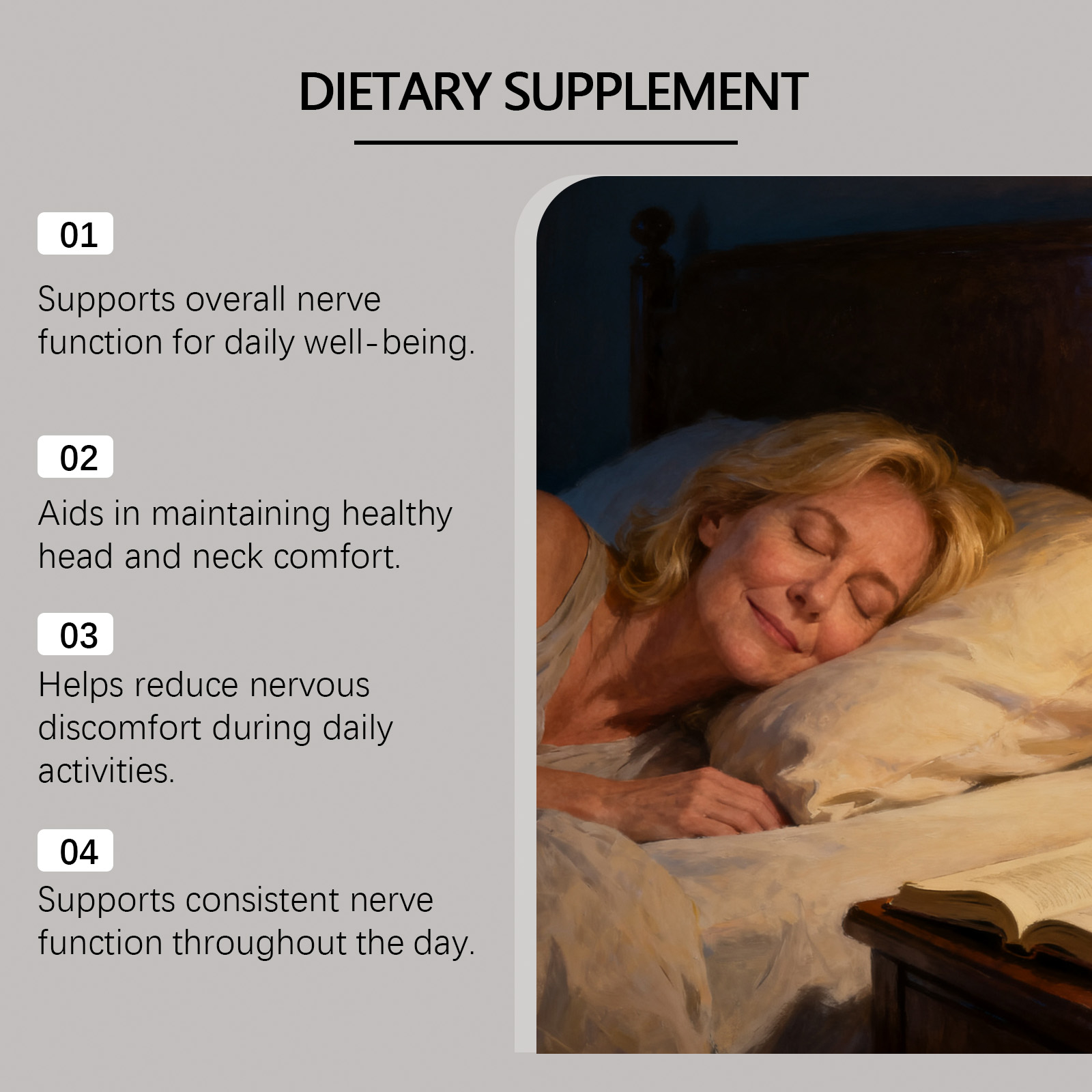 我们的睡眠复合胶囊,由姜黄根、山楂果精心调配而成。专为支持神经系统活力与日常功能,帮助镇静舒缓神经系统状态设计。使用方法极为便捷:每日2次,每次服用2粒胶囊,用水送服。并且它可以助力维持良好睡眠质量状态,补充营养,维持神经正常功能。