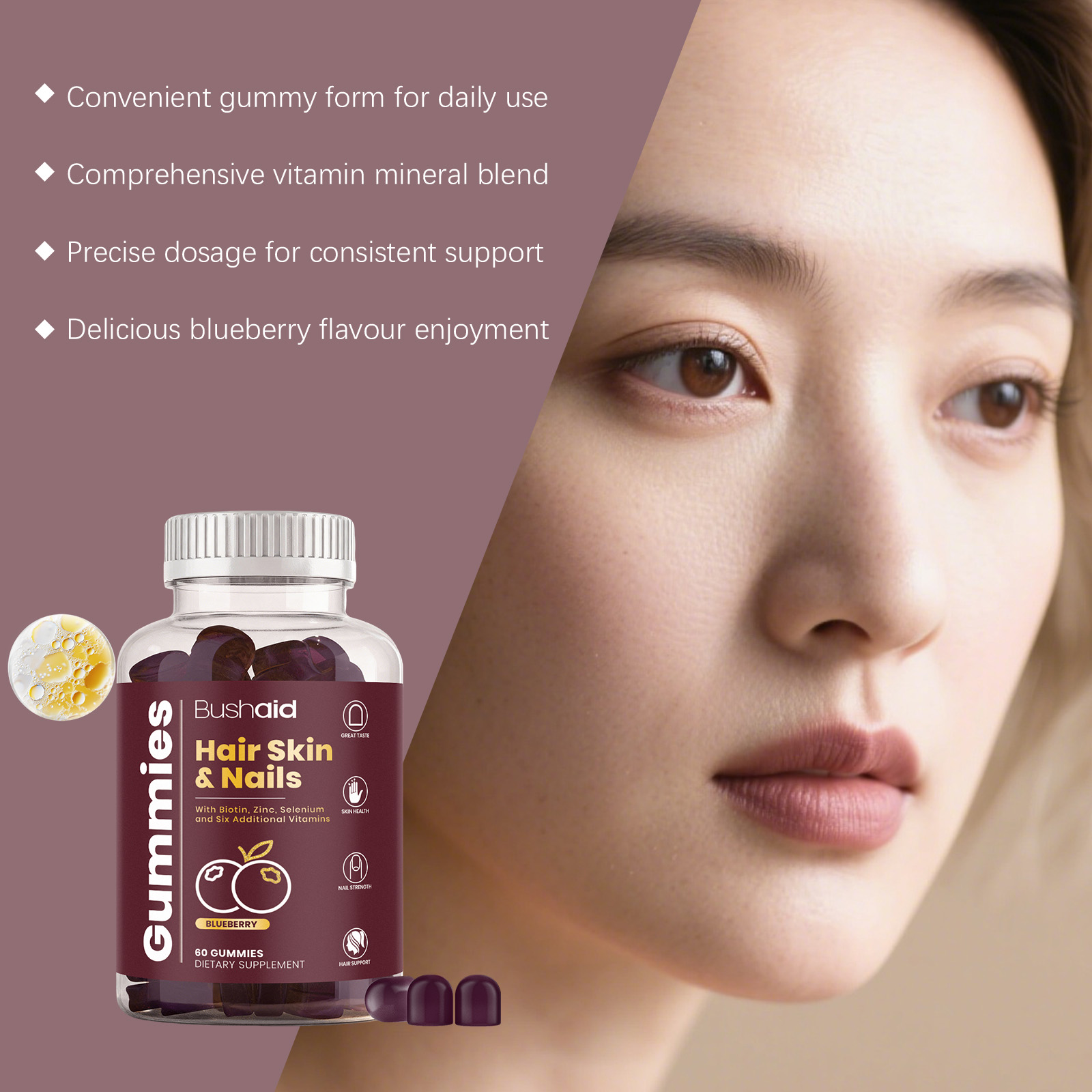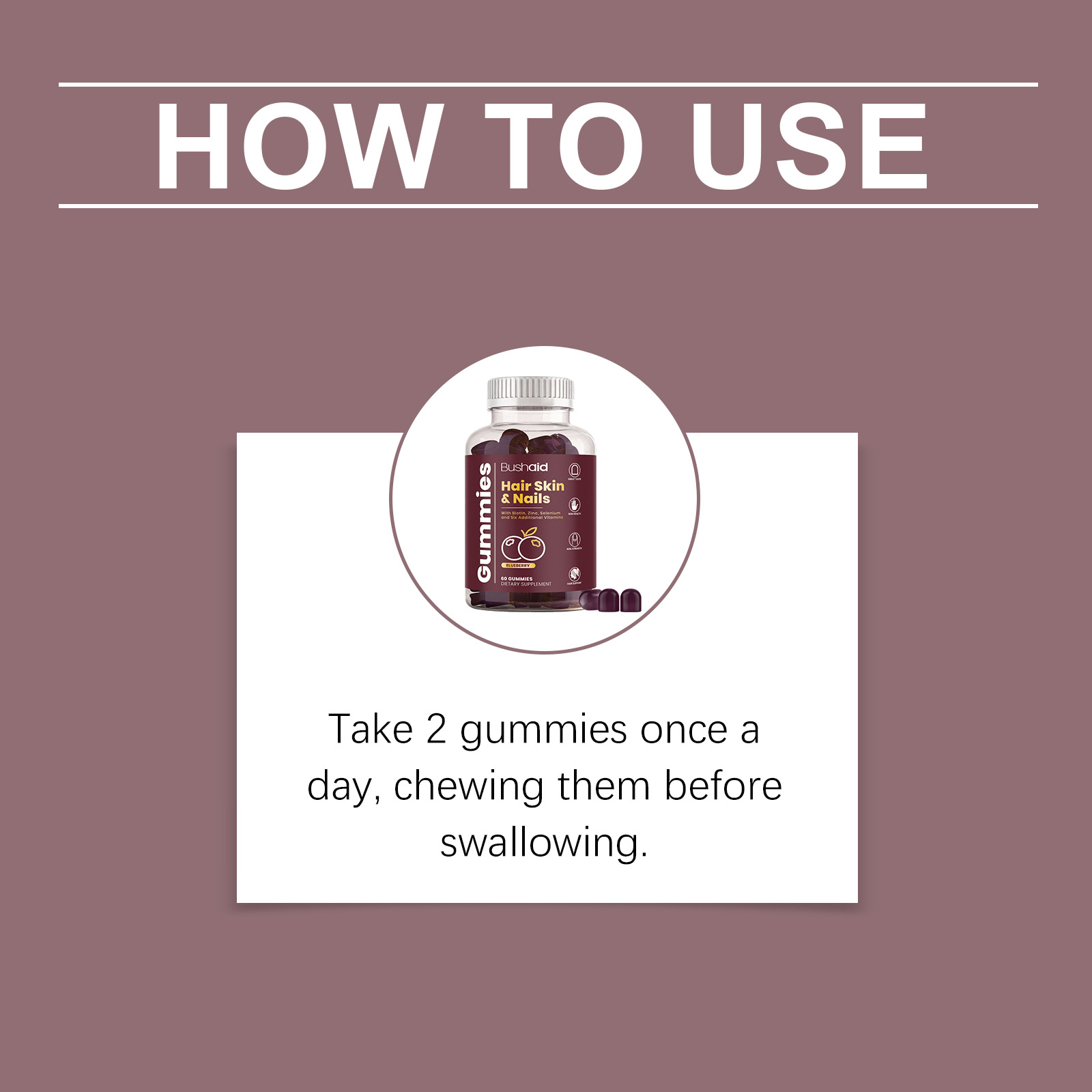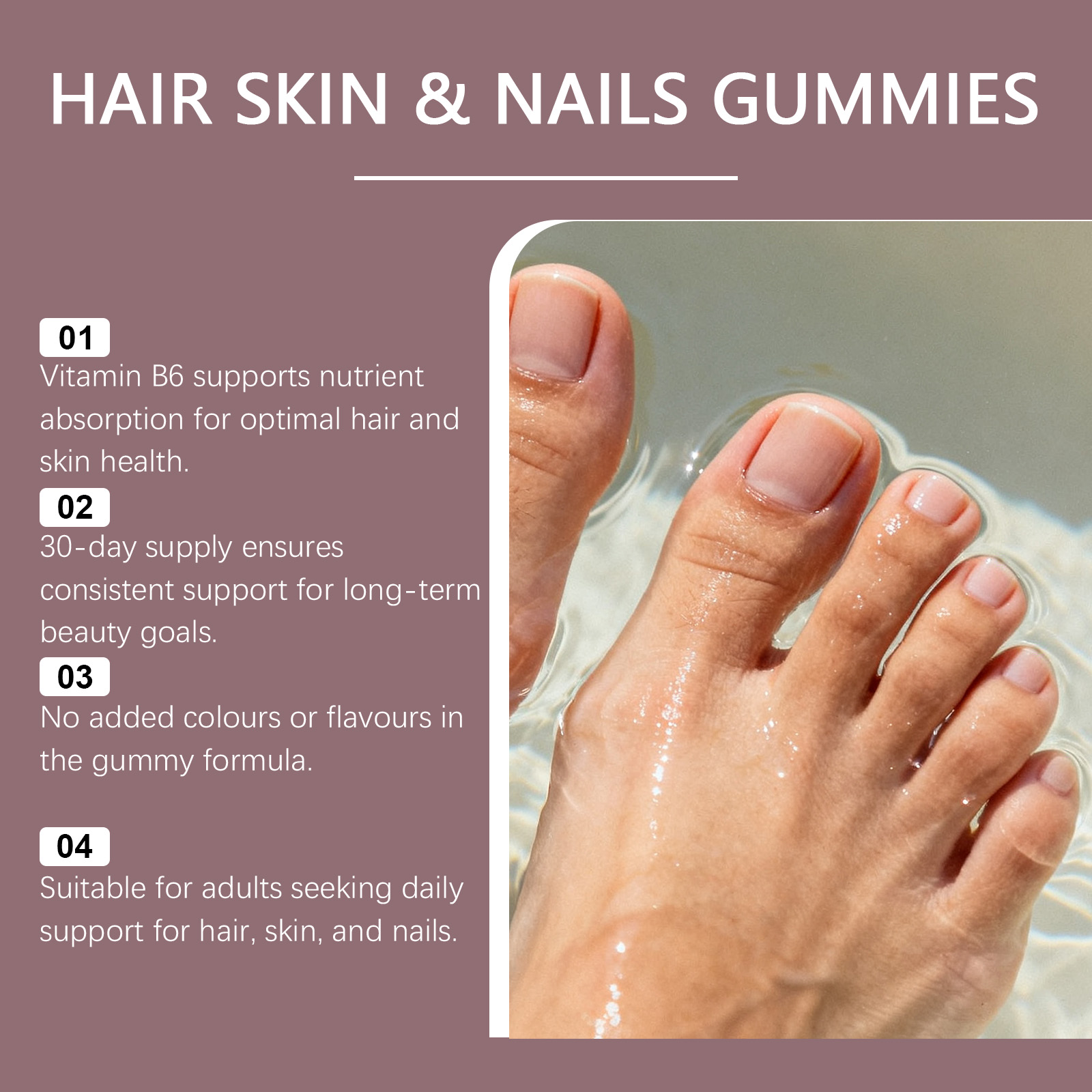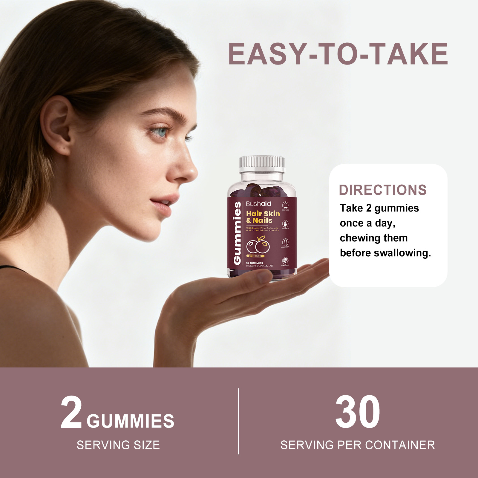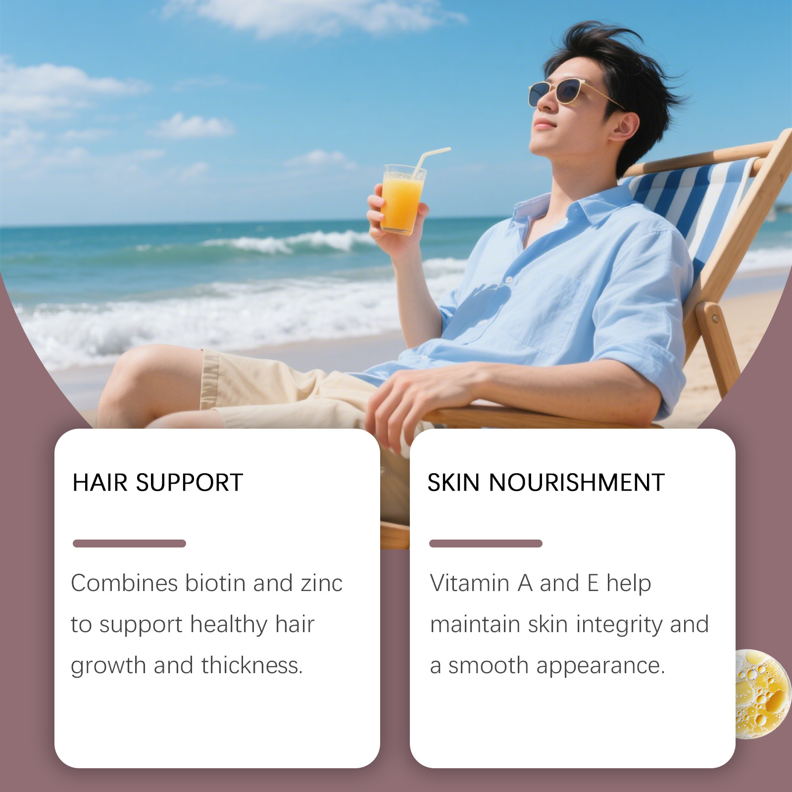 我们的身体健康支持软糖,由生物素、锌精心调配而成。专为促进头发健康生长,提升肌肤光泽设计。使用方法极为便捷:每日服用 2 颗软糖,服用前先咀嚼,然后吞咽。并且它可以增强指甲韧性,维护整体美貌。