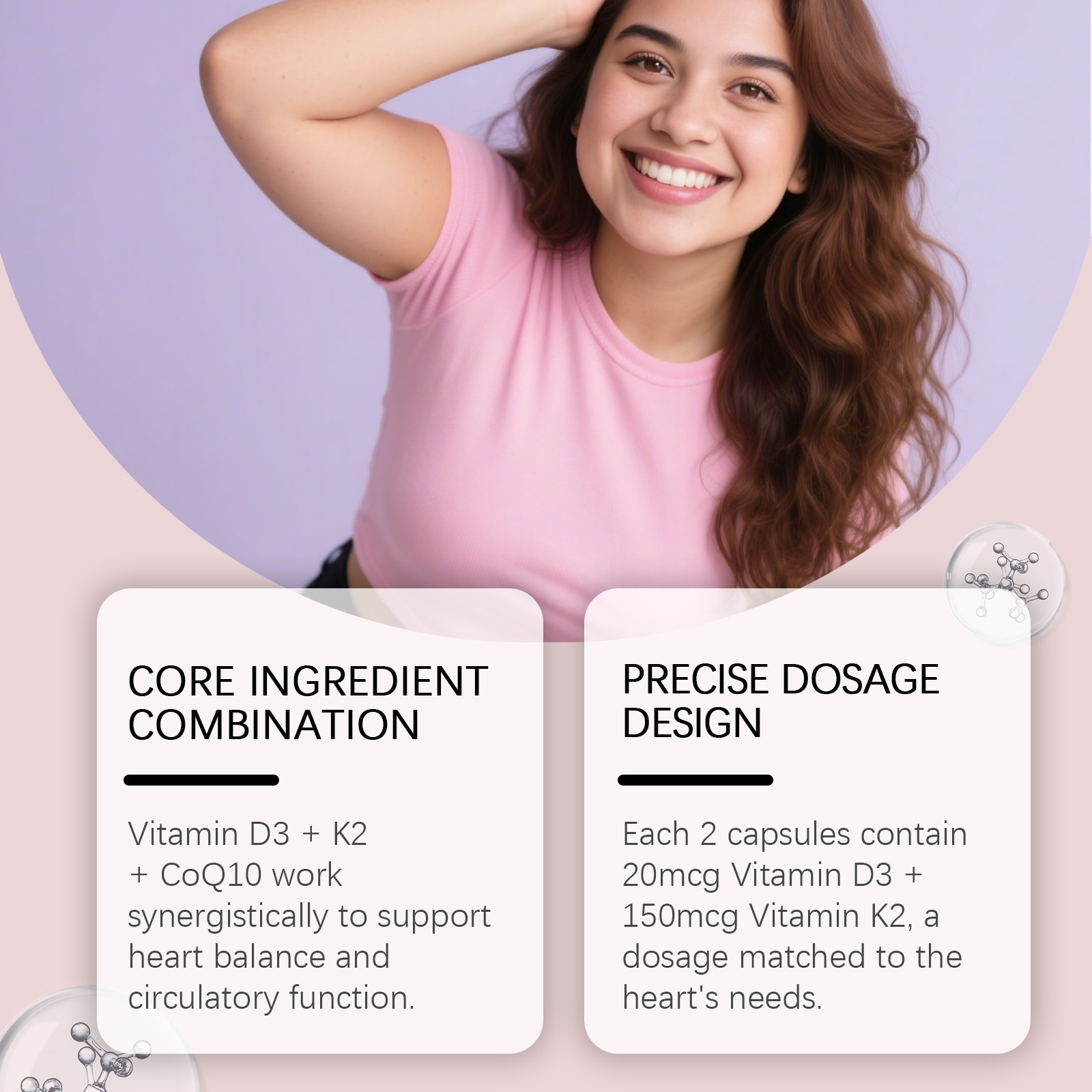 我们的心脏健康支持胶囊,由维生素D3(胆钙化醇)、维生素K2(作为甲萘醌-7,MK-7)精心调配而成。专为维持心脏,平衡状态,支持循环,代谢功能设计。使用方法极为便捷:每日餐前服用2粒,用水送服。并且它可以促进能量,供给效率,血管健康,心脏支持。