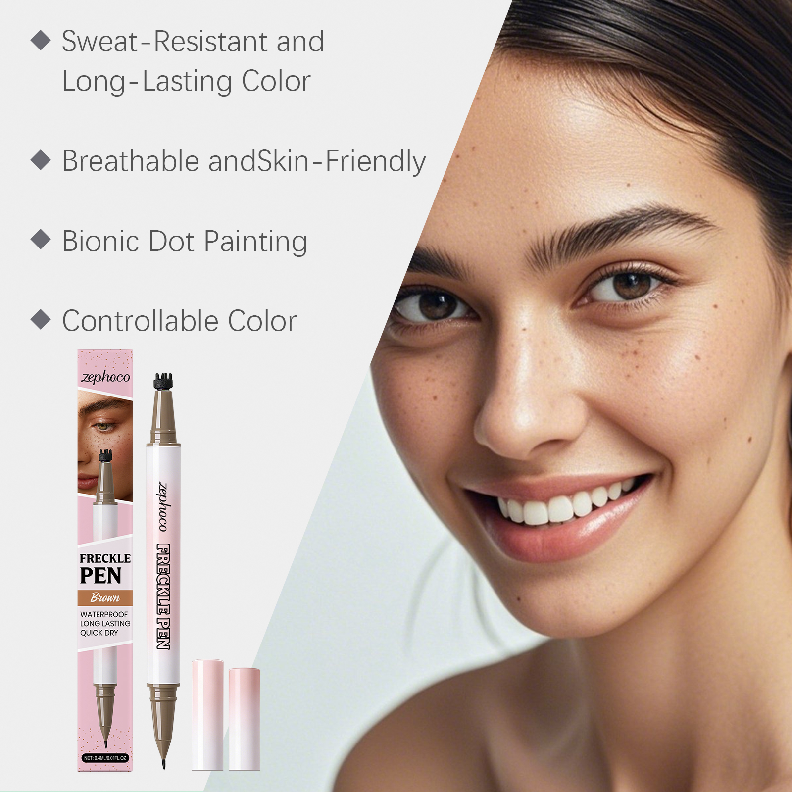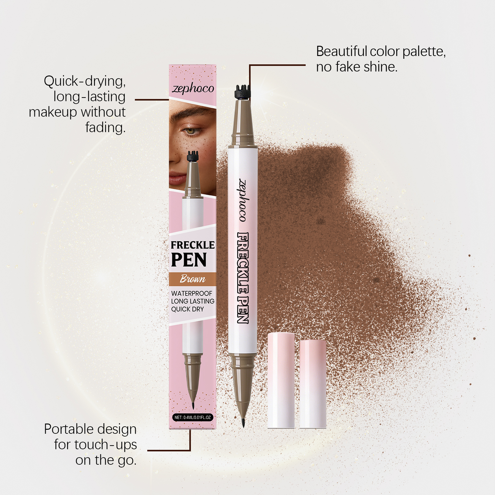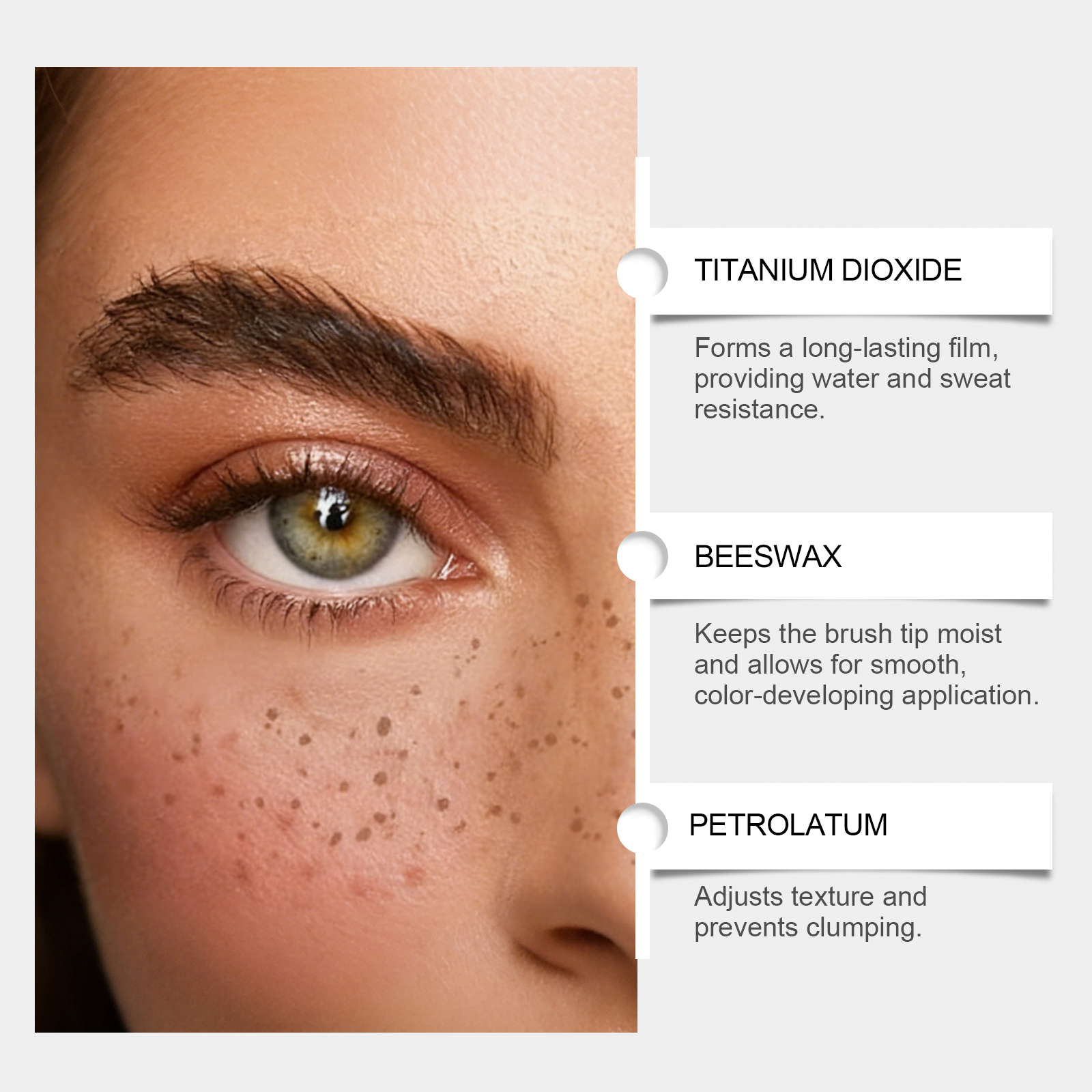 我们的双头雀斑笔(棕色),由矿油、蜂蜡精心调配而成。专为模拟真实雀斑的明暗过渡,打造自然外观设计。使用方法极为便捷:1.在洁净干燥的面部底妆后使用雀斑笔。2.选择所需的雀斑笔头,轻点雀斑笔于鼻梁、颧骨等部位,模拟自然雀斑分布。3.用手指或美妆蛋轻轻拍打,使雀斑边缘柔和、自然融合。4.可根据妆容需求逐层叠加调整雀斑浓淡。并且它可以可叠加于粉底之上,抵抗底妆并防止斑驳,简化补妆。