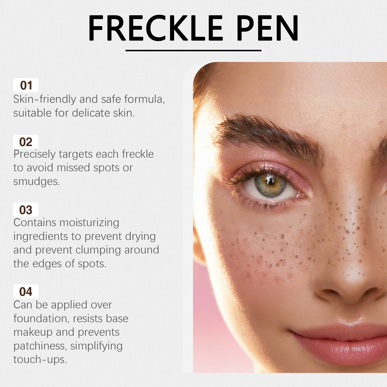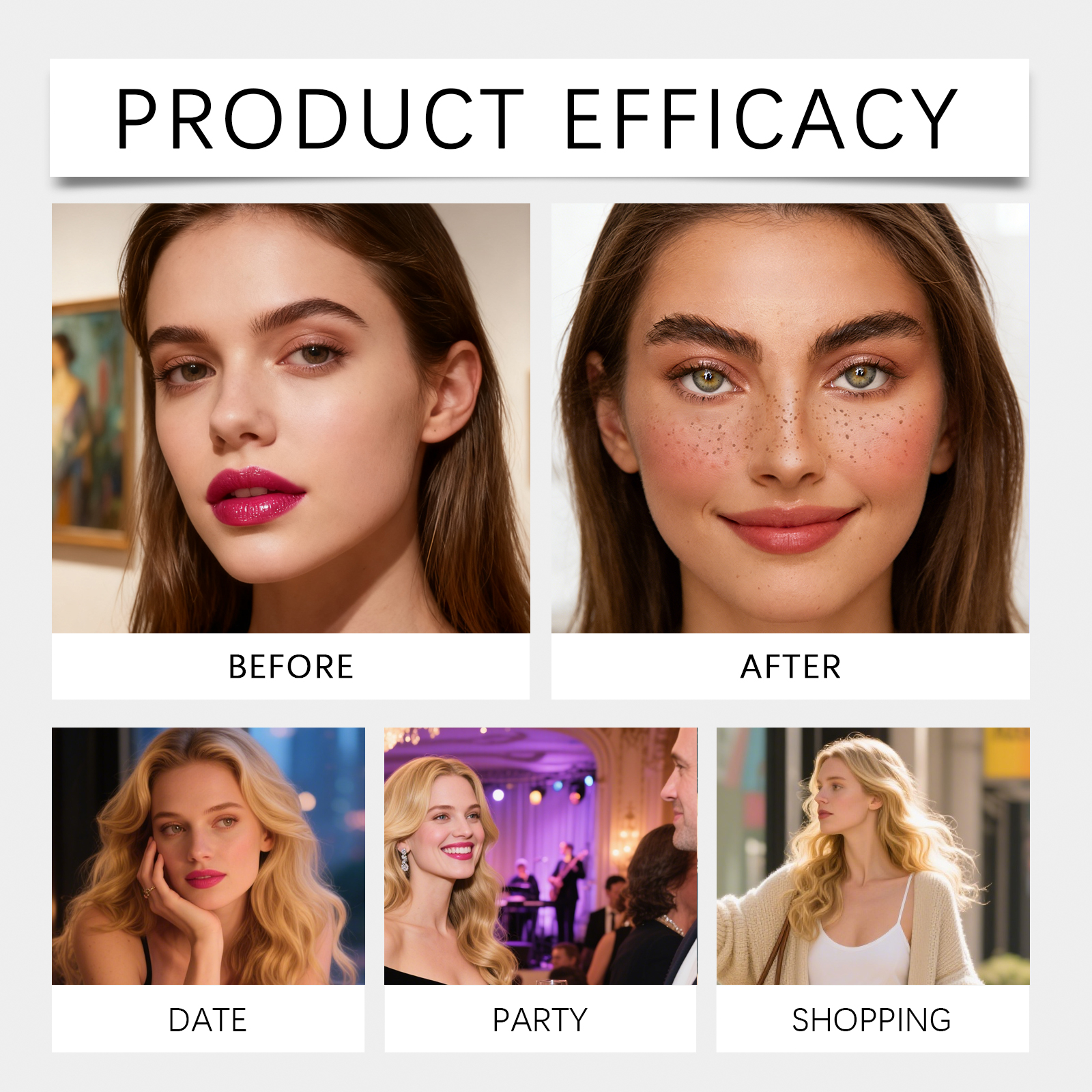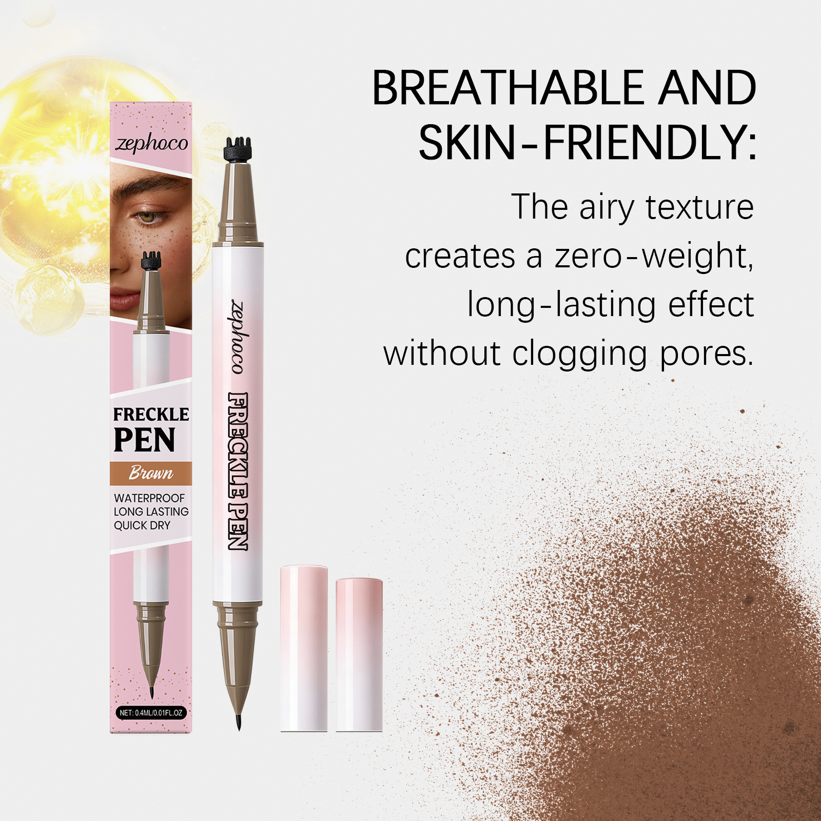 我们的双头雀斑笔(棕色),由矿油、蜂蜡精心调配而成。专为模拟真实雀斑的明暗过渡,打造自然外观设计。使用方法极为便捷:1.在洁净干燥的面部底妆后使用雀斑笔。2.选择所需的雀斑笔头,轻点雀斑笔于鼻梁、颧骨等部位,模拟自然雀斑分布。3.用手指或美妆蛋轻轻拍打,使雀斑边缘柔和、自然融合。4.可根据妆容需求逐层叠加调整雀斑浓淡。并且它可以可叠加于粉底之上,抵抗底妆并防止斑驳,简化补妆。