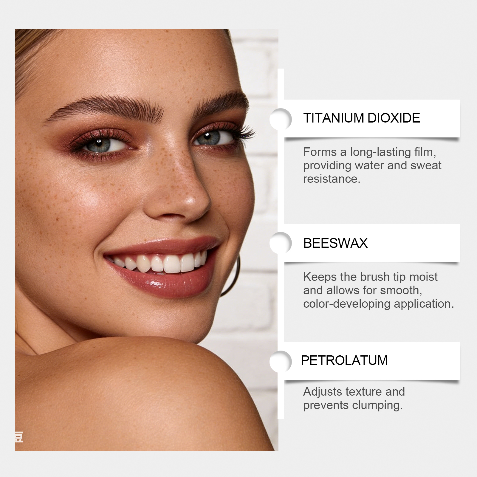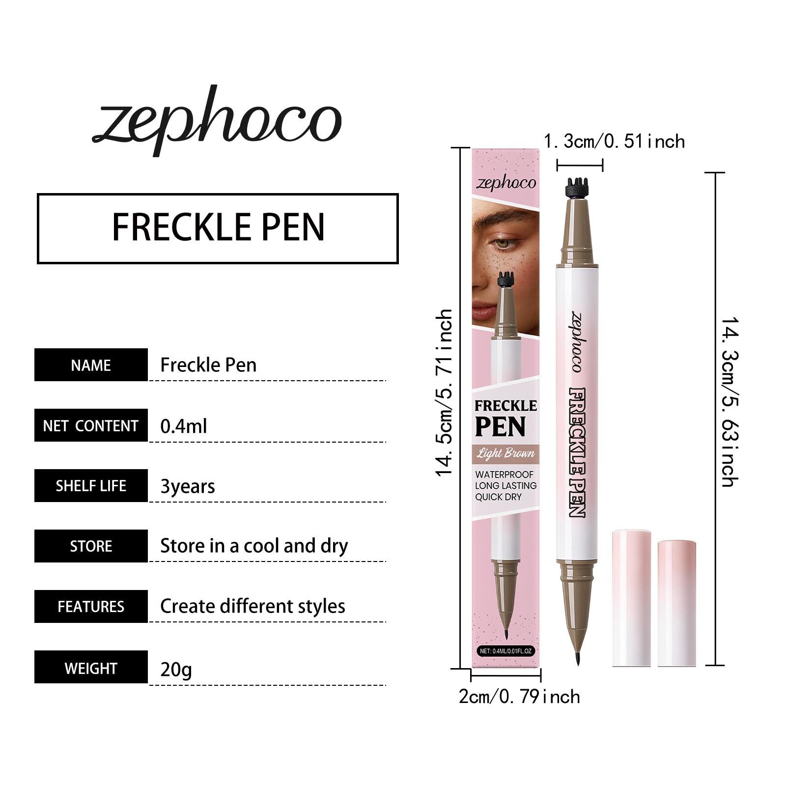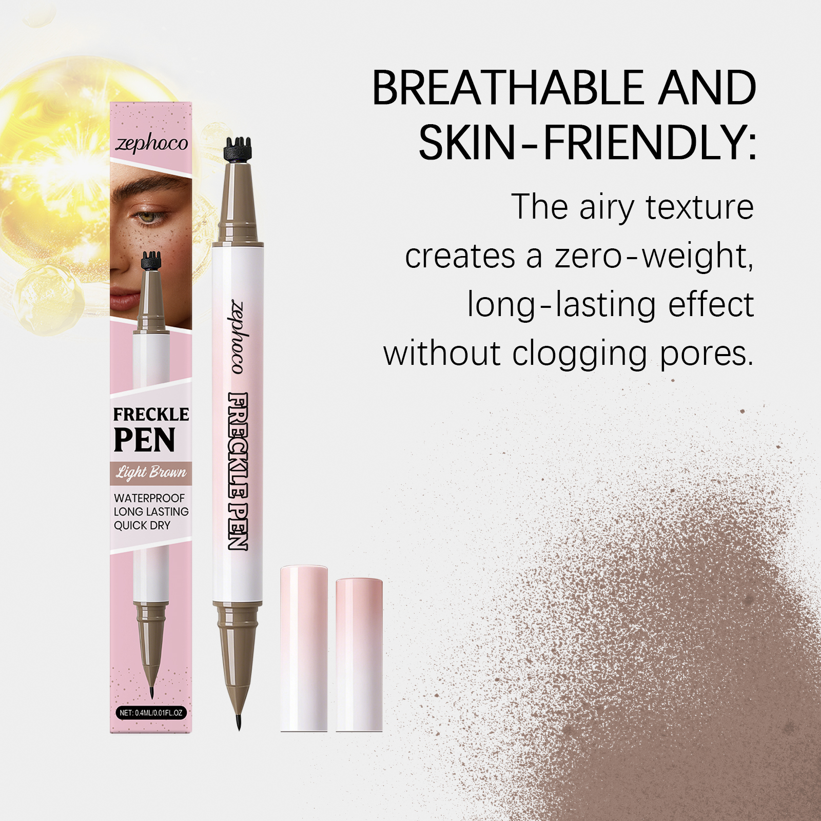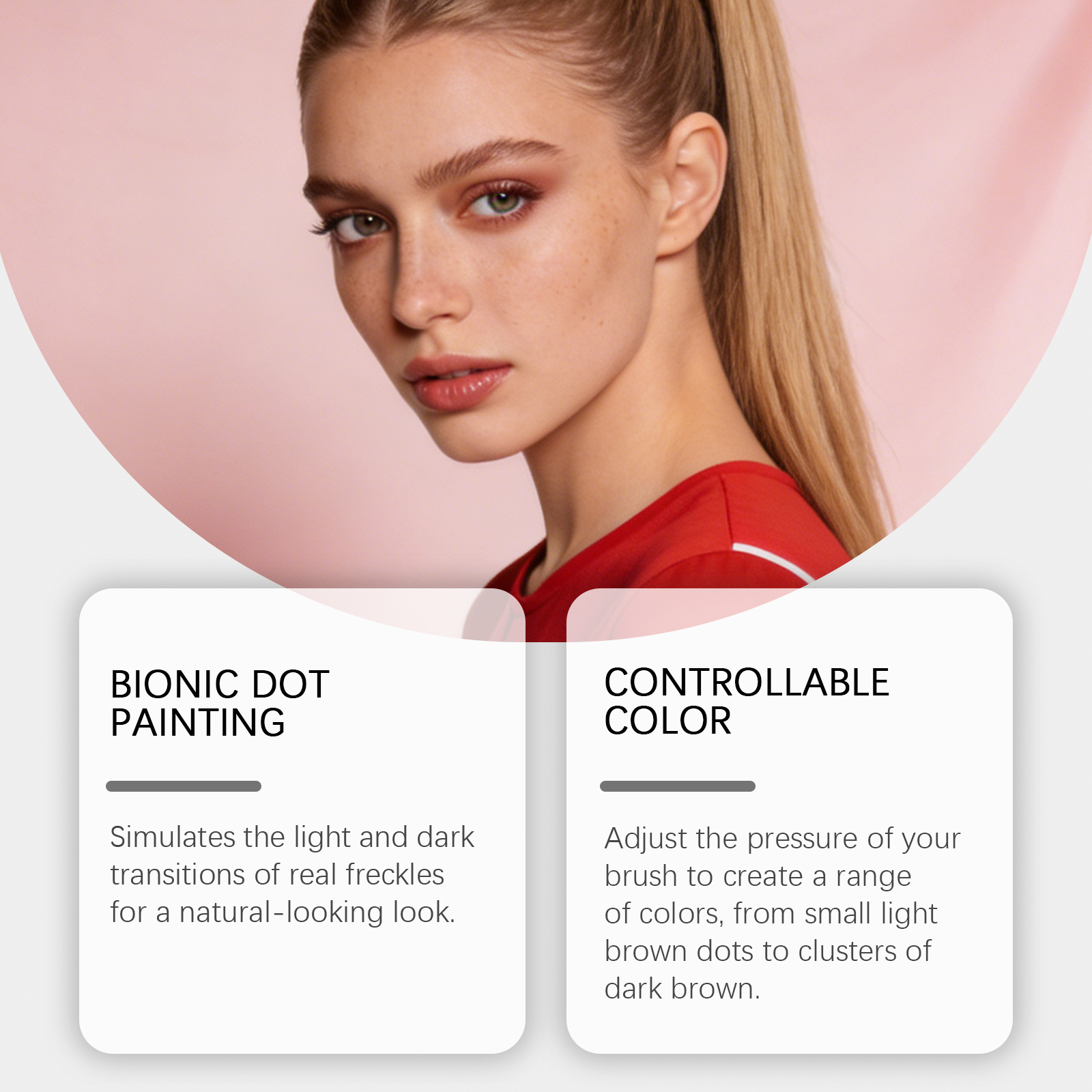 我们的深棕色双头雀斑笔,由矿油、蜂蜡精心调配而成。专为模拟真实雀斑的明暗过渡,打造自然外观设计。使用方法极为便捷:1.在洁净干燥的面部底妆后使用雀斑笔。2.选择所需的雀斑笔头,轻点雀斑笔于鼻梁、颧骨等部位,模拟自然雀斑分布。3.用手指或美妆蛋轻轻拍打,使雀斑边缘柔和、自然融合。4.可根据妆容需求逐层叠加调整雀斑浓淡。并且它可以可叠加于粉底之上,抵抗底妆并防止斑驳,简化补妆。