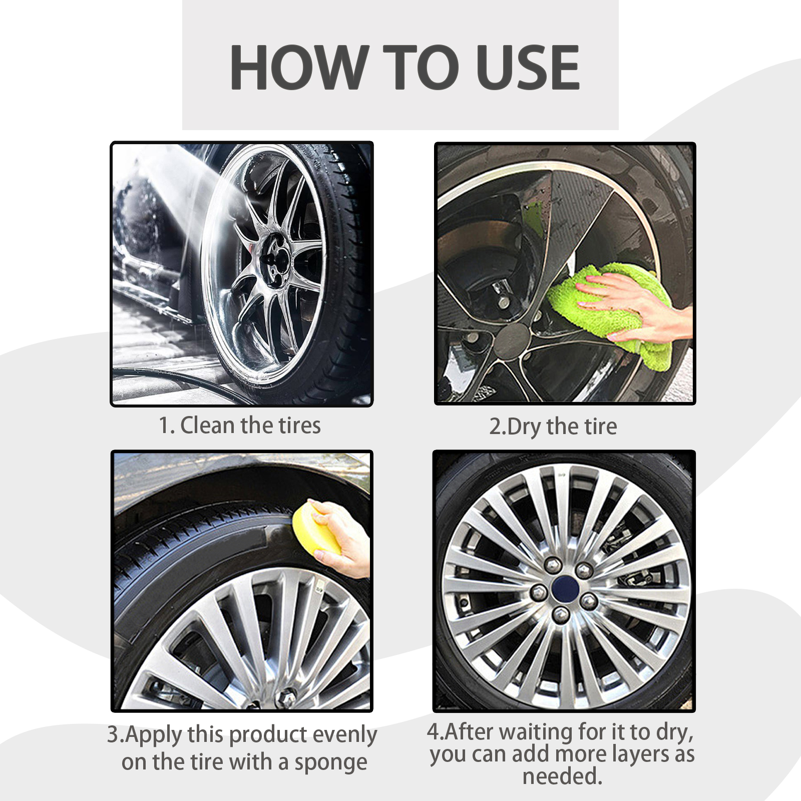 我们的汽车轮胎翻新蜡含有棕榈蜡、硅油、光亮剂。它可以恢复轮胎原有的全新面貌,阻止紫外线侵蚀,避免橡胶老化和掉色,有效延长轮胎寿命。它的使用方法很简单:清洁轮胎,擦干轮胎,用海绵将本品均匀涂抹在轮胎上,等它变干后,你可以根据需要再加几层。并且可以翻新车轮。