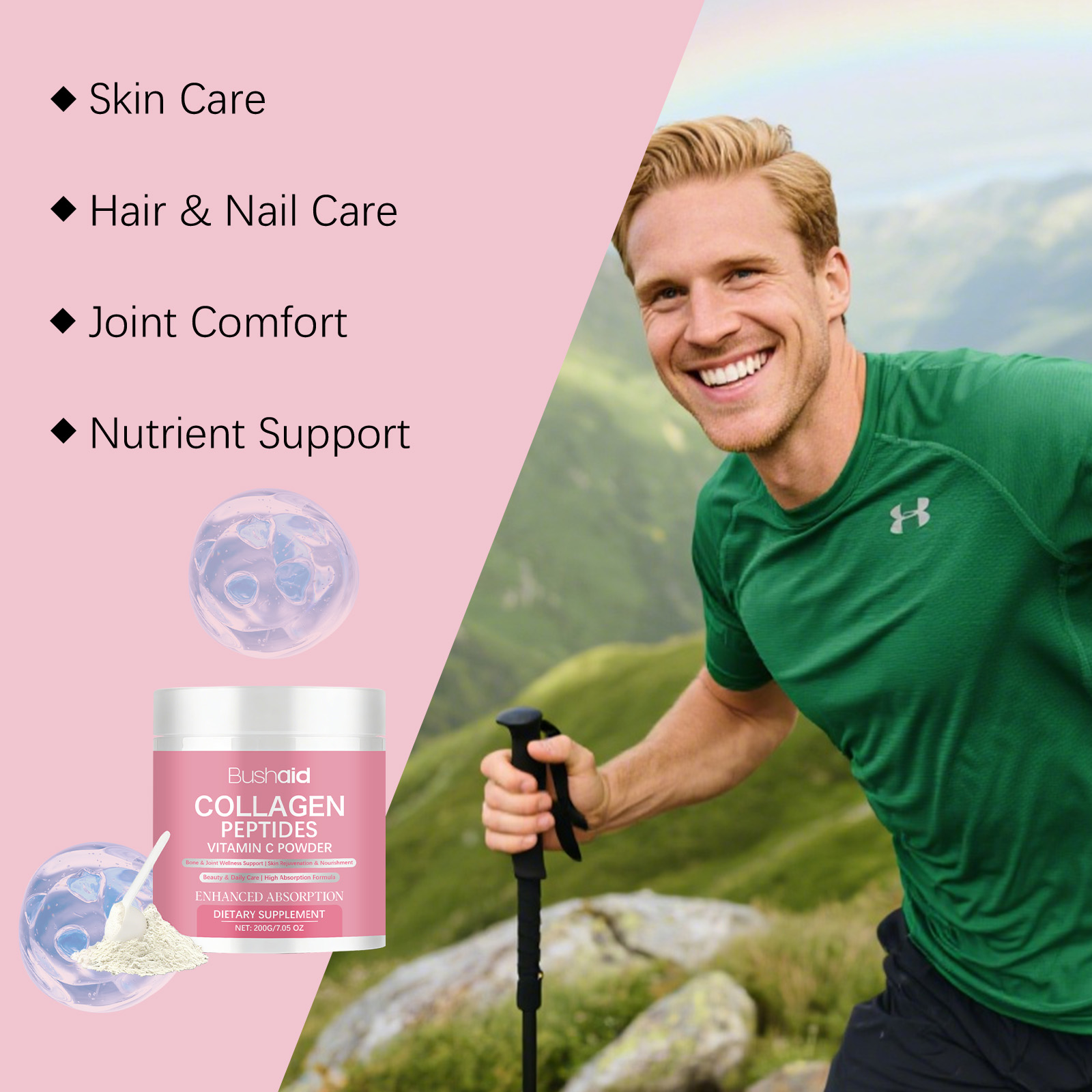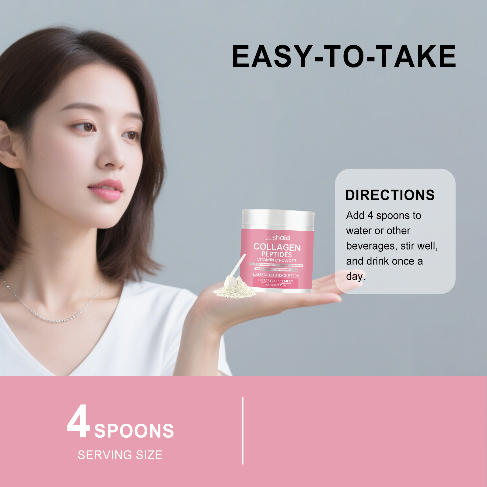 我们的胶原蛋白维生素C膳食粉,由维生素C、维生素E精心调配而成。专为维持日常皮肤水分,支持日常维护设计。使用方法极为便捷:将4勺加入水或其他饮料中,充分搅拌后每日饮用一次。并且它可以有助于日常关节健康。