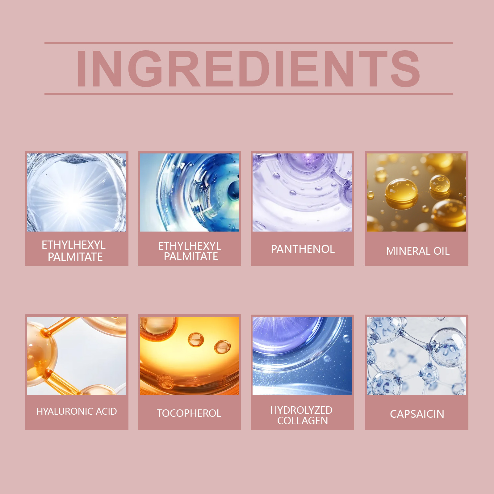 我们的丰盈润唇精华液,由水解胶原、辣椒碱精心调配而成。专为干燥嘴唇提供密集护理体验设计。使用方法极为便捷:清洁并擦干你的嘴唇。打开瓶盖,取适量本品轻柔涂抹于唇部,并等待其被吸收。并且可以帮助恢复嘴唇的光滑和饱满。