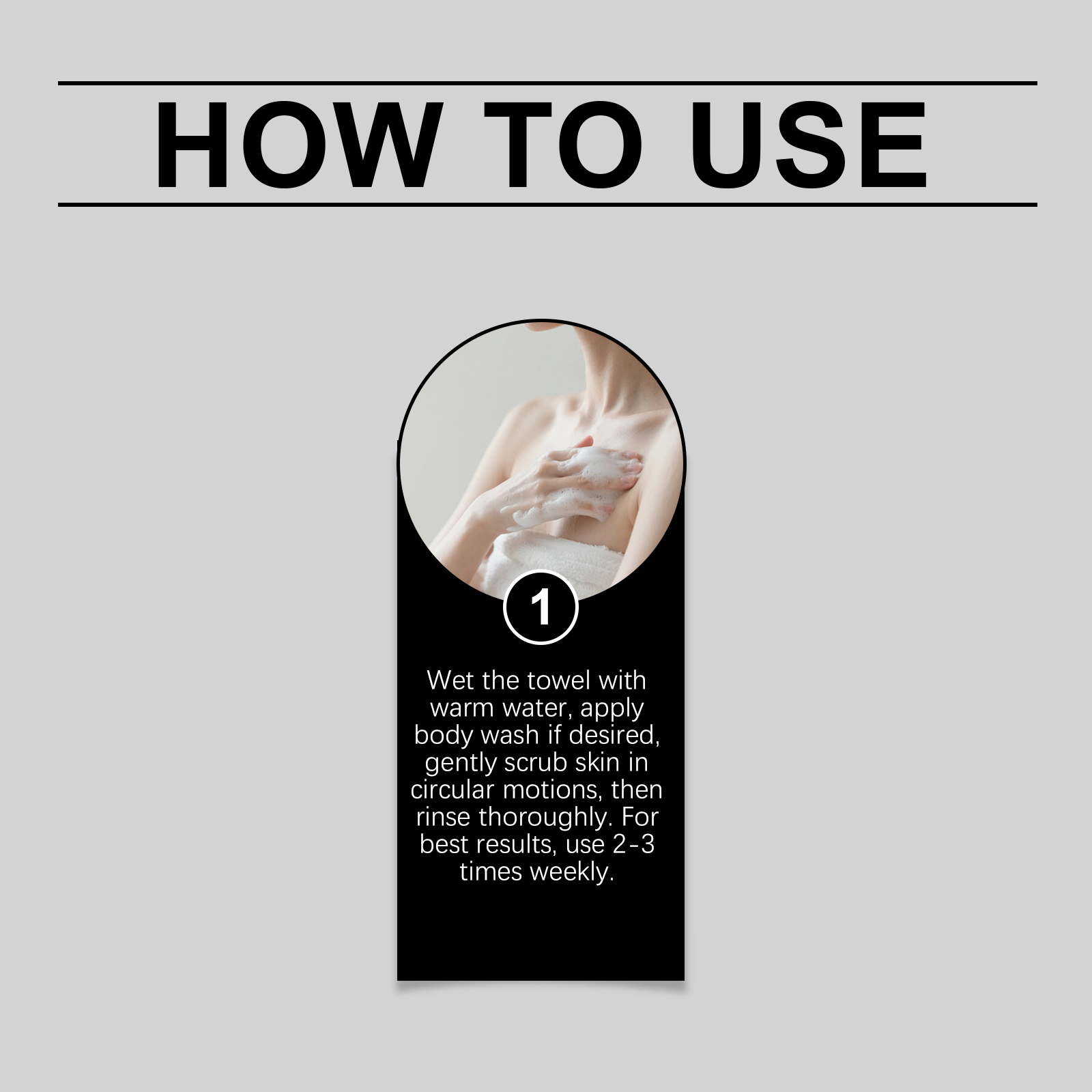 我们的去角质浴巾,由聚酯纤维、碳纤维精心制作而成。专为有效清洁皮肤而不引起刺激,提供舒适的皮肤触感设计。使用方法极为便捷:用温水浸湿毛中,如需可涂抹沐浴露,以打圈方式轻柔搓洗皮肤,然后彻底冲洗干净。为达到最佳效果建议每周使用2-3次。并且它可以提供柔软触感和耐用性能,有助于温和去角质和清洁。
