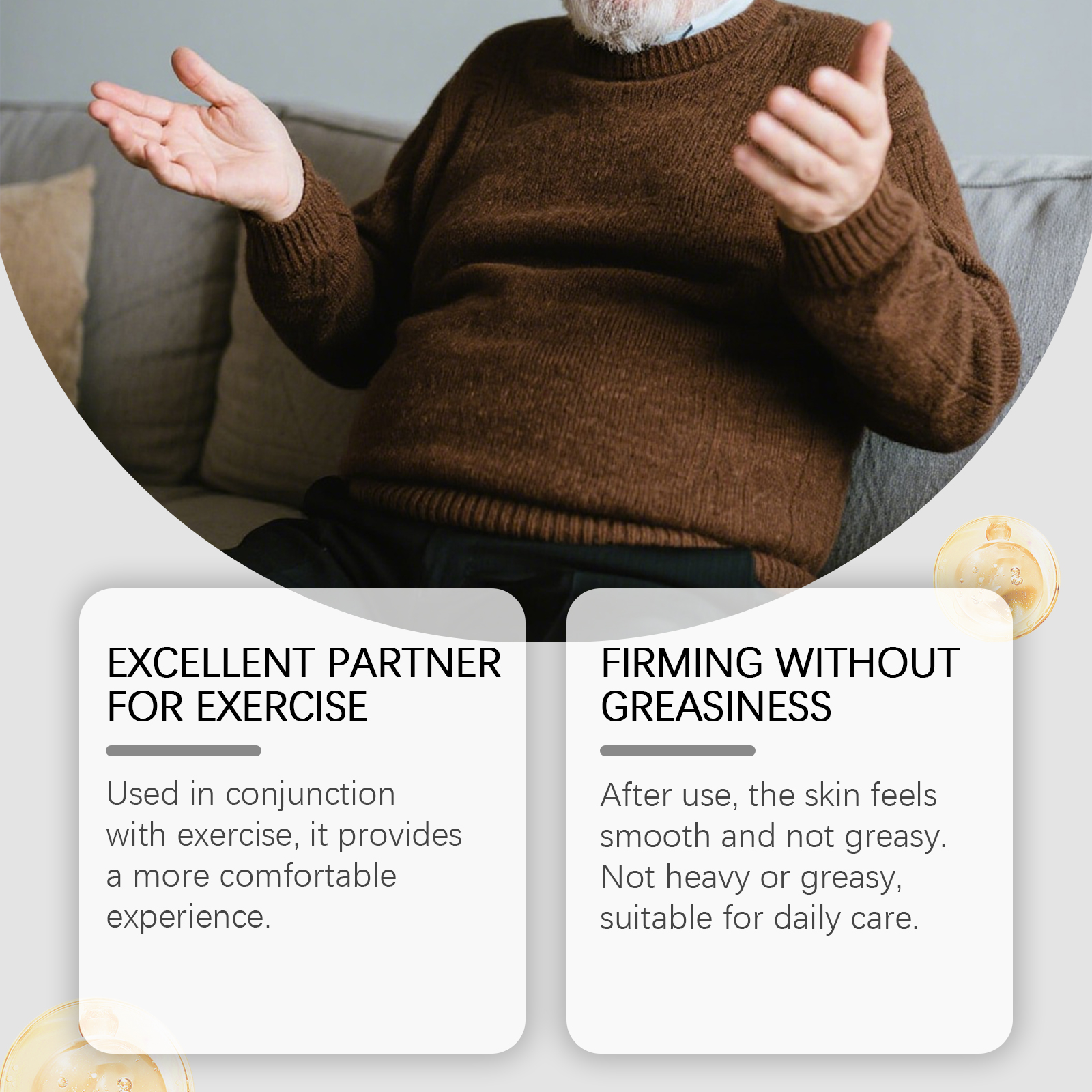 我们的身体护理精油,由葡萄籽油、牛脂、杏仁油精心调配而成。专为帮助皮肤产生温暖感并促进局部血液循环设计。使用方法极为便捷:1.彻底清洁并擦干皮肤。2.将适量本产品均匀涂抹于所需皮肤区域。3.轻轻按摩,以促进更好的吸收。并且可以在按摩过程中,感受到温热效果,有助于放松肌肉。