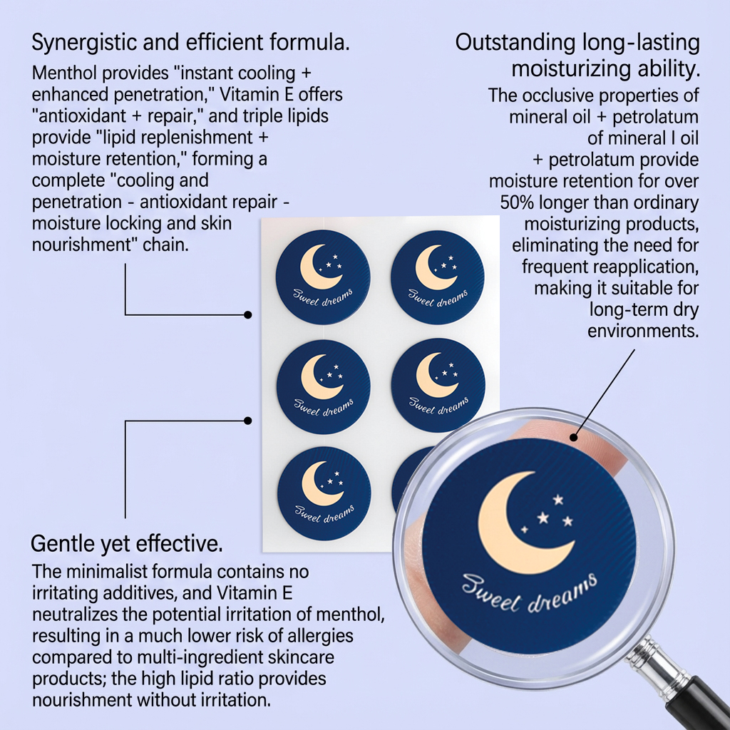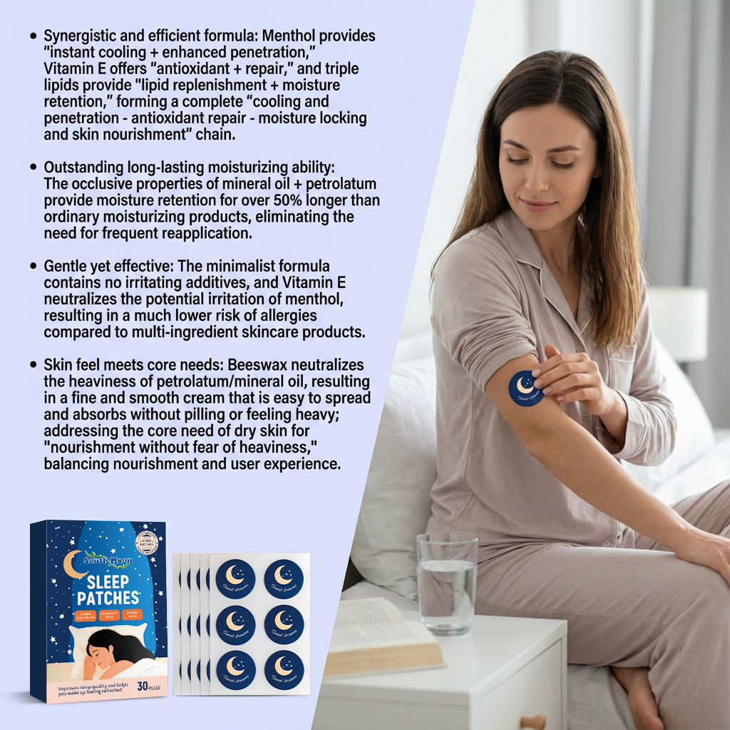我们的睡眠护理贴片,由矿油、蜂蜡精心调配而成。专为增强角质层通透性,促进维生素E深层渗透并提高修复效率设计。使用方法极为便捷:1.清洁手臂周围的肌肤并干燥。2.睡觉前撕下背胶并把本产品贴在手臂上。3.睡醒取下胶带即可。并且它可以有助于缓解轻微泛红,中和脂质系统的潜在沉重感并优化用户体验。