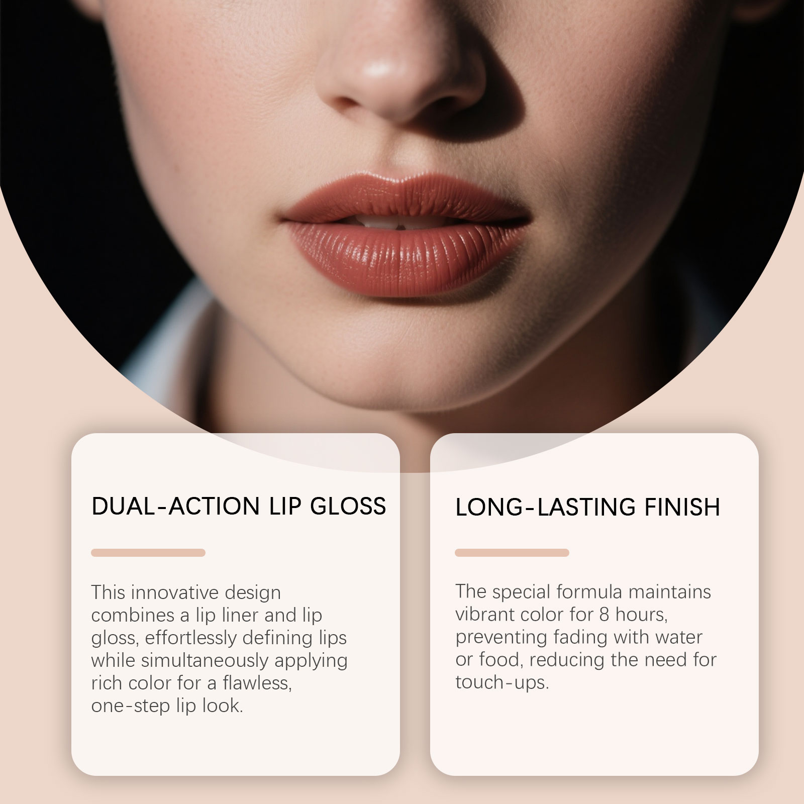 我们的二合一镜面唇釉,由改性玉米淀粉、纤维素胶精心调配而成。专为长效持妆配方防水防脱色,保持鲜艳妆效不晕染,喝水进食不易掉色,告别频繁补妆烦恼设计。使用方法极为便捷:1.清洁唇部肌肤并保持干燥。2.用唇线笔头沿唇峰及唇线勾勒。3.用唇釉一端填充唇部,均匀覆盖。画出想要的效果即可。并且它可以创新双头设计结合精细唇线笔与高显色唇釉,一笔勾勒完美唇形同时饱满上色,轻松打造立体唇妆。