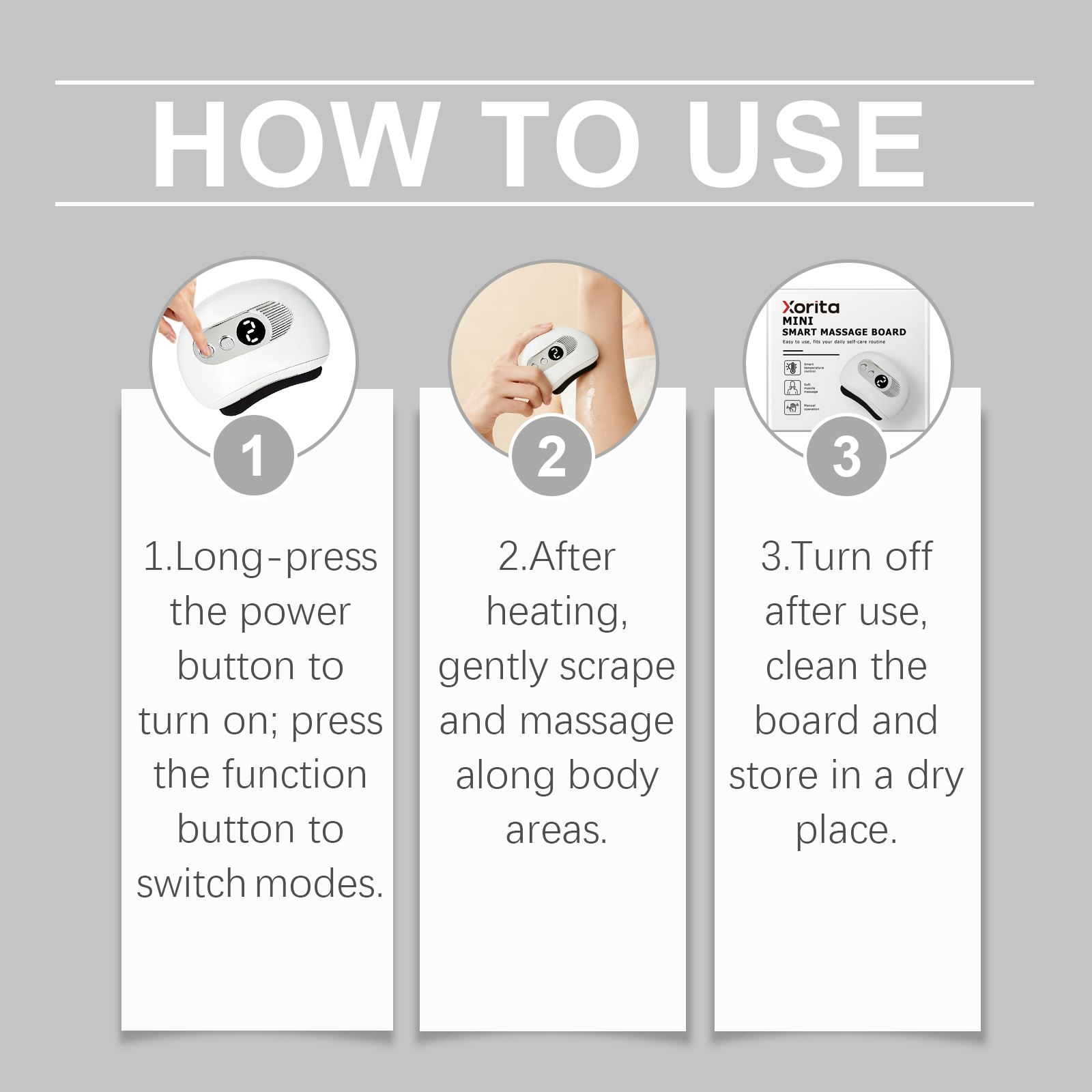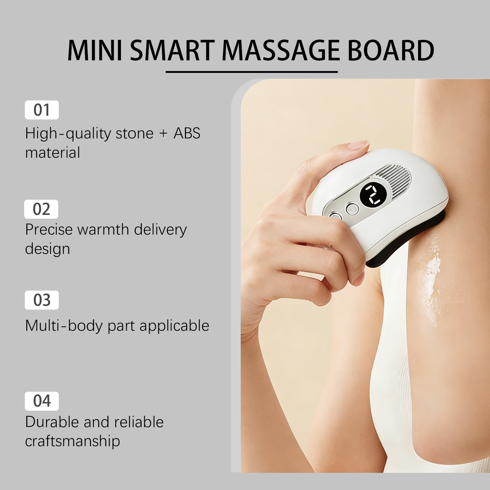我们的迷你智能按摩板,由砭石+ABS精心制作而成。专为身体需求提供专注的舒适感设计。使用方法极为便捷:1.长按电源键开机,按功能键切换模式;2.待加热后,贴合身体轻刮按摩;3.用后关机,清洁刮板后存放干燥处。详情请看说明书。并且它可以无缝贴合各种身体部位,带来舒适体验并温和释放热量,用户友好设计便于随时随地轻松操作。