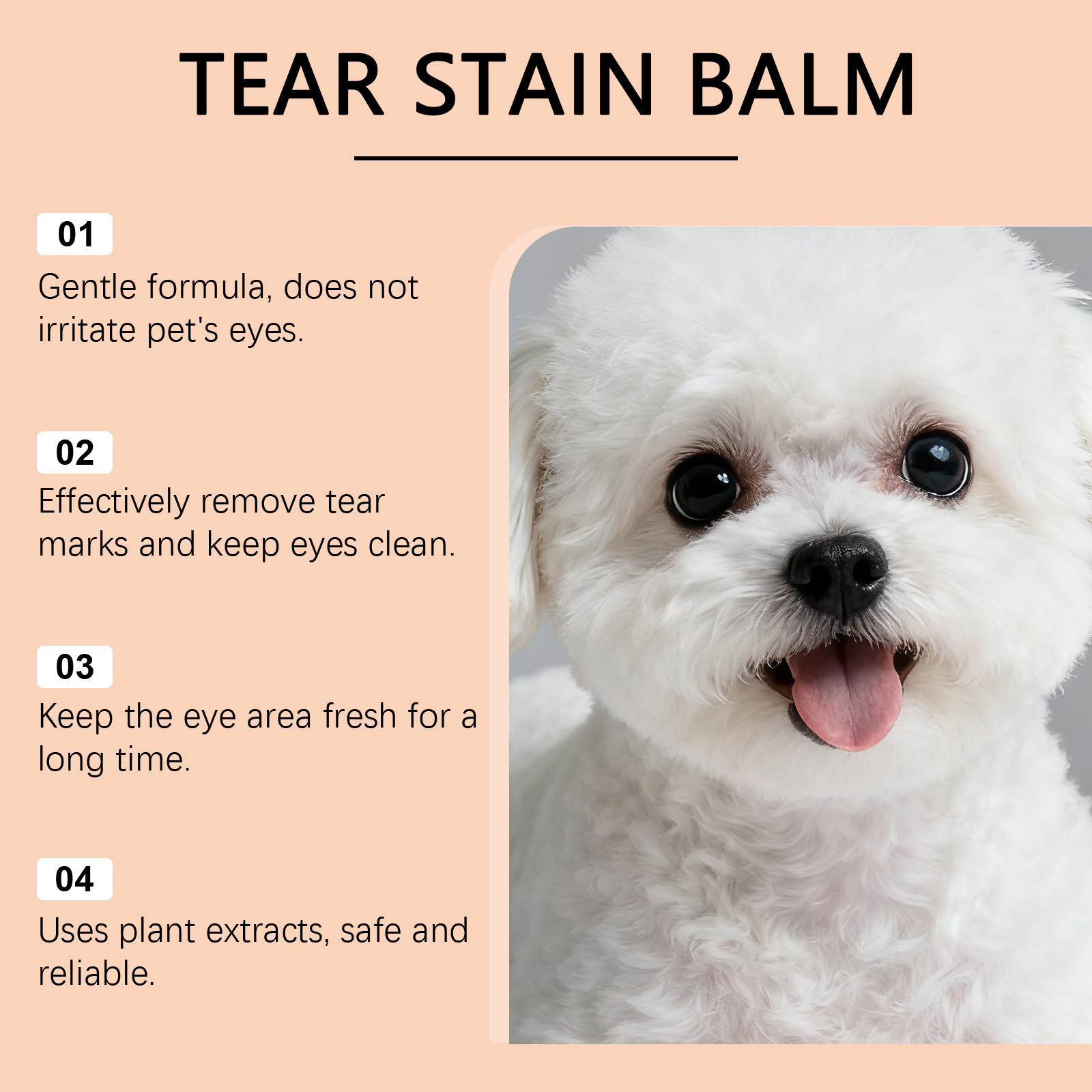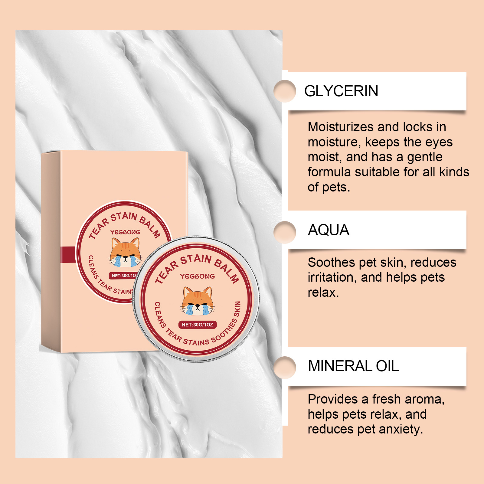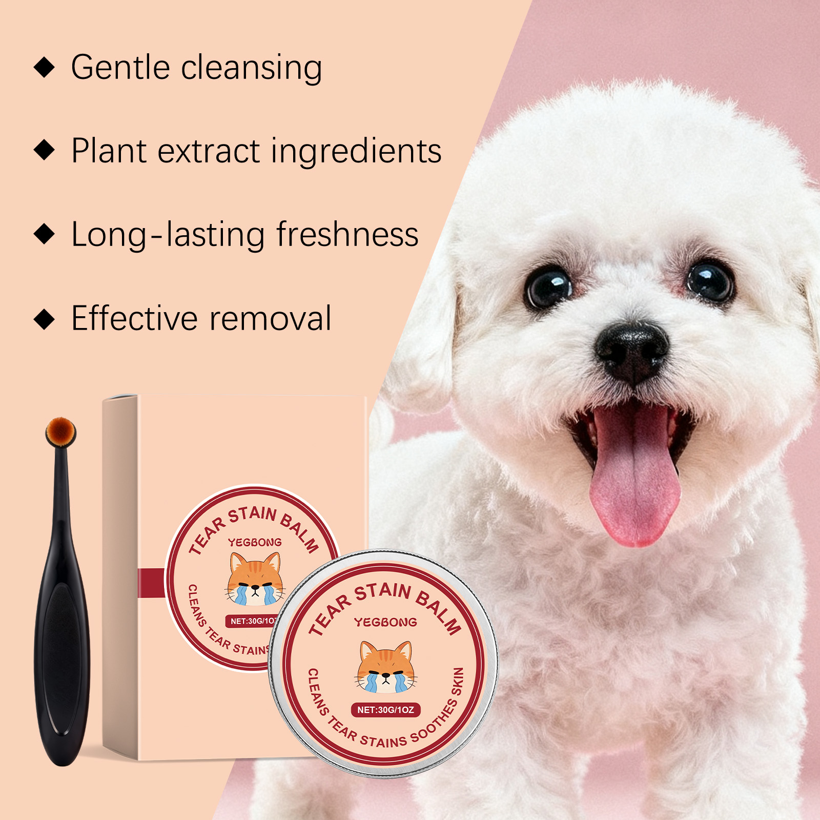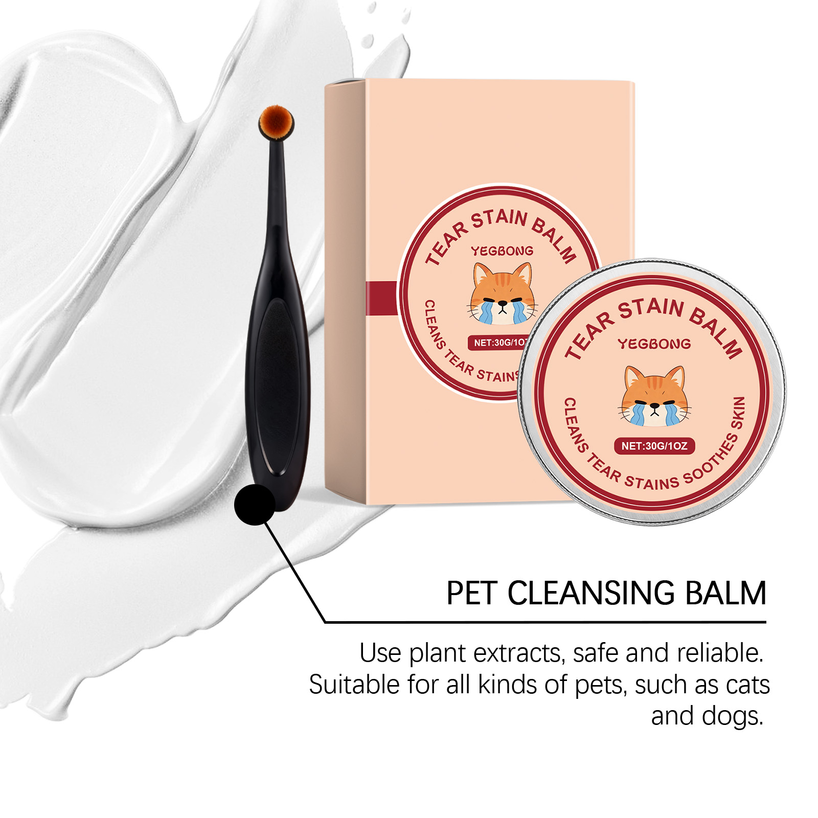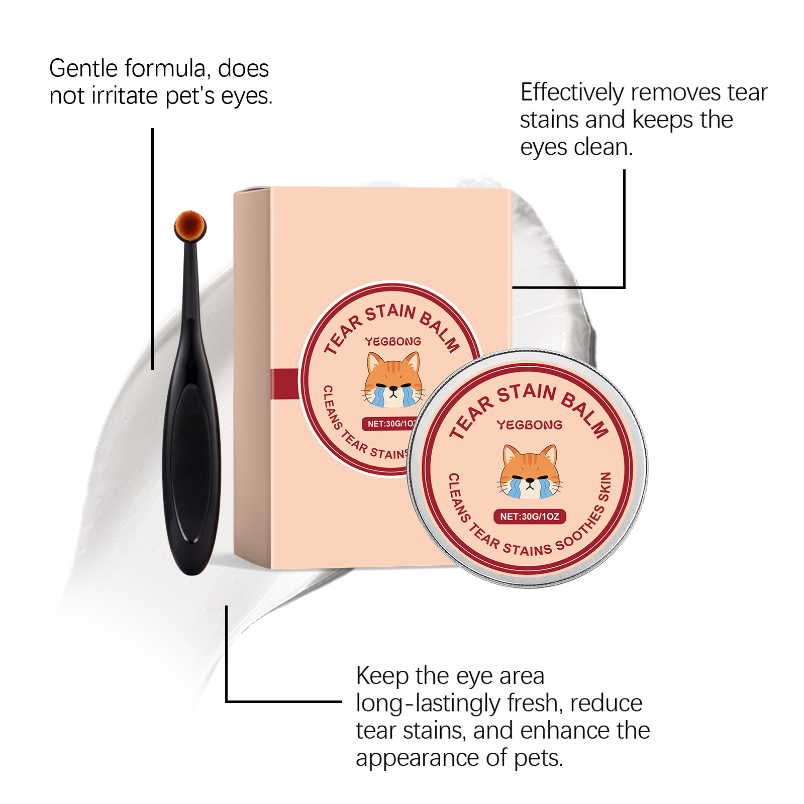 我们的宠物泪痕清洁膏,由矿油、甘油精心调配而成。专为保持宠物眼部周围的皮肤干燥,减少水分,清理眼周的污垢和毛发,并保持整洁设计。使用方法极为便捷:1.用刷子取适量产品,轻轻涂抹在宠物的眼泪污渍上,并来回轻柔地刷拭。2.每日使用,直至症状改善。避免与宠物眼睛直接接触。并且它可以预防和缓解色素沉着,减少泪痕,隔离眼部周围积聚的分泌物,并保持清洁。
