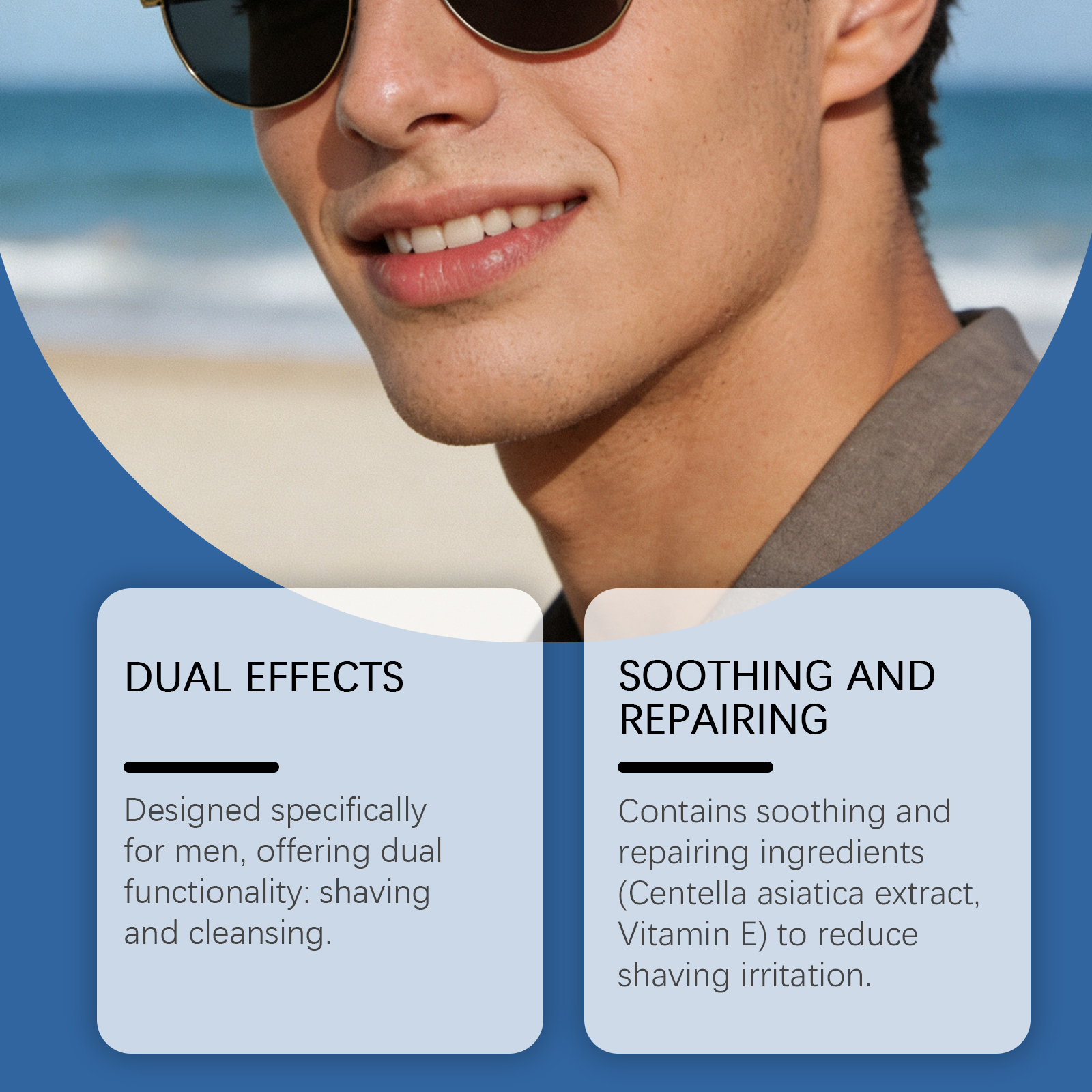 我们的男士剃须洁面棒,由蜂蜡、矿脂精心调配而成。专为男性设计,提供剃须和清洁双重功能。使用方法极为便捷:旋转以挤出适量产品,并均匀涂抹于剃须区域。用适量的水湿润涂抹区域。按摩产生泡沫,然后用剃须刀刮胡。剃完后,用水彻底冲洗干净。并且含有舒缓和修复成分,以减少剃须刺激。