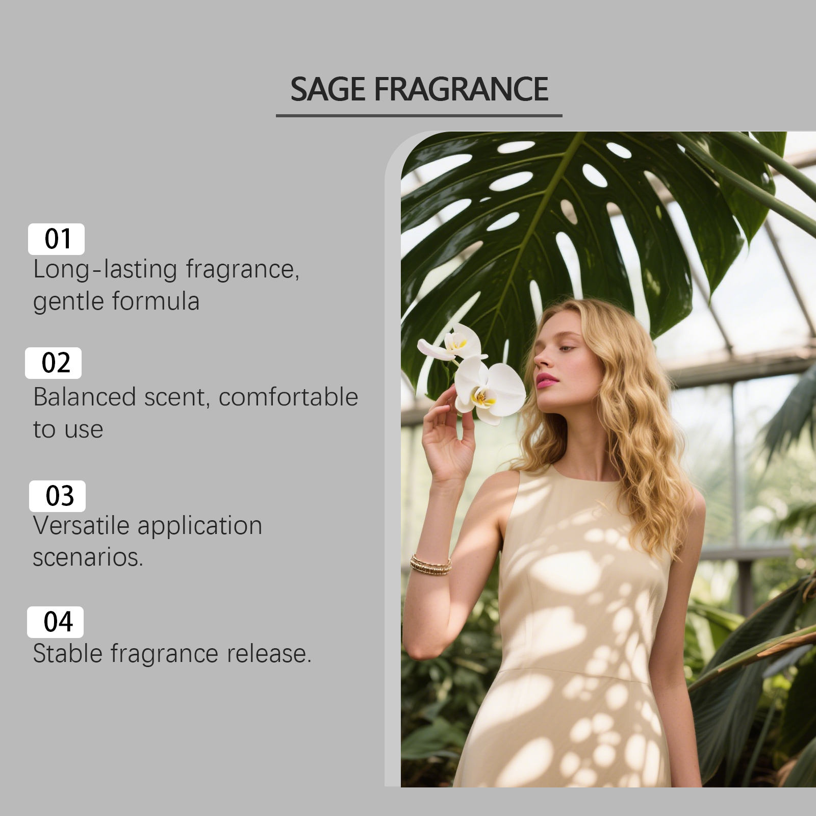 我们的馥郁质感香水(鼠尾草),由丙二醇、甘油精心调配而成。专为持久留香,温和肌肤香氛设计。使用方法极为便捷:将适量本产品均匀喷洒在手腕、耳后、颈部以及其他想要留香的部位,即可散发迷人香气。并且它可以清新香氛体验,平衡的香味释放。