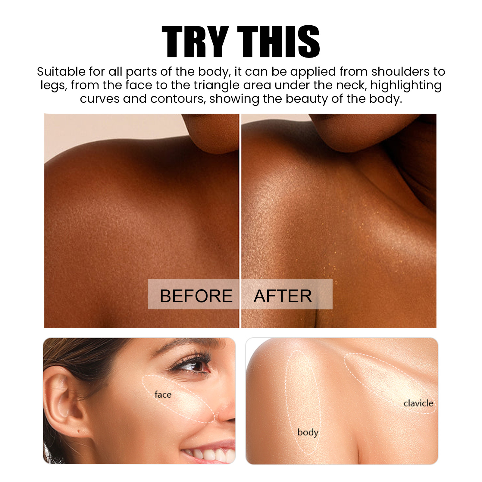 我们的身体闪光喷雾含有闪粉,马齿苋提取物,绿茶提取物。它可以将喷雾喷洒在皮肤上,产生发光效果,使皮肤明亮,提亮肌肤,适用于身体的各个部位,从肩部到腿部,从脸部到颈部下的三角区域都可以涂抹,突出曲线和轮廓,展现身材之美。它的使用方法很简单:清洁和干燥身体皮肤,在距离皮肤10-15厘米处按压喷雾,用化妆刷均匀涂抹闪粉。喷雾轻而不油腻,可以覆盖更大的身体区域,轻松方便地改变造型;含有多种植物成分和保水性成分,能收集和保留肌肤水分,增加肌肤水分含量,令肌肤更加水润柔软。